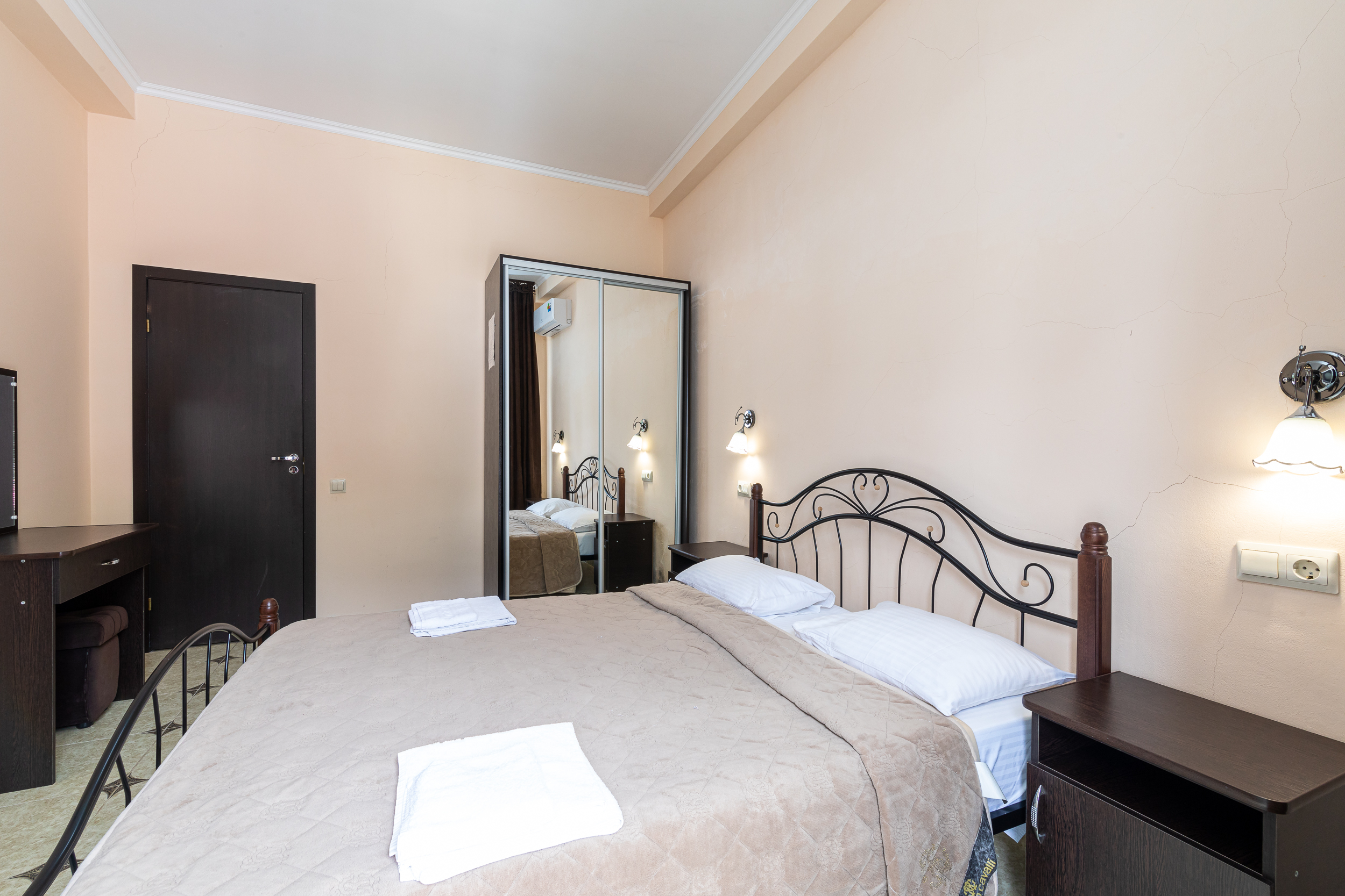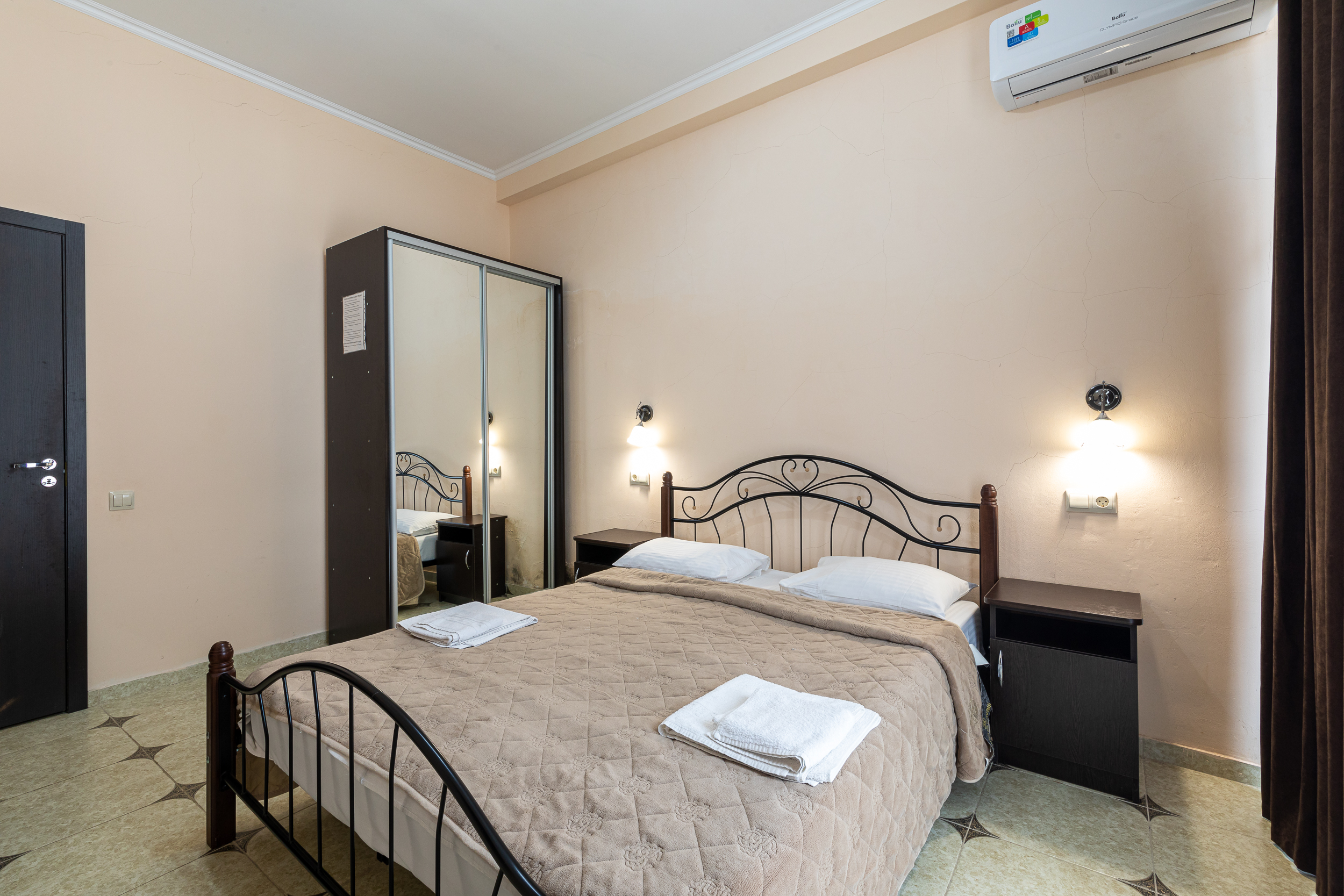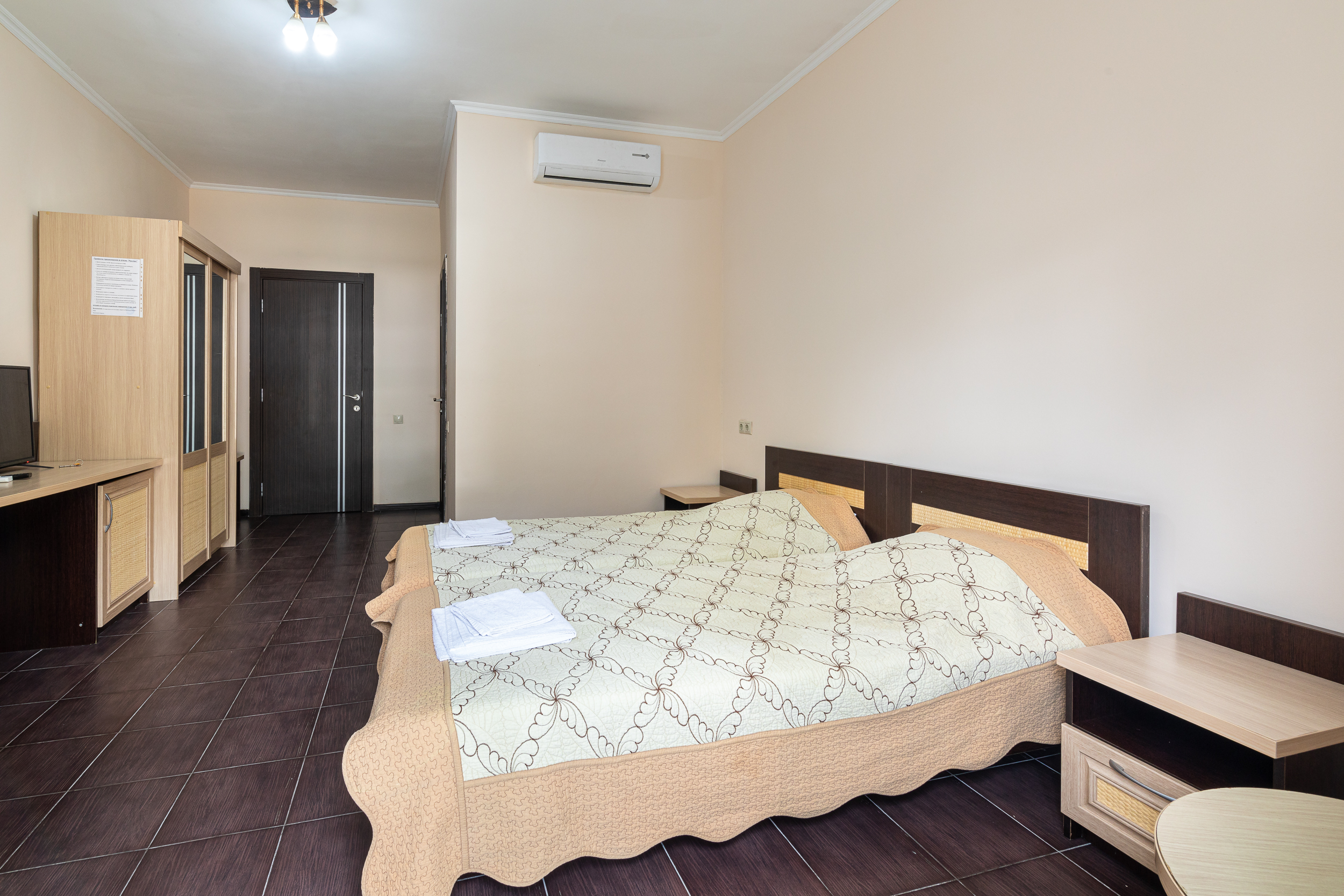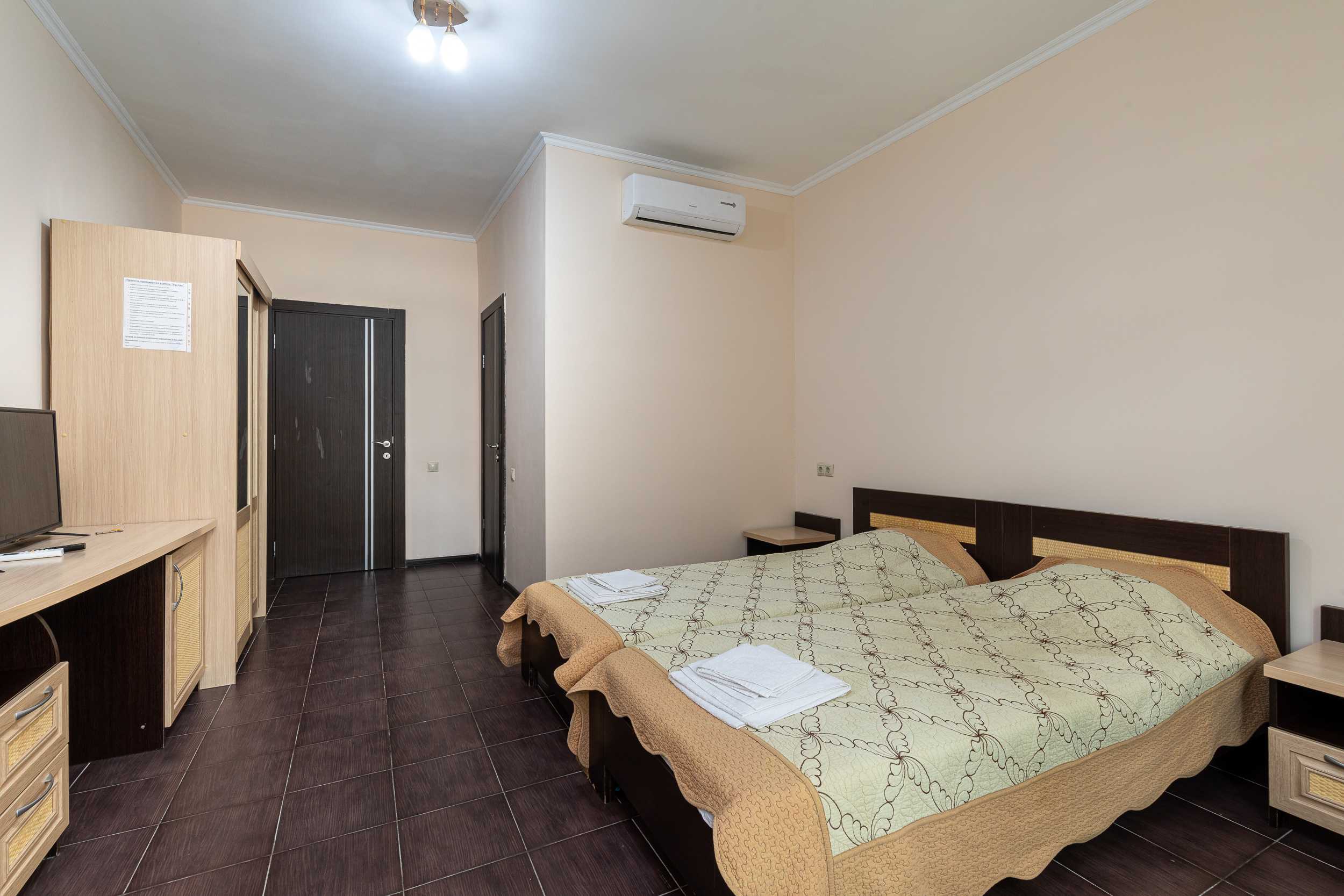 В номере: вешалка, зеркало, кресла, кровати односпальные /одна двуспальная кровать, прикроватные тумбочки, стол, шкаф, кондиционер, телевизор, холодильник