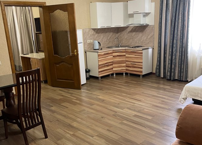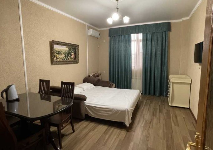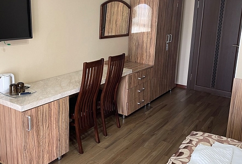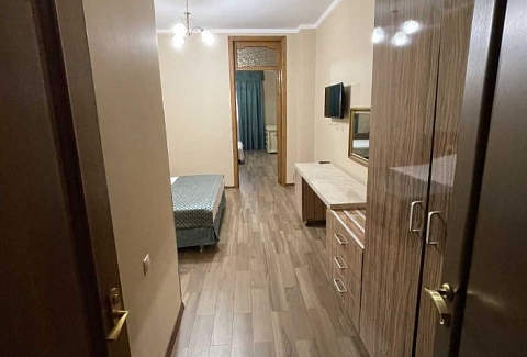 В номере: вешалка, диван раскладной, зеркало, кровать двуспальная, прикроватные тумбочки, стол, стулья, шкаф, кондиционер, мини-холодильник, сейф, телевизор ЖК, чайный набор посуды, электрочайник
