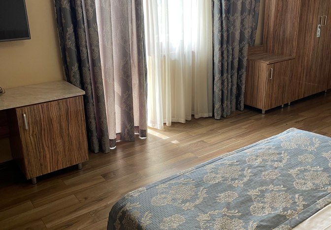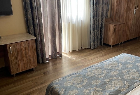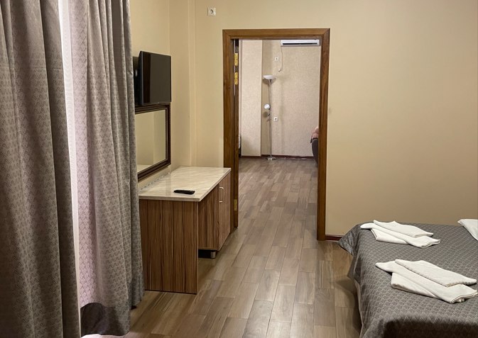 В номере: вешалка, диван, зеркало, кровать двуспальная, прикроватные тумбочки, стол, стулья, шкаф, кондиционер, мини-холодильник, сейф, телевизор ЖК, чайный набор посуды, электрочайник