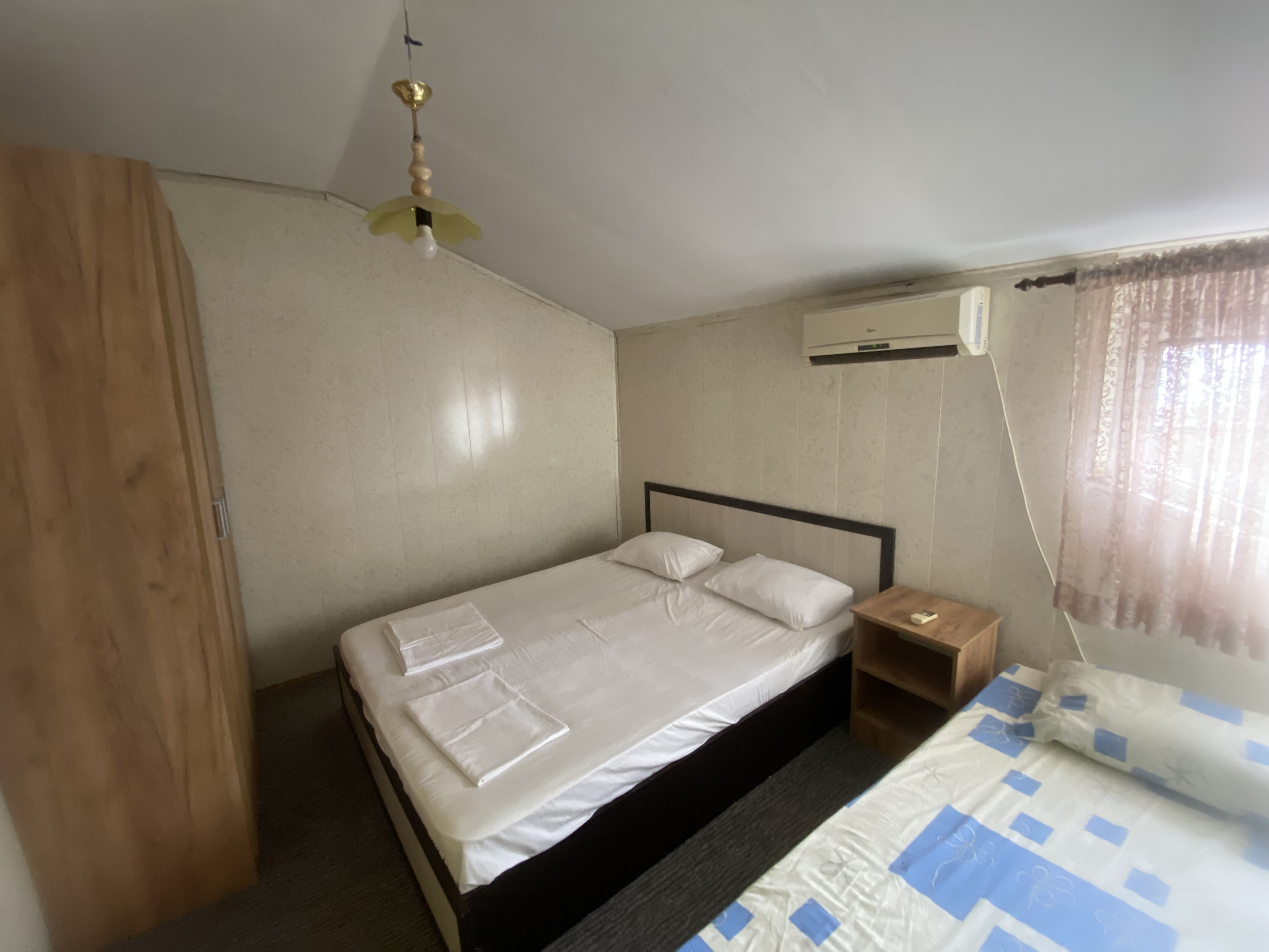 Гостиница представляет собой трехэтажный коттедж, способный разместить около 30 человек. Номера жилого фонда категорий «стандарт» снабжены санузлами с душем, для класса «эконом» удобства находятся на этаже. Все номера оборудованы кондиционерами и телевизорами, отдельные холодильники есть в «стандартах», а для «экономов» – также на этаже. Есть мангальная зона для шашлыков во дворе. Дорога к морю отнимает 5 -7 минут и проходит по тенистому Парку Славы или улочке, наполненной магазинчиками и кафе. Кроме ближайшего общественного пляжа, рядом немало пляжей пансионатов и гостиниц, которые можно посещать по договоренности. На берегу работают пункты проката и кафе, есть водные аттракционы для детей и взрослых.