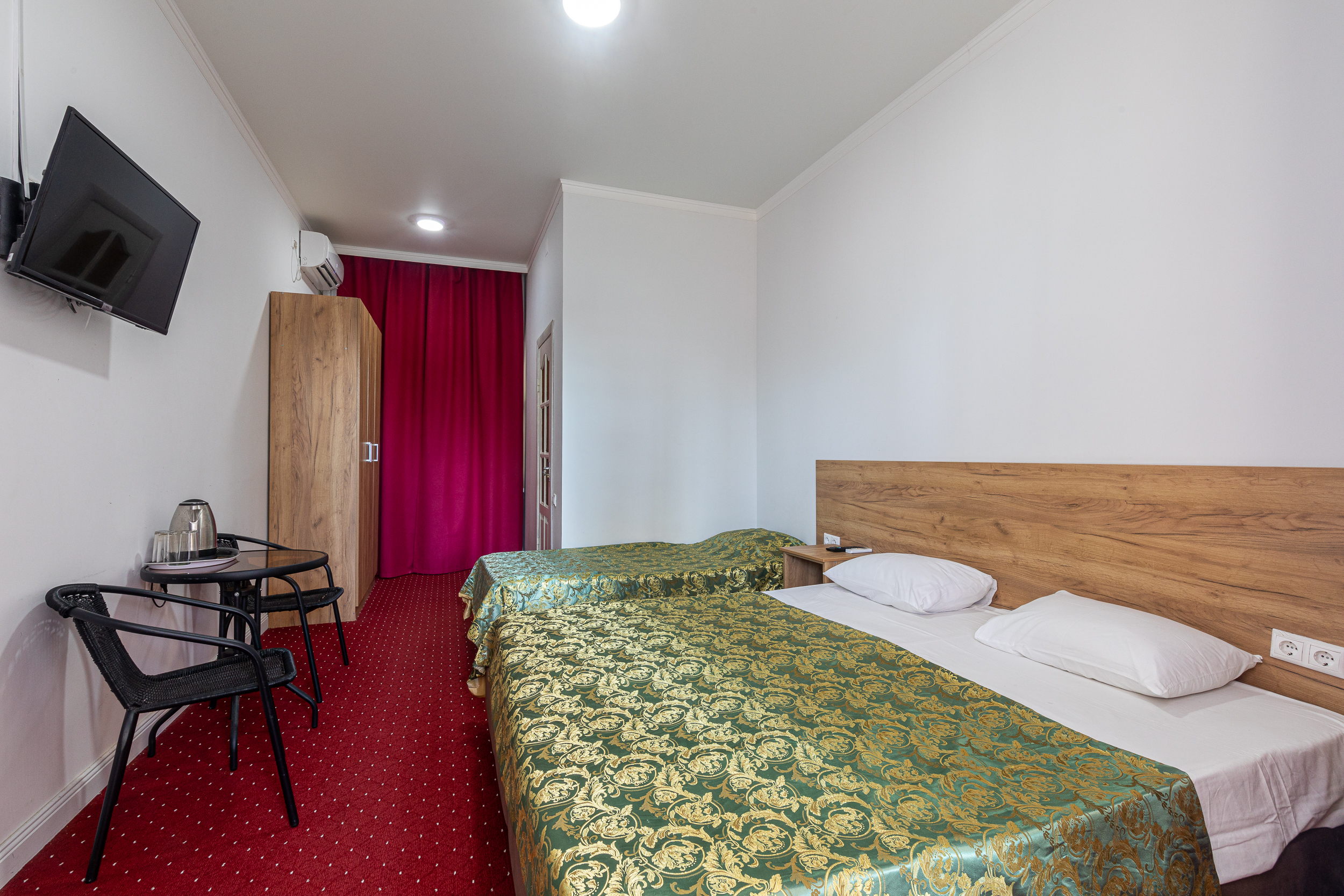 В номере: вешалка, зеркало, кровати односпальные /одна двуспальная кровать, прикроватные тумбочки, стол, стул, шкаф, кондиционер, телевизор, холодильник