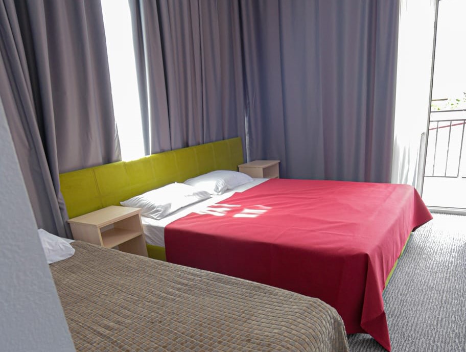 В номере: вешалка, зеркало, кровать двуспальная, кровать двухъярусная, прикроватные тумбочки, стол, стулья, шкаф, кондиционер, телевизор, холодильник, электрочайник