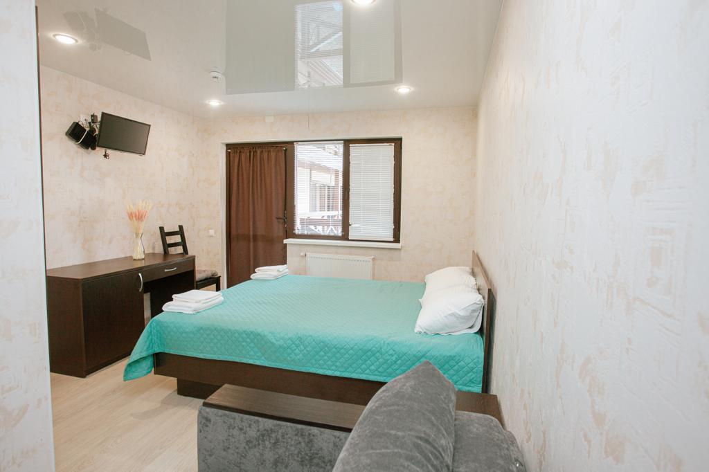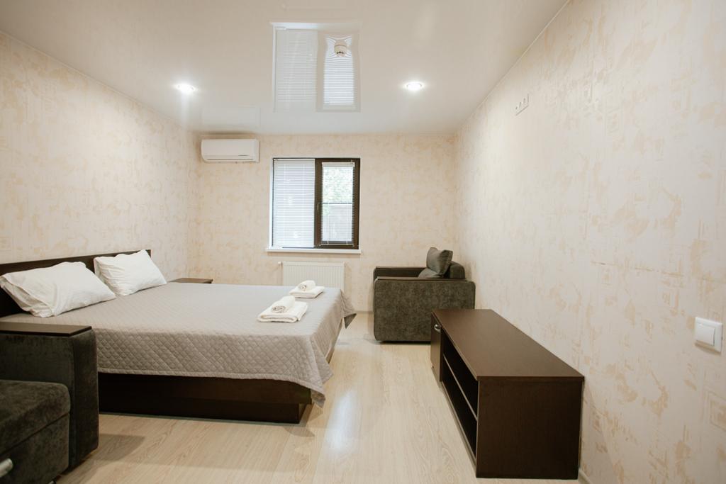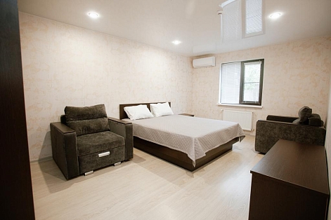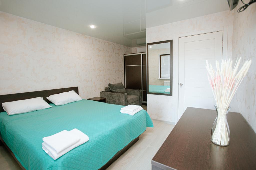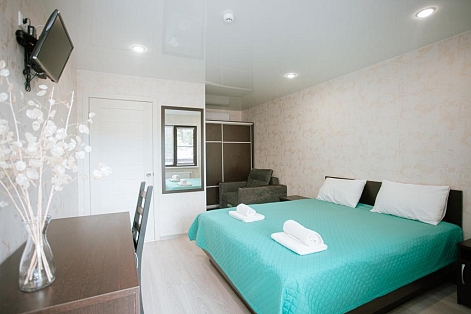 В номере: вешалка, диван раскладной, зеркало, кресло-кровать, кровать двуспальная, прикроватные тумбочки, стол, столик журнальный, стул, шкаф, кондиционер, телевизор, холодильник, электрочайник