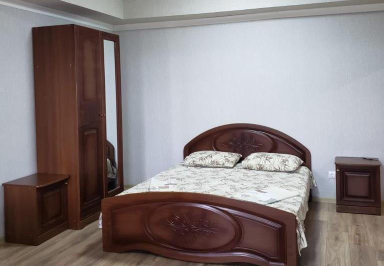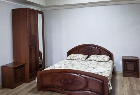 В номере: вешалка, диван раскладной, зеркало, кровать двуспальная, прикроватные тумбочки, стол, стулья, шкаф, гладильная доска, кондиционер, телевизор, утюг, холодильник, электрочайник