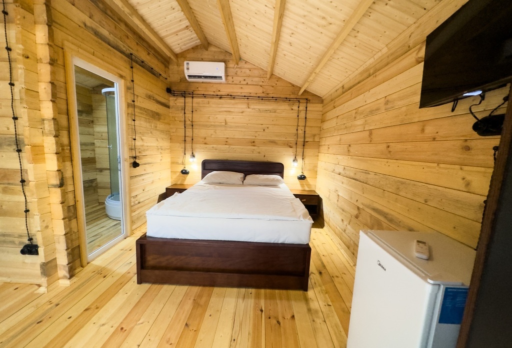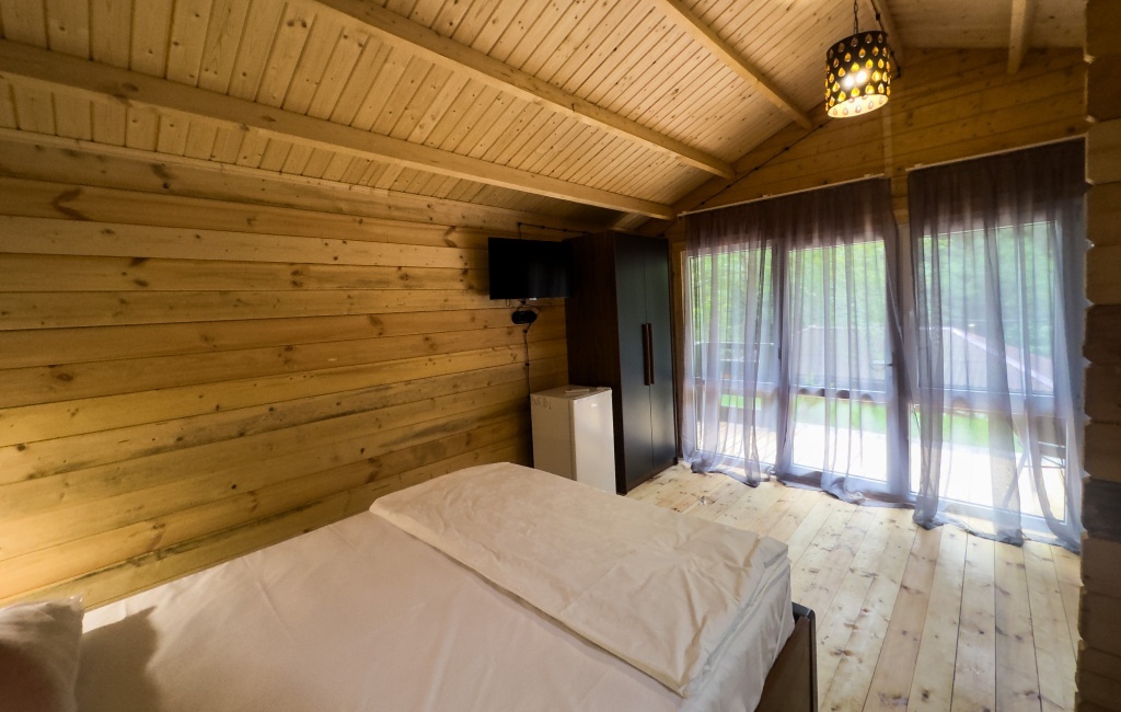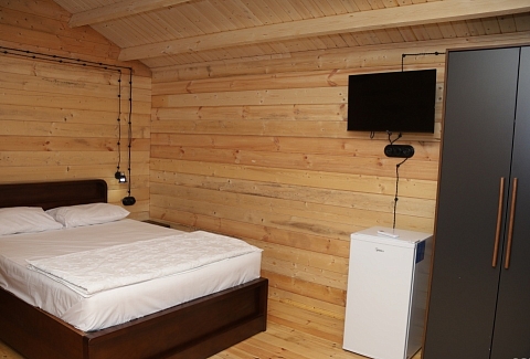 В номере: вешалка, зеркало, кровать двуспальная, прикроватные тумбочки, стол, стул, шкаф, кондиционер, мини-холодильник, телевизор