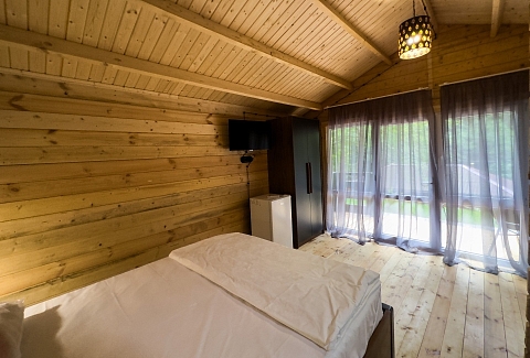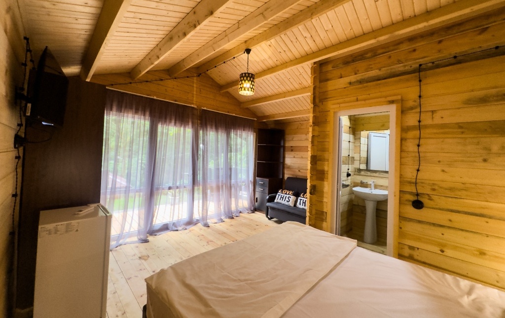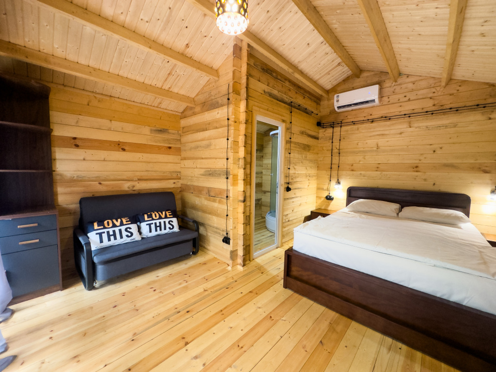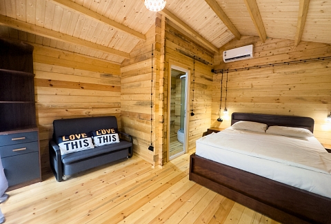 В номере: вешалка, диван, зеркало, кровать двуспальная, прикроватные тумбочки, стол, стул, шкаф, кондиционер, мини-холодильник, телевизор