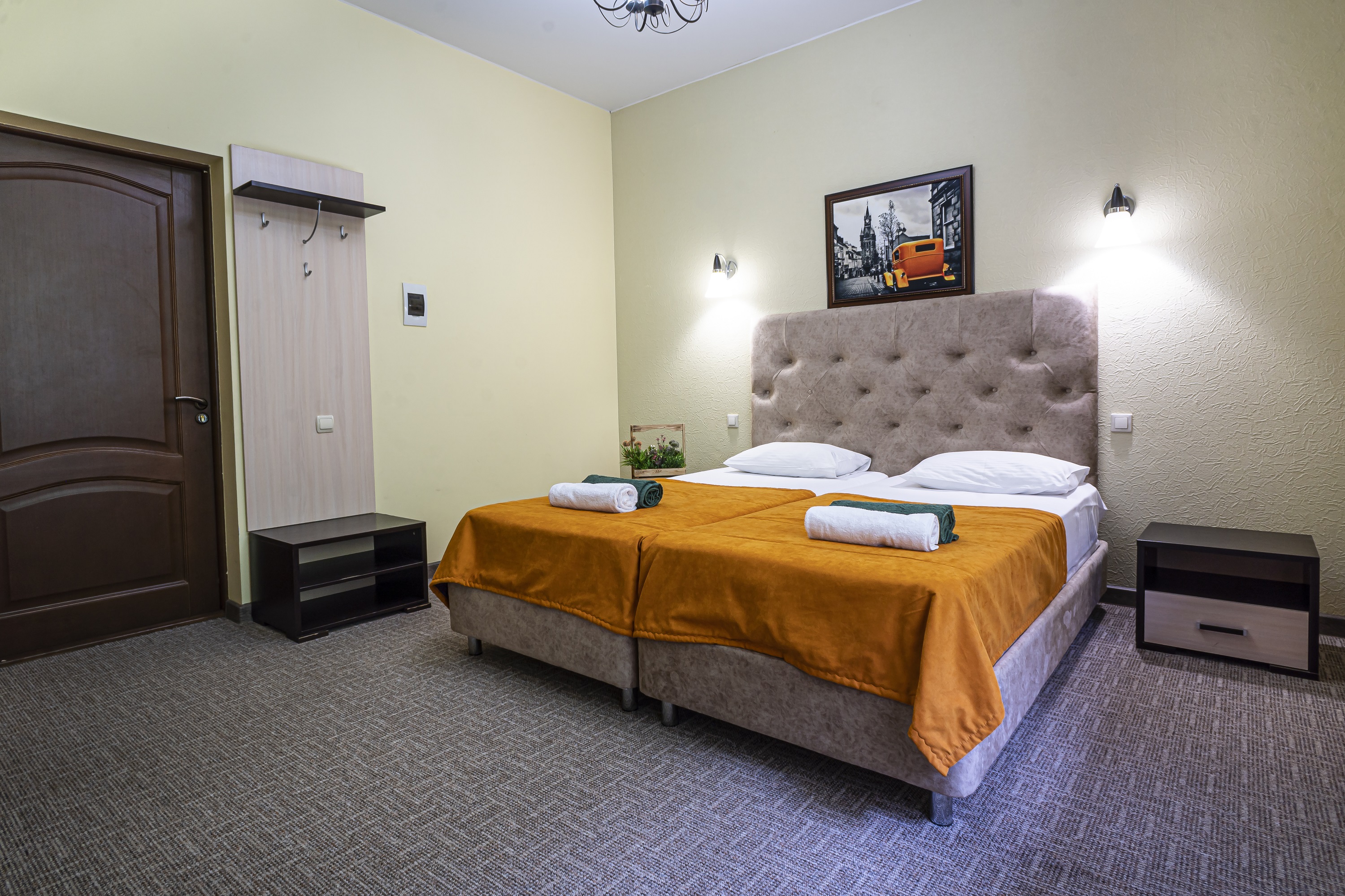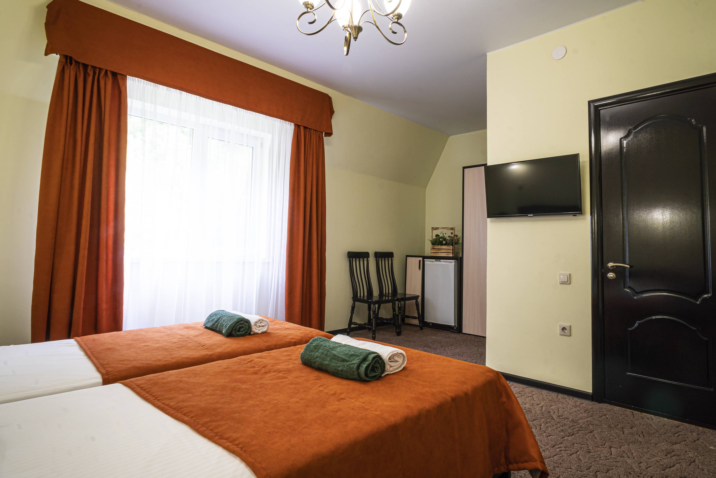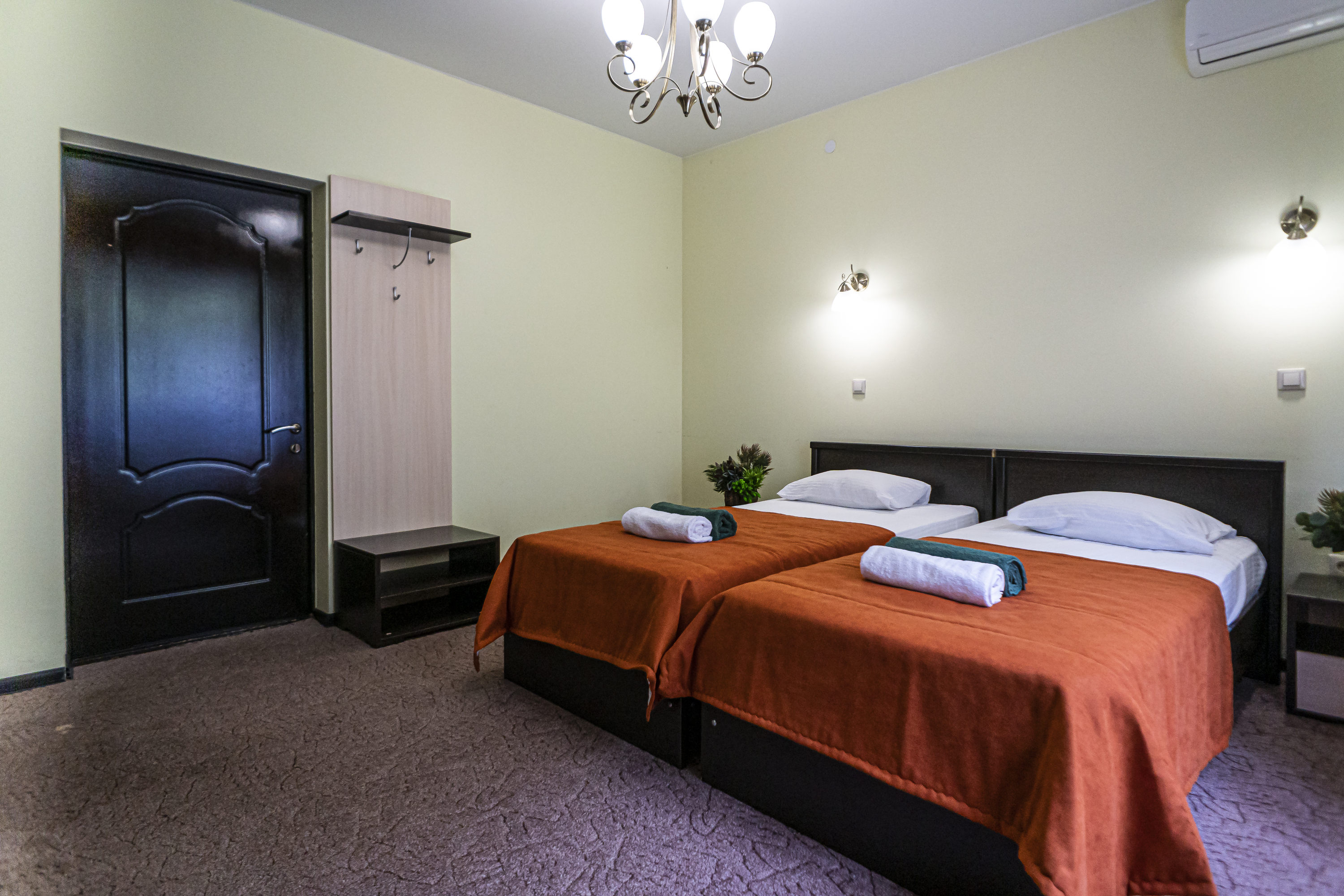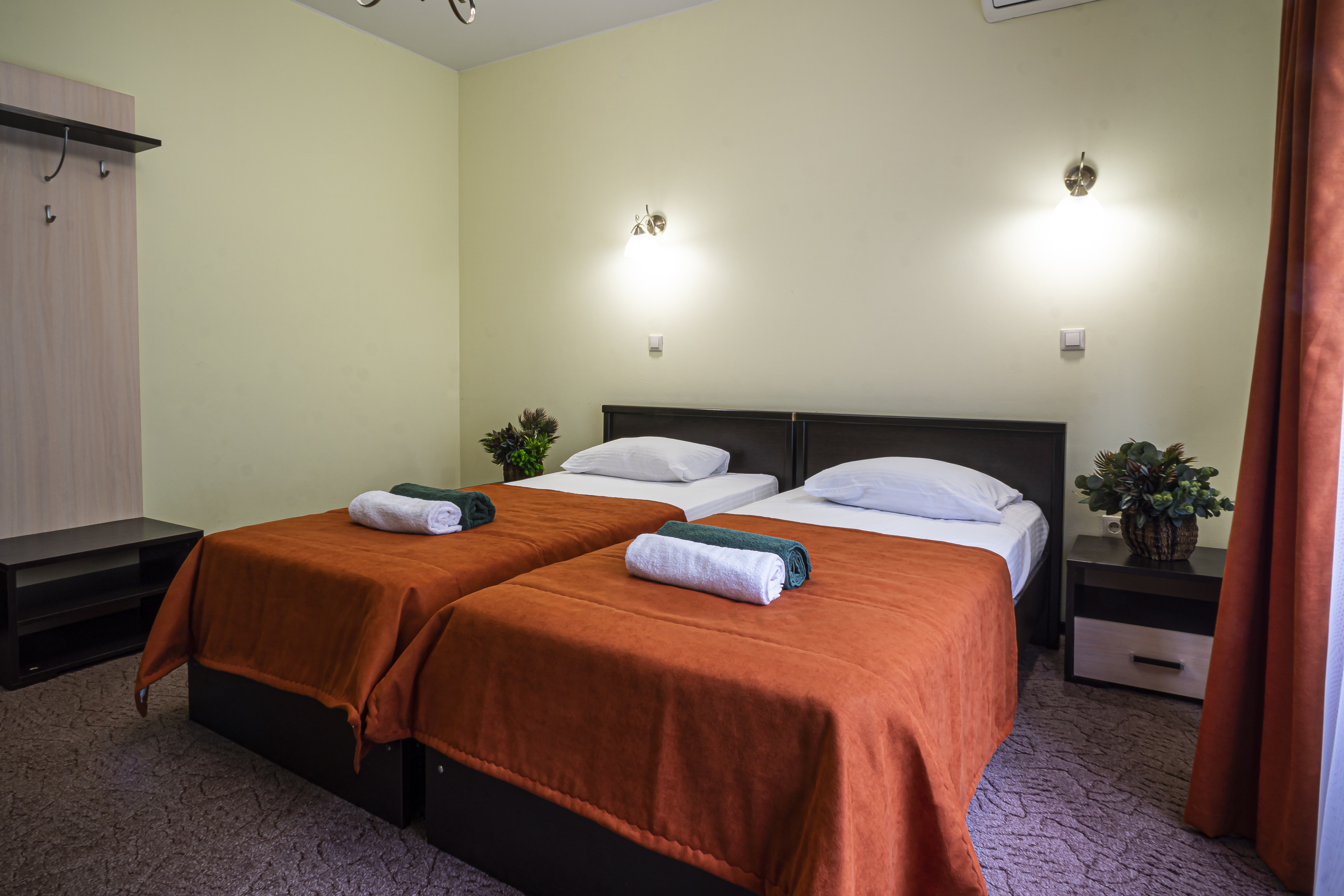 В номере: вешалка, зеркало, кровати односпальные, прикроватные тумбочки, стол, стулья, шкаф, сплит-система, телевизор, холодильник