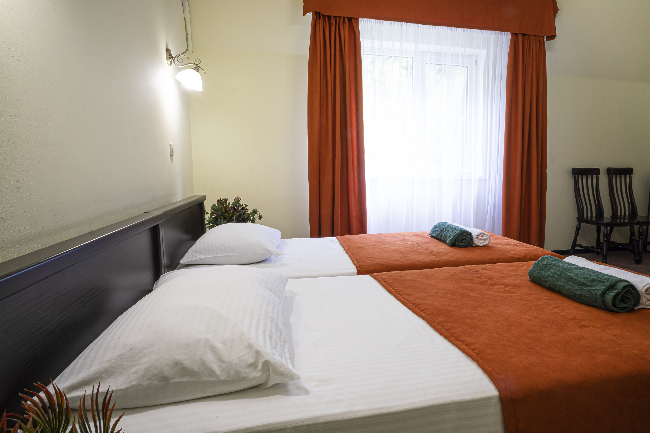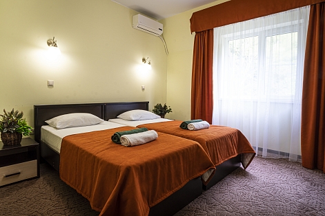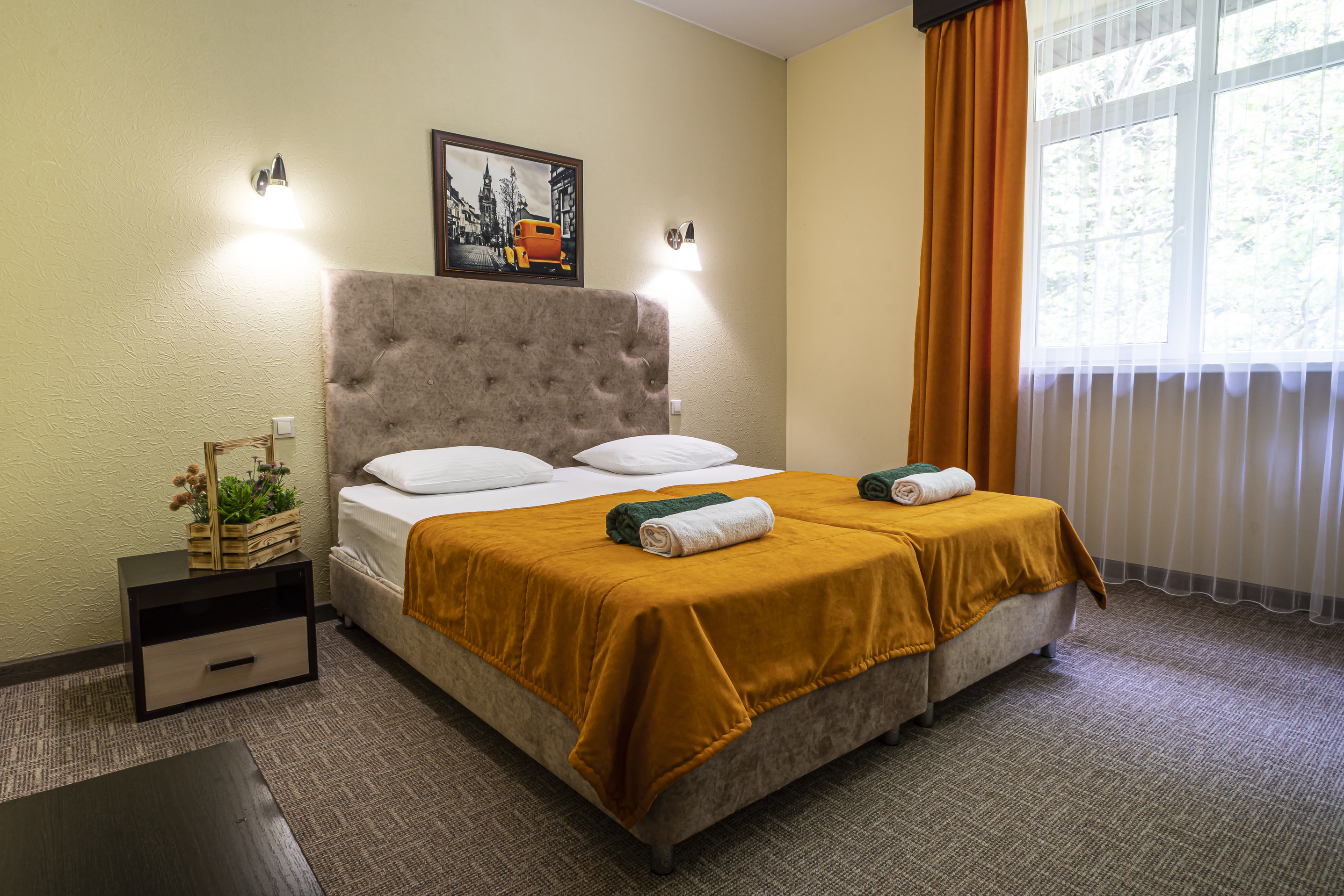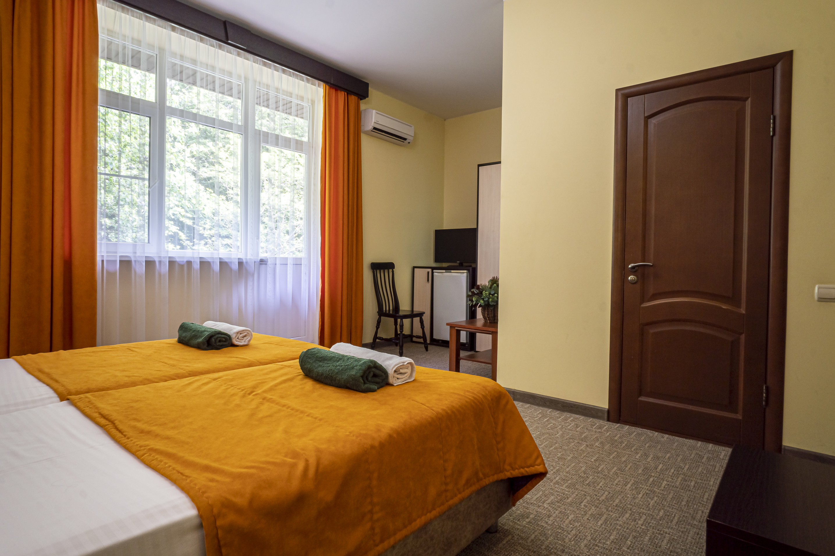 В номере: вешалка, зеркало, кровати односпальные, прикроватные тумбочки, стол, стулья, шкаф, сплит-система, телевизор, холодильник