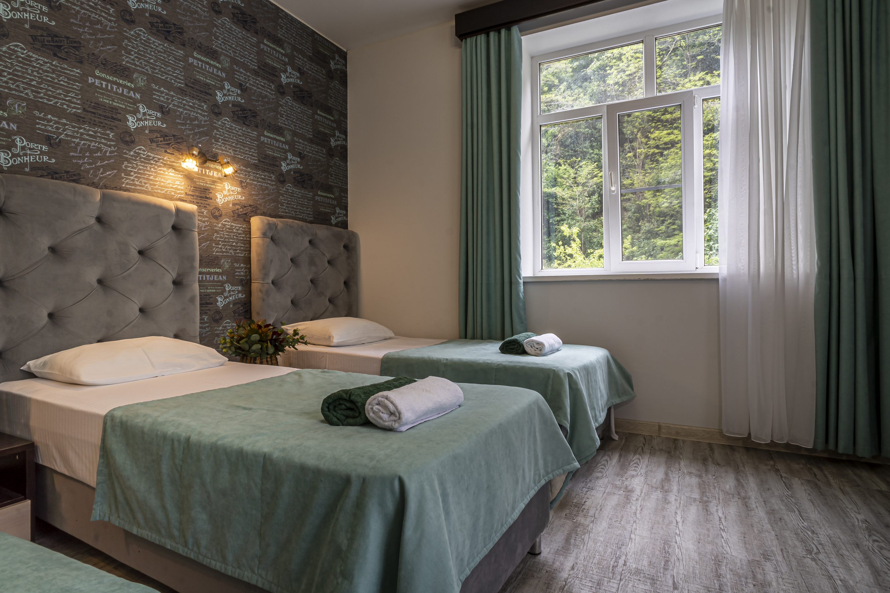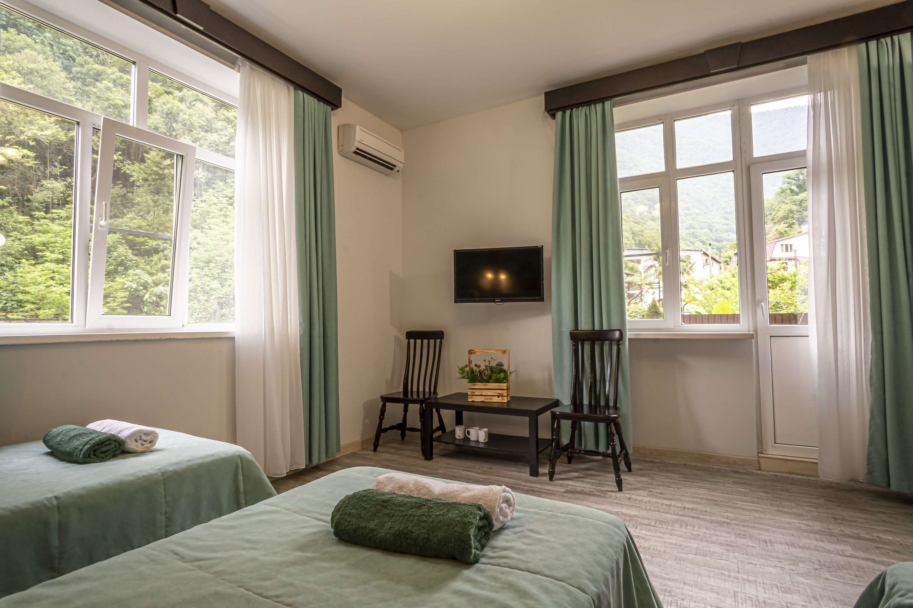 Отель «Вилла Леона» принимает гостей в Гагрипшском ущелье Гагры – уединенном месте, где прохладно даже в знойные дни. Черное море плещется всего в 300 метрах от здания гостиницы. Неподалеку от него находятся известнейшие старинные достопримечательности города: храм Святого Ипатия в крепости Абаата, замок принца Ольденбургского, Колоннада 1911 года постройки, знаменитый ресторан «Гагрипш».