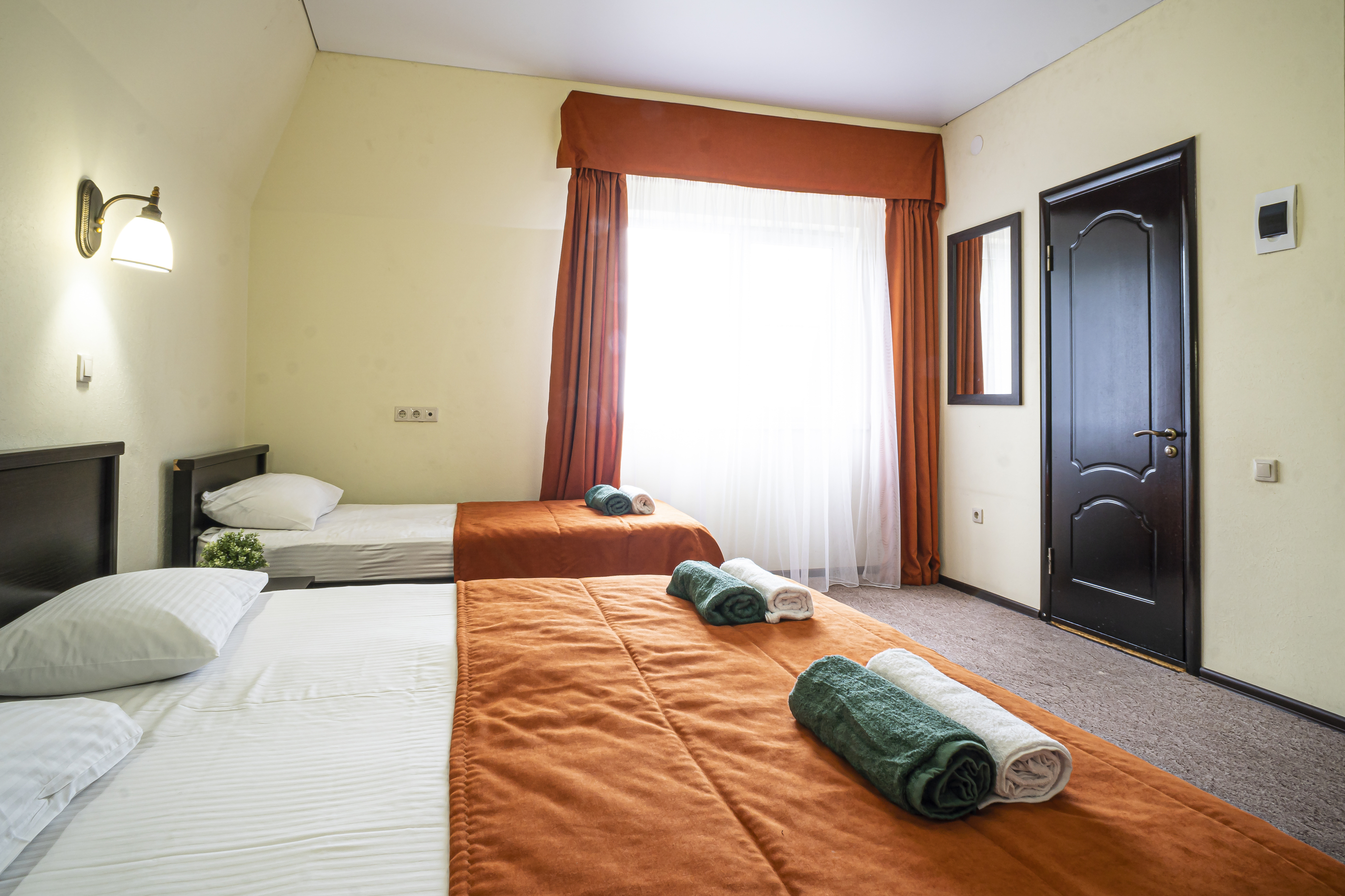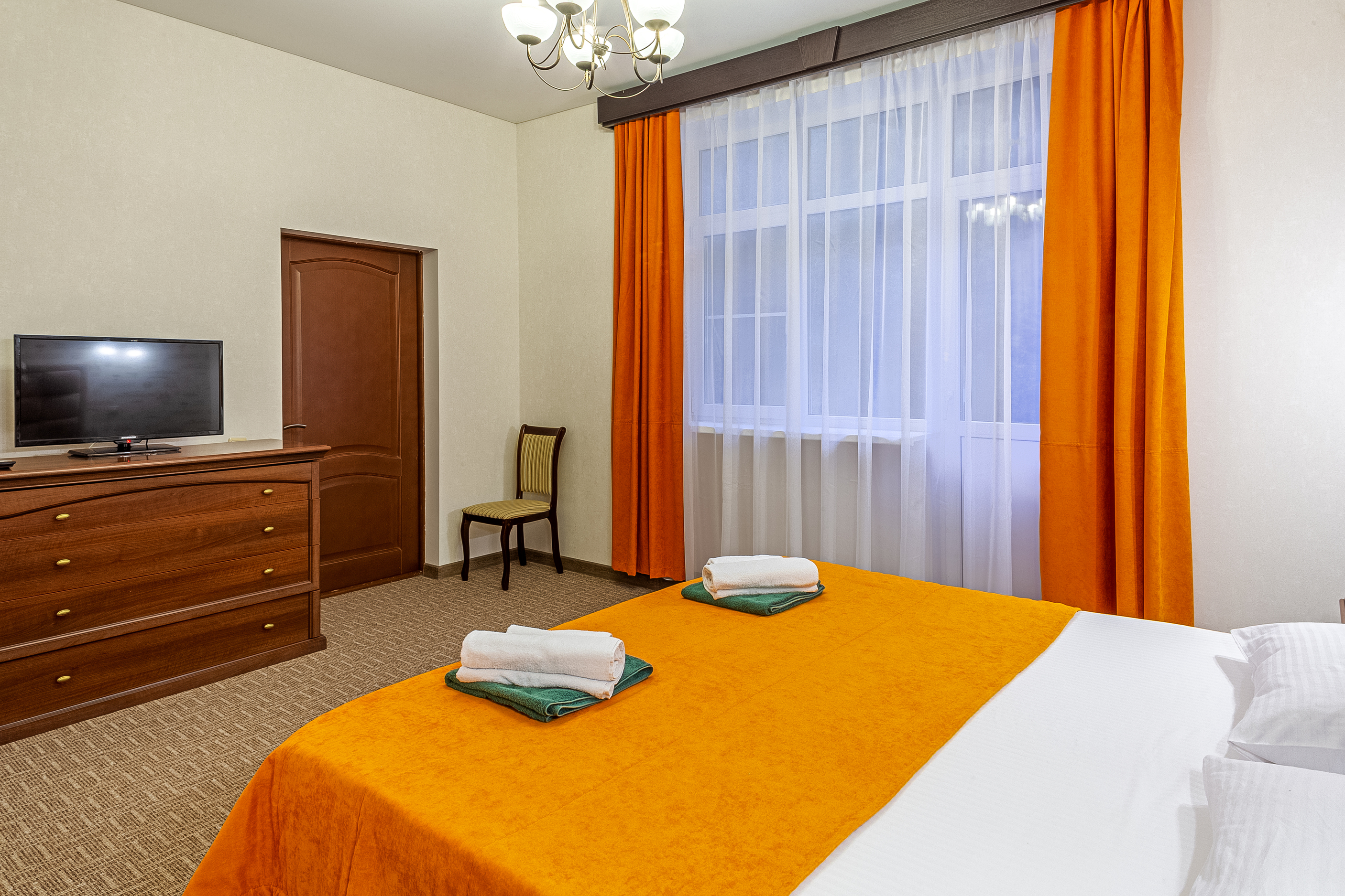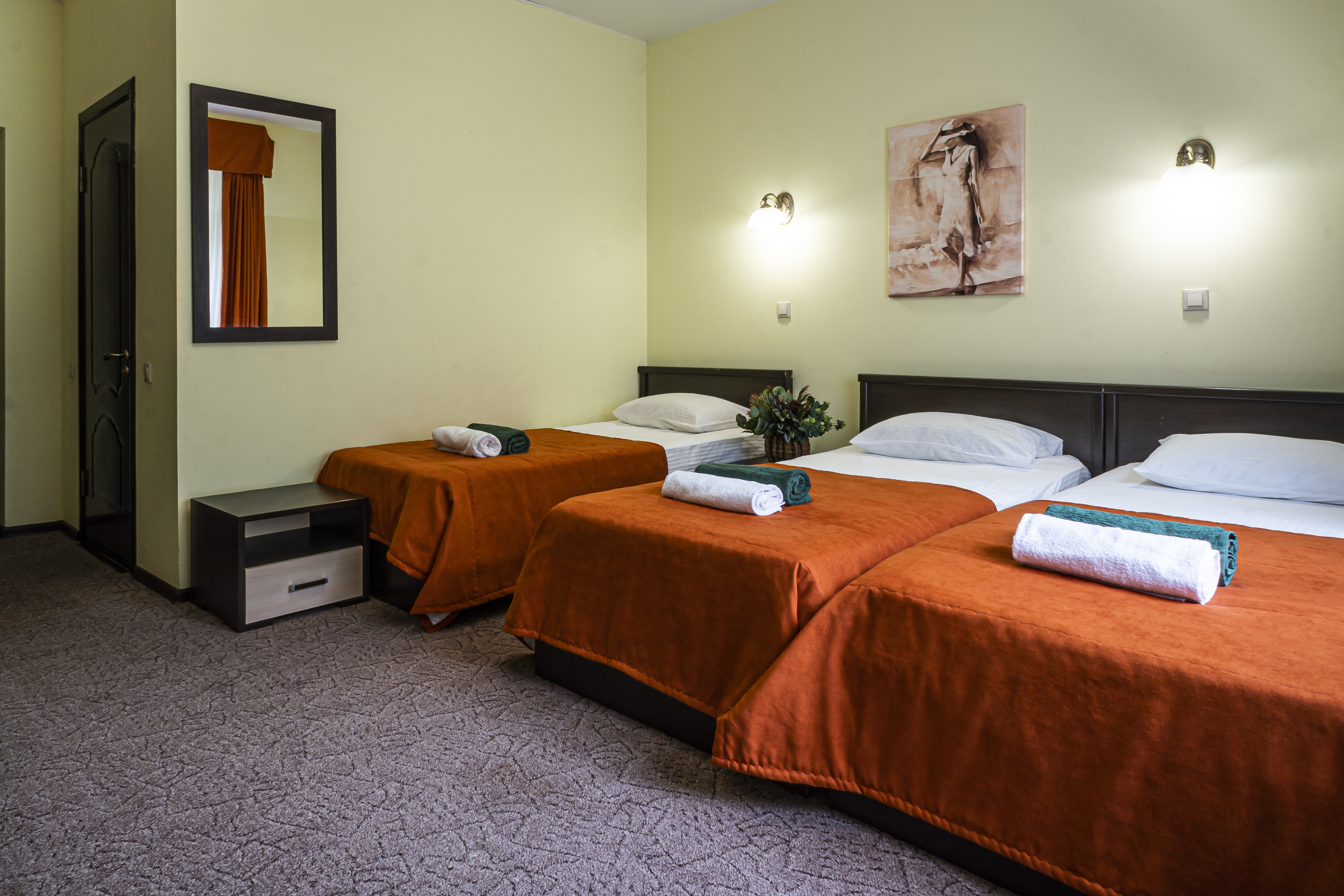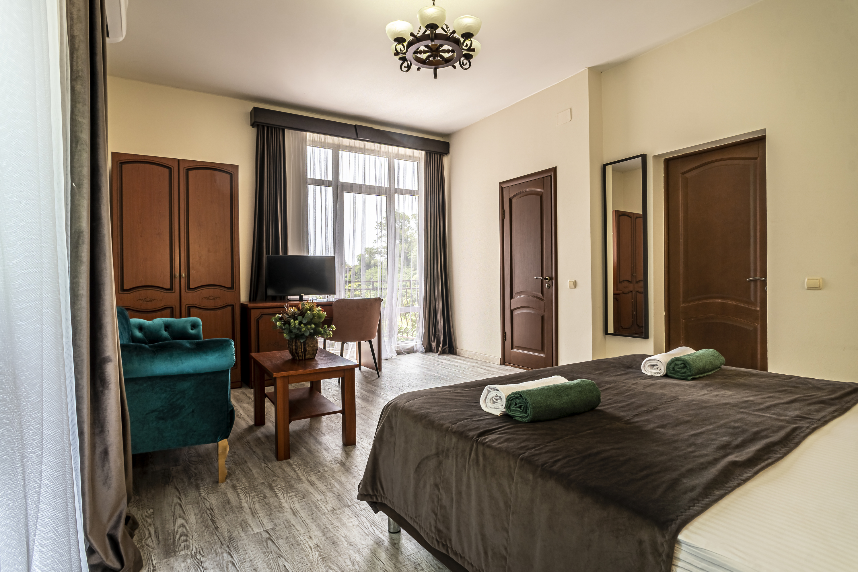 В номере: вешалка, зеркало, кресла, кровати односпальные /одна двуспальная кровать, кровать односпальная, прикроватные тумбочки, стол, шкаф, сплит-система, телевизор, холодильник