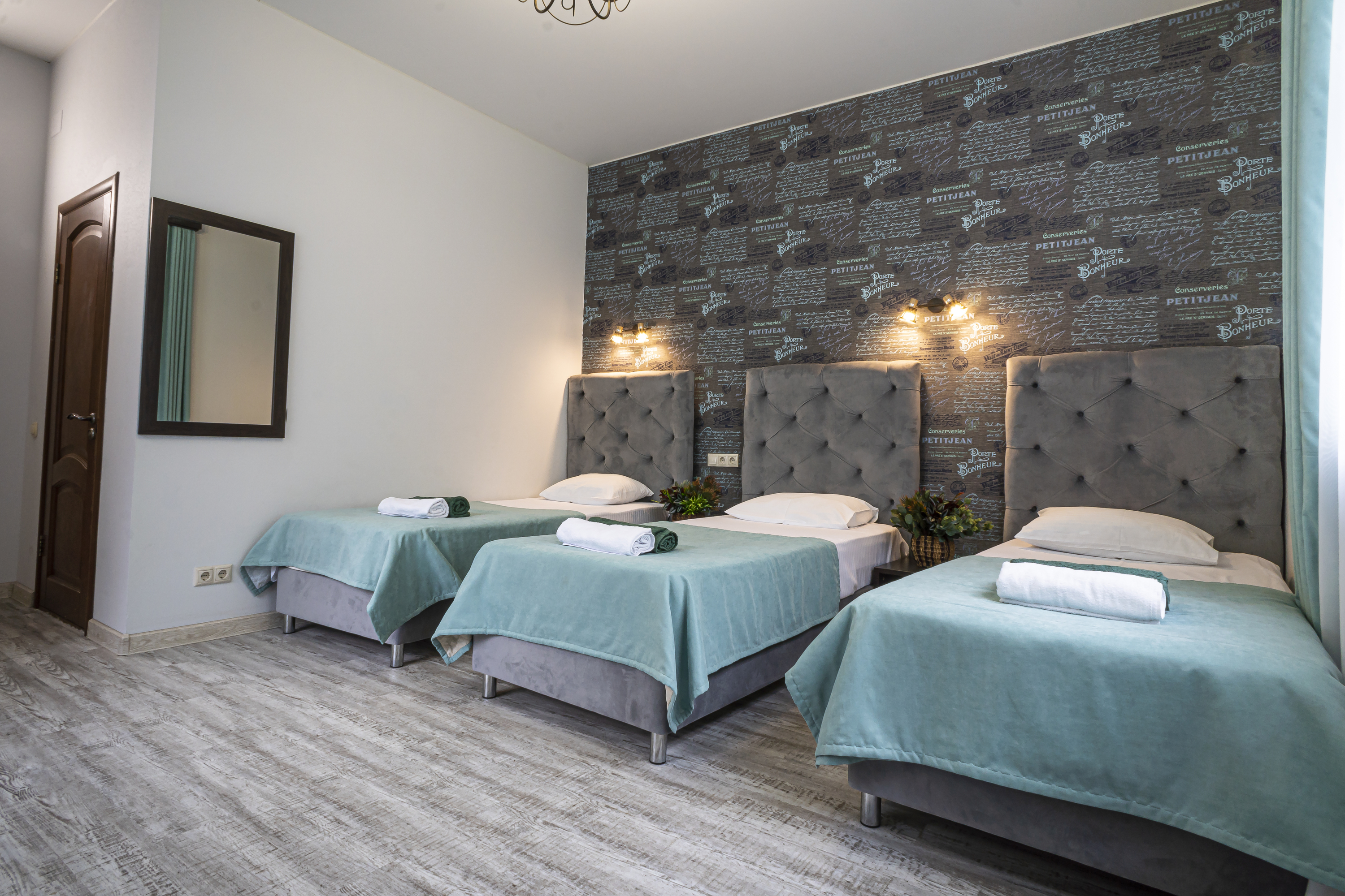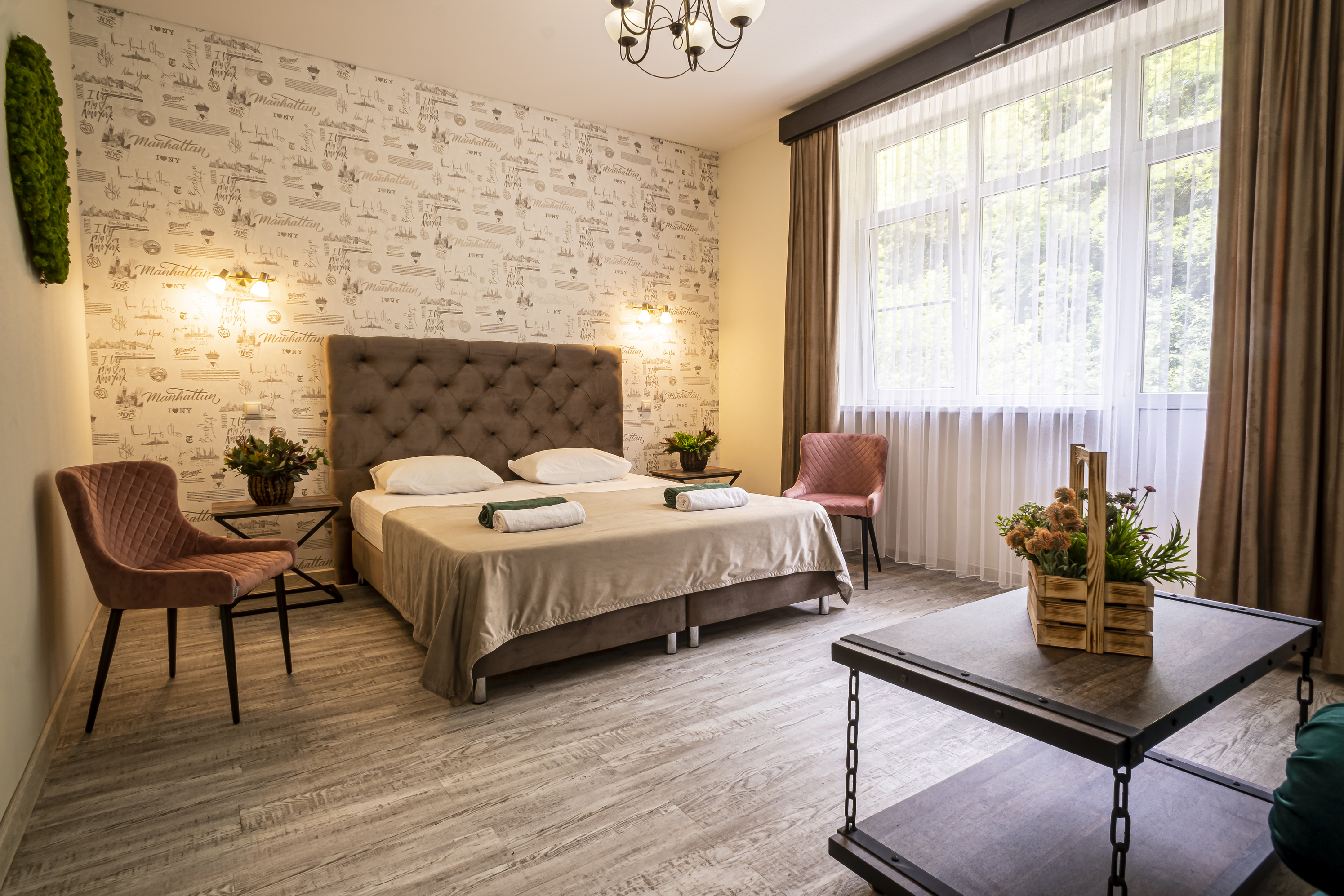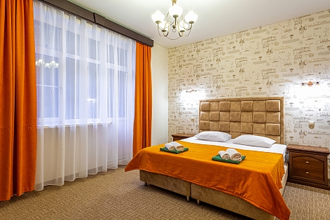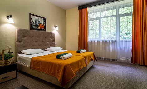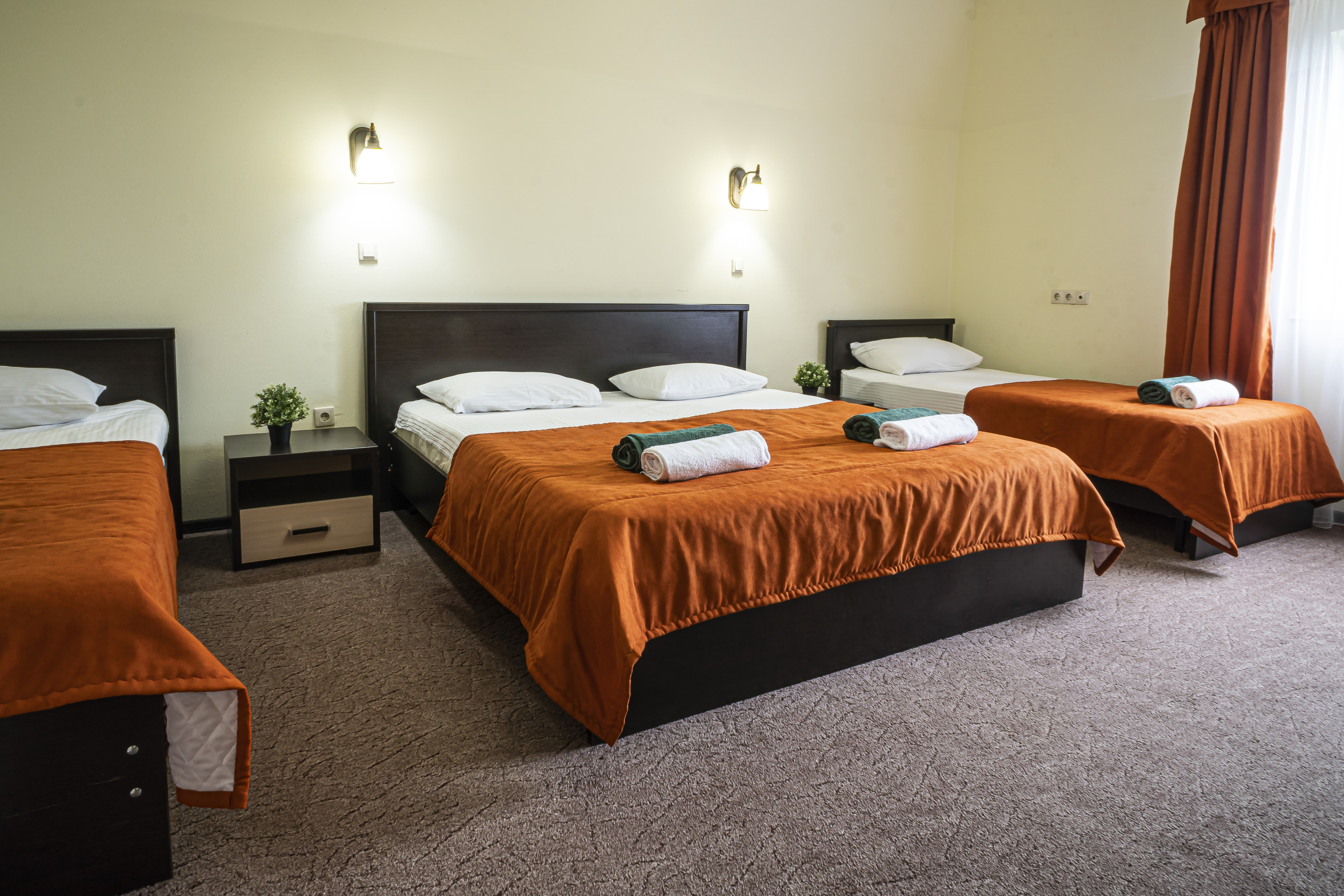 В номере: вешалка, зеркало, кресла, кровати односпальные /одна двуспальная кровать, кровать односпальная, прикроватные тумбочки, стол, шкаф, сплит-система, телевизор, холодильник