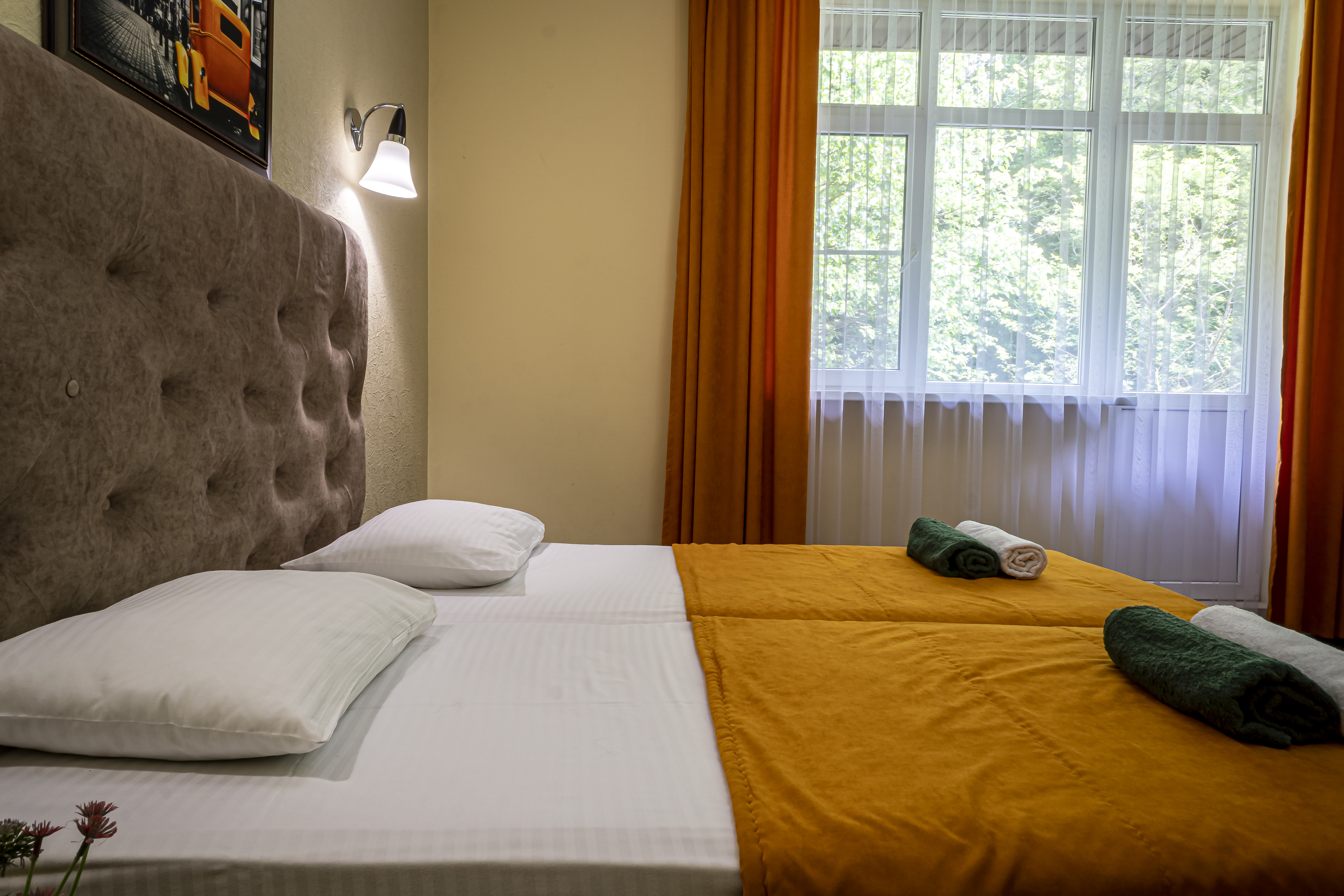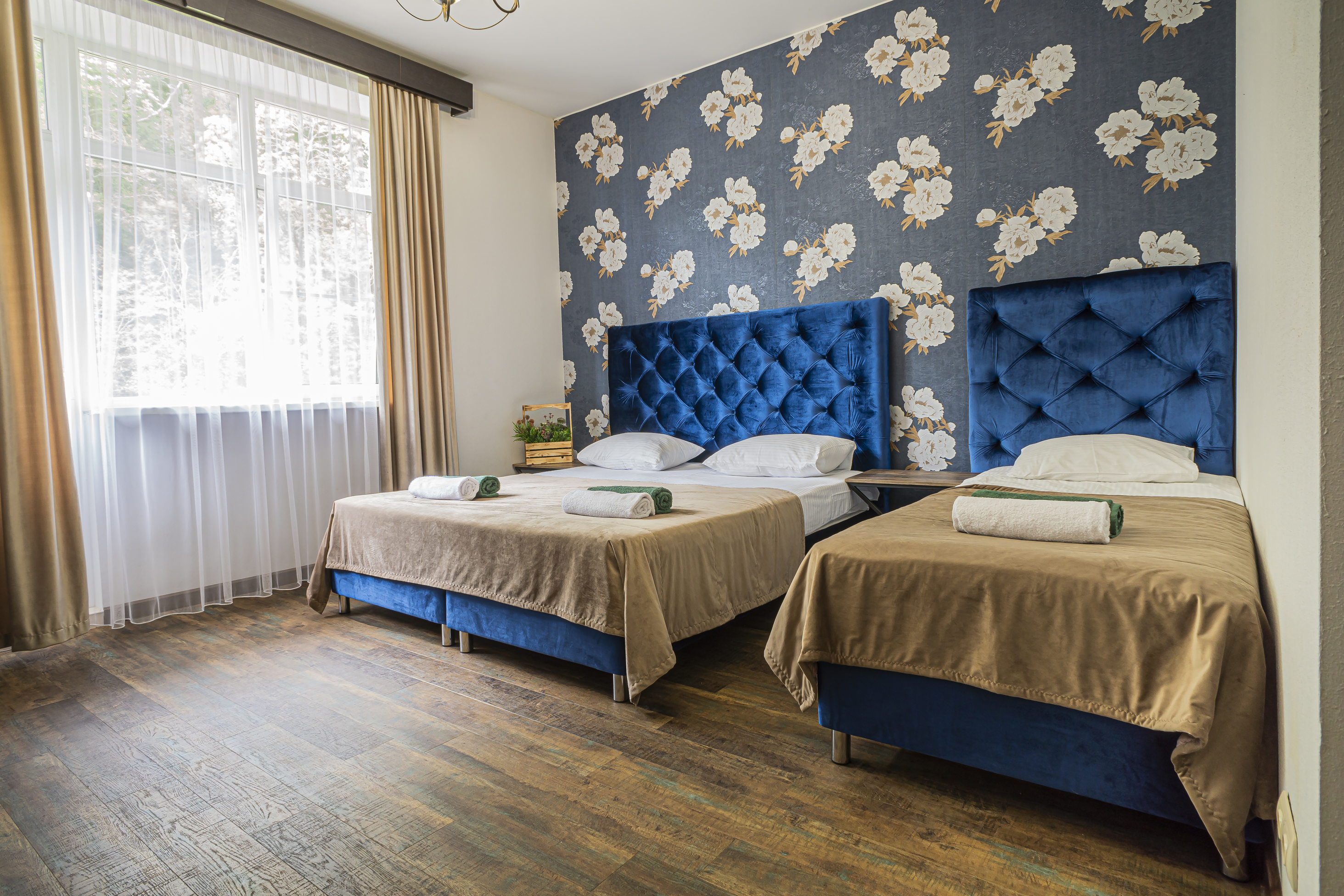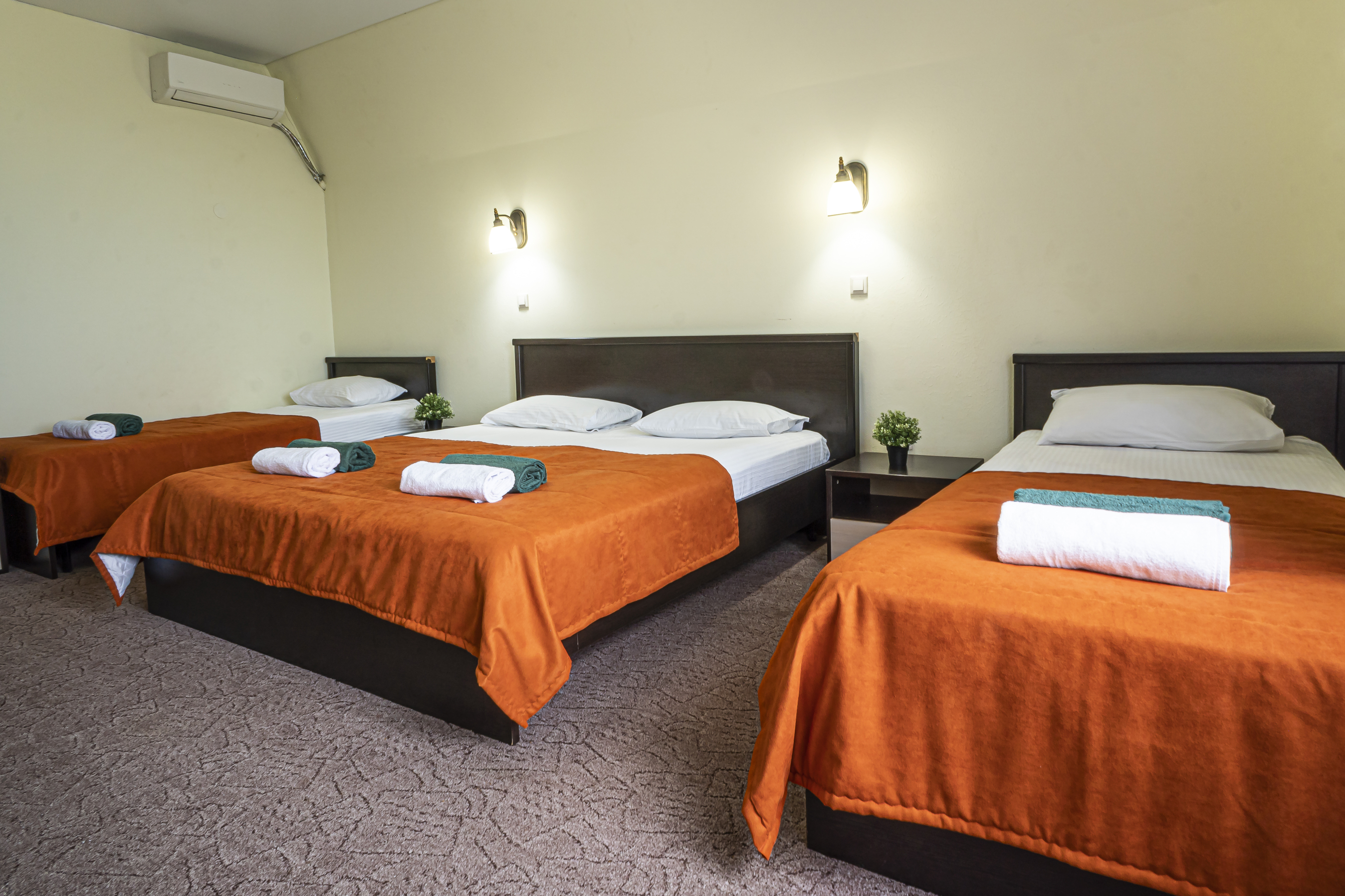 В номере: вешалка, зеркало, кровати односпальные /одна двуспальная кровать, прикроватные тумбочки, стол, стул, шкаф, сплит-система, телевизор, холодильник