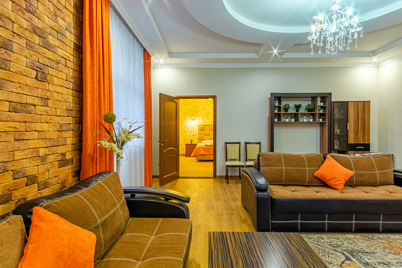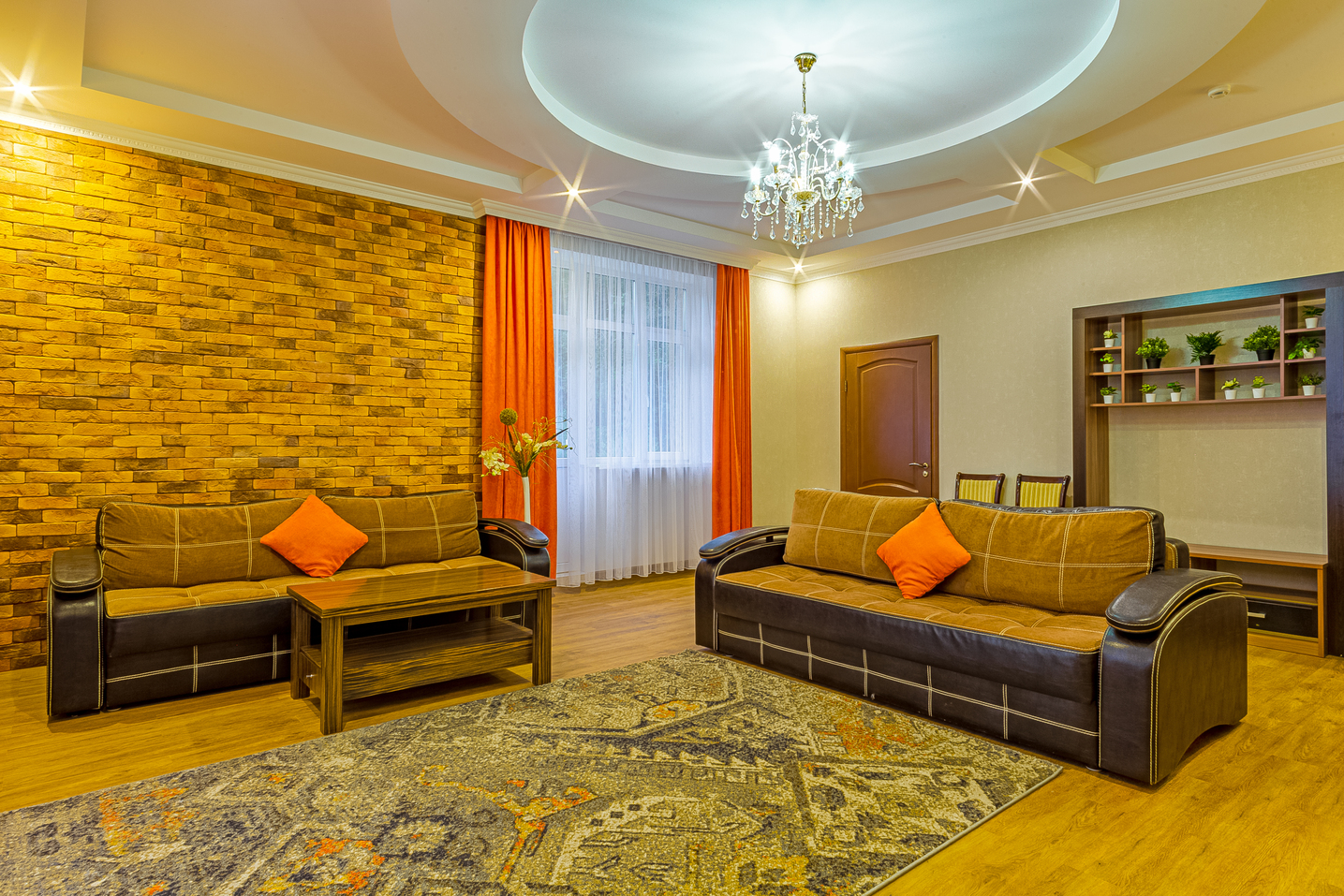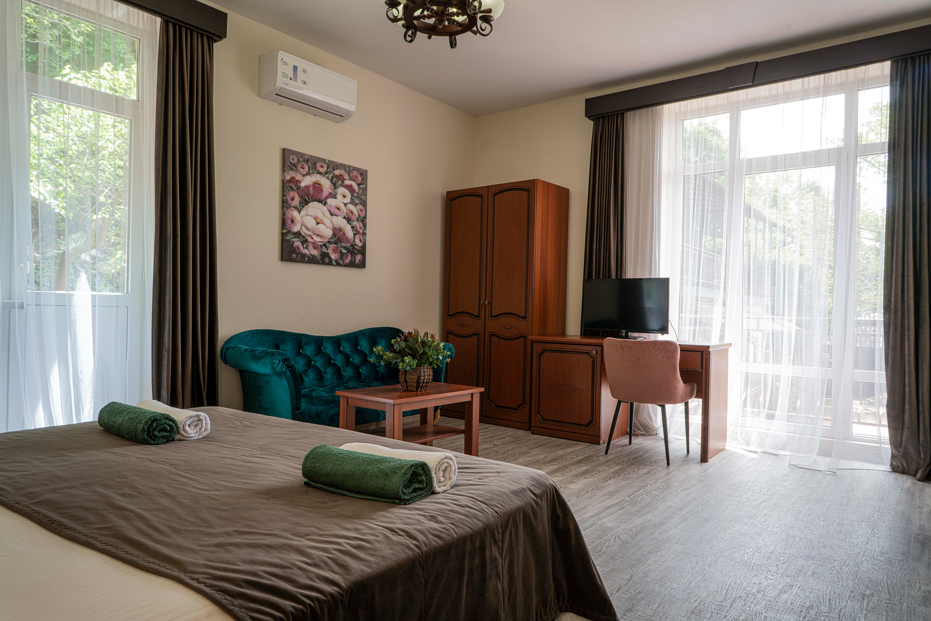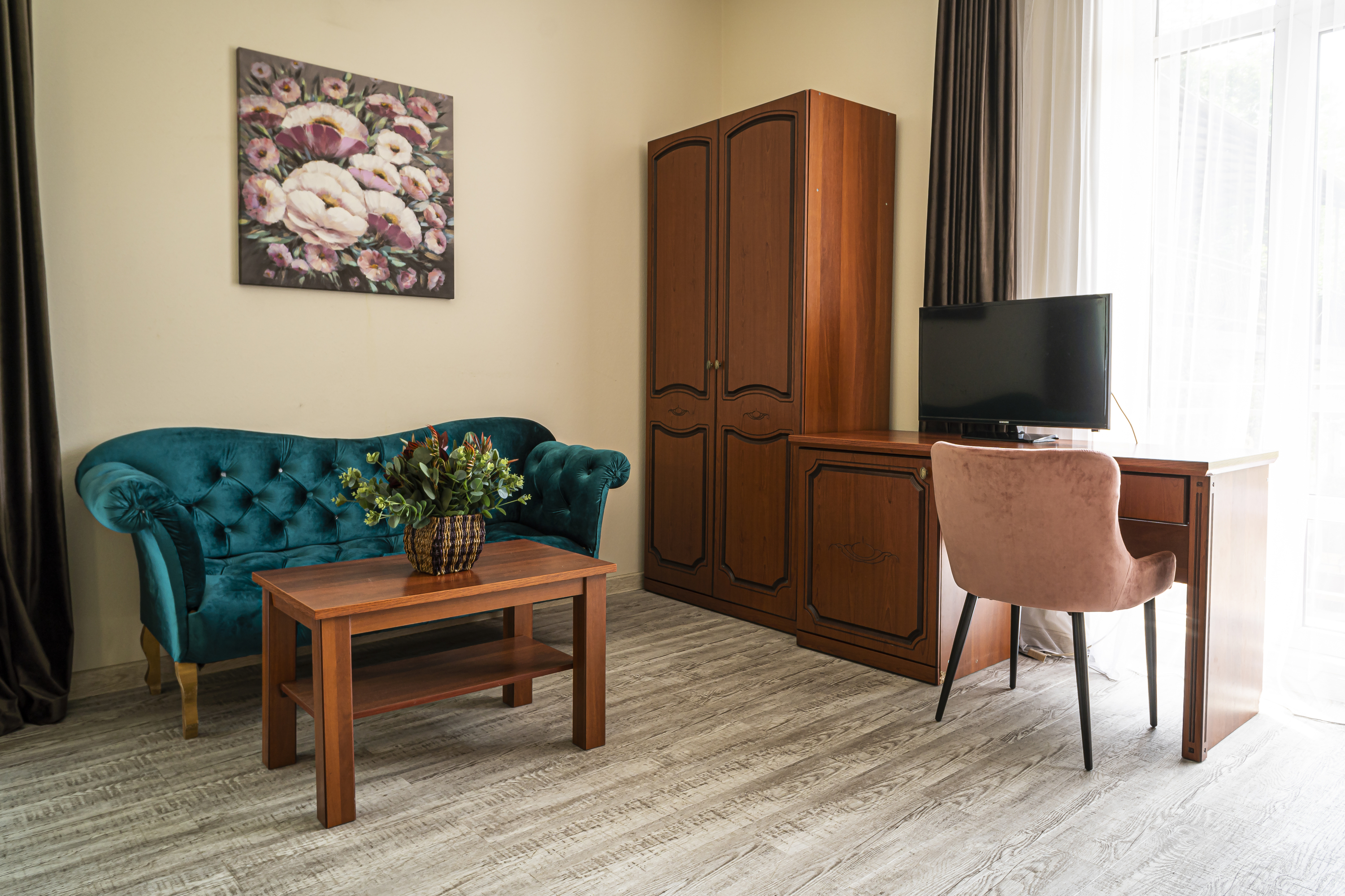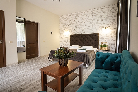 В номере: вешалка, диван раскладной, зеркало, кровать двуспальная, прикроватные тумбочки, стол, столик журнальный, стулья, шкаф, сплит-система, телевизор, холодильник