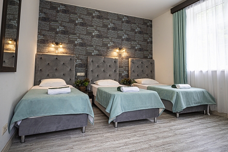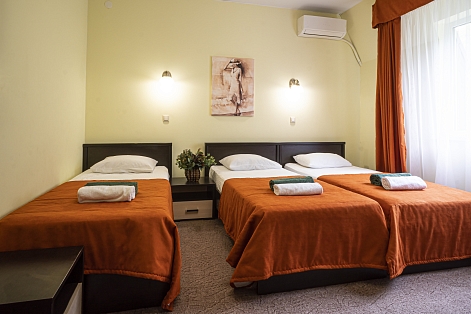 В номере: вешалка, зеркало, кровати односпальные /одна двуспальная кровать, кровать односпальная, прикроватные тумбочки, стол, стулья, шкаф, сплит-система, телевизор, холодильник