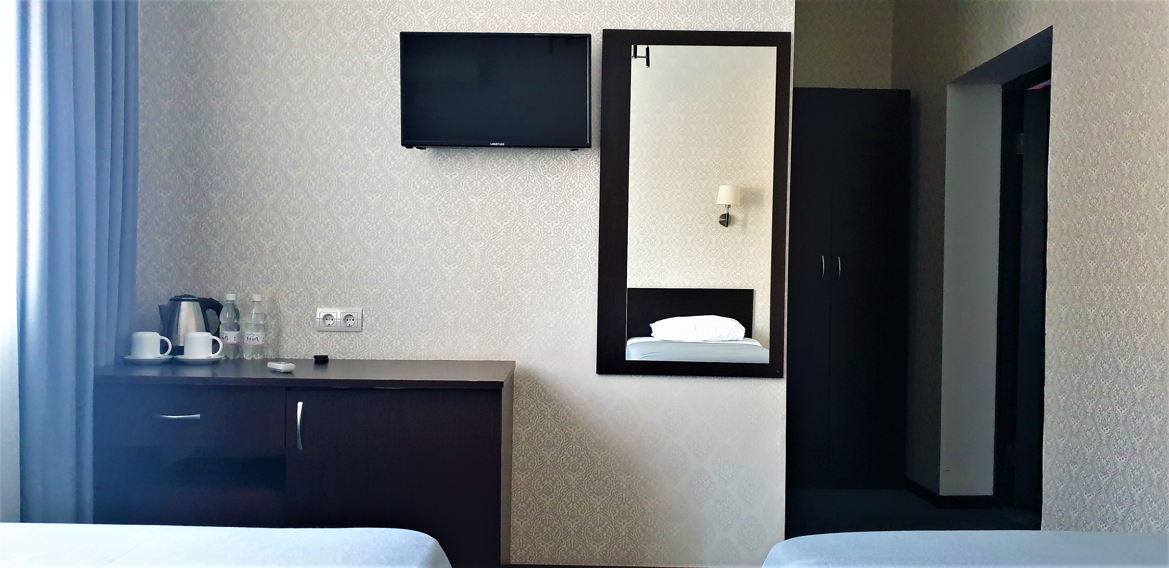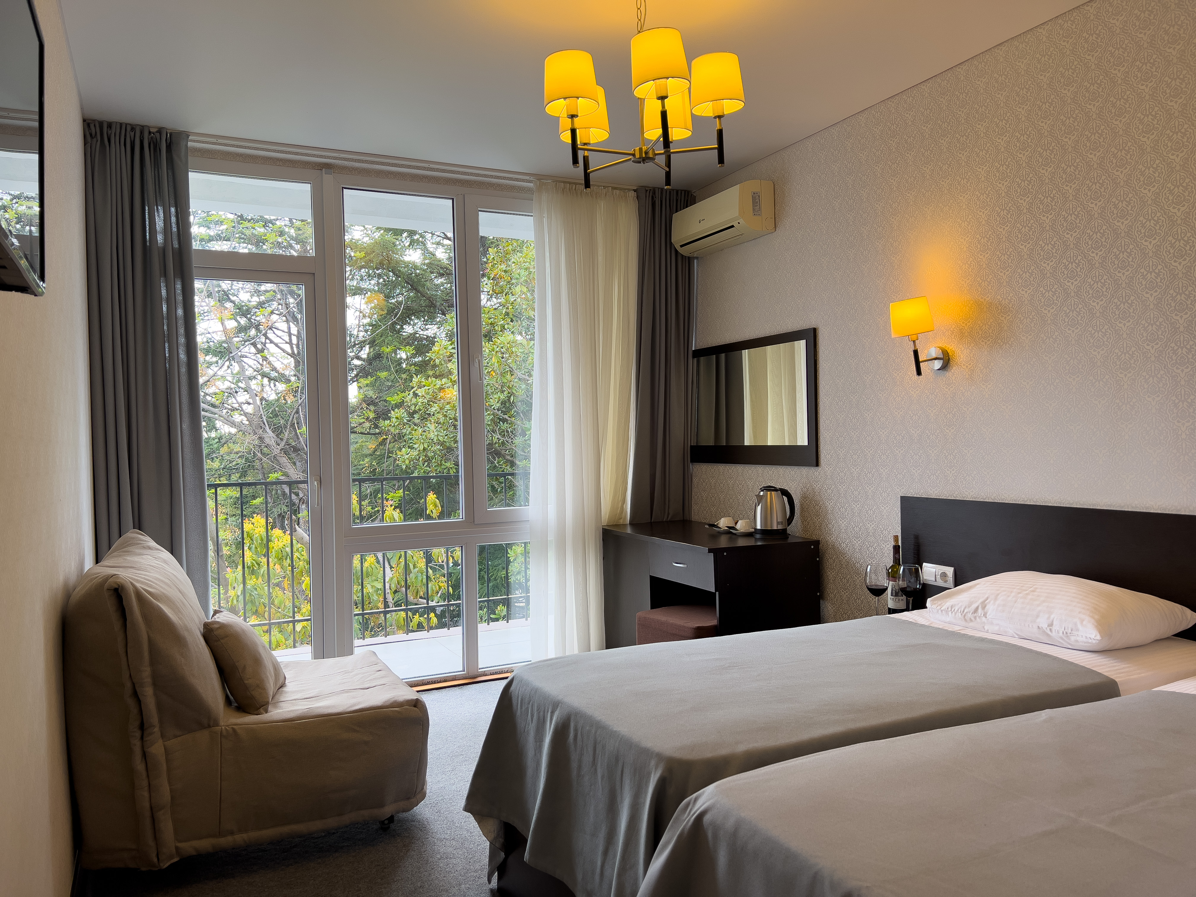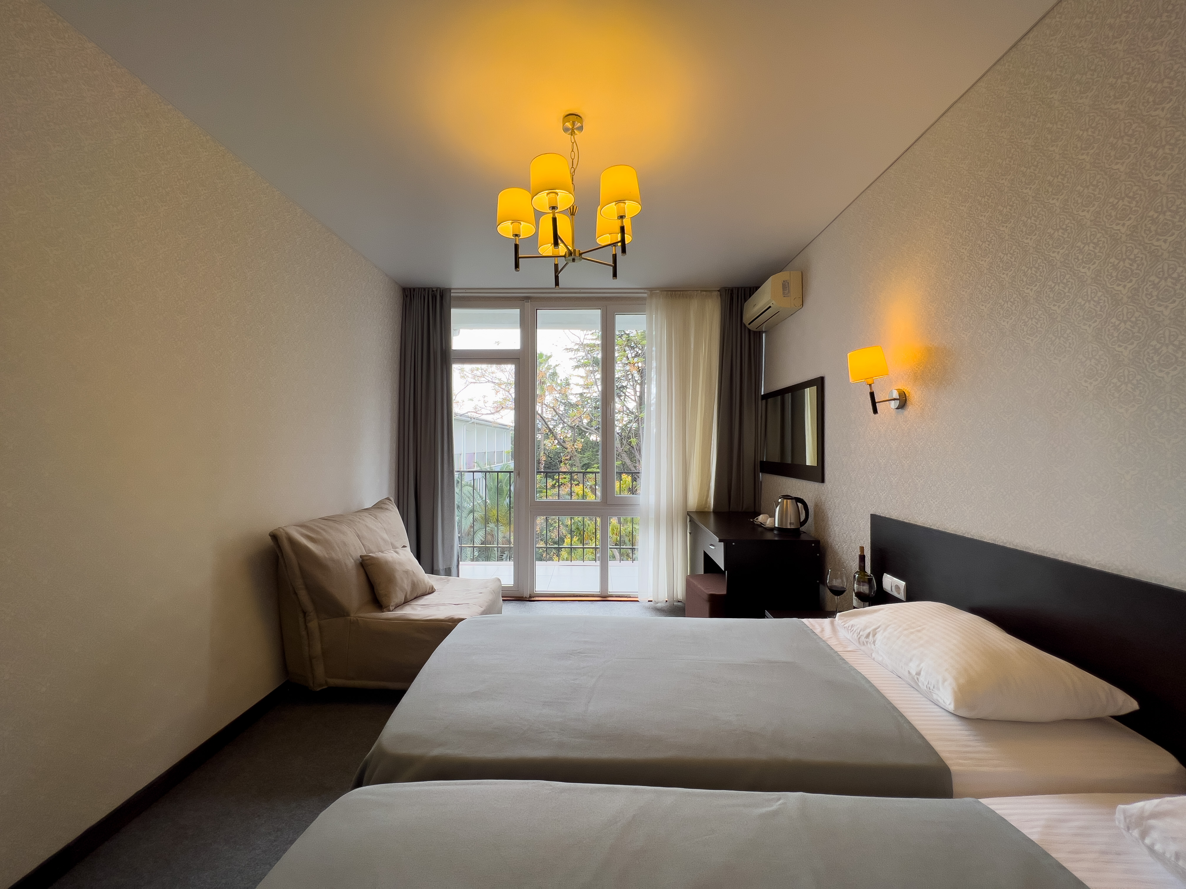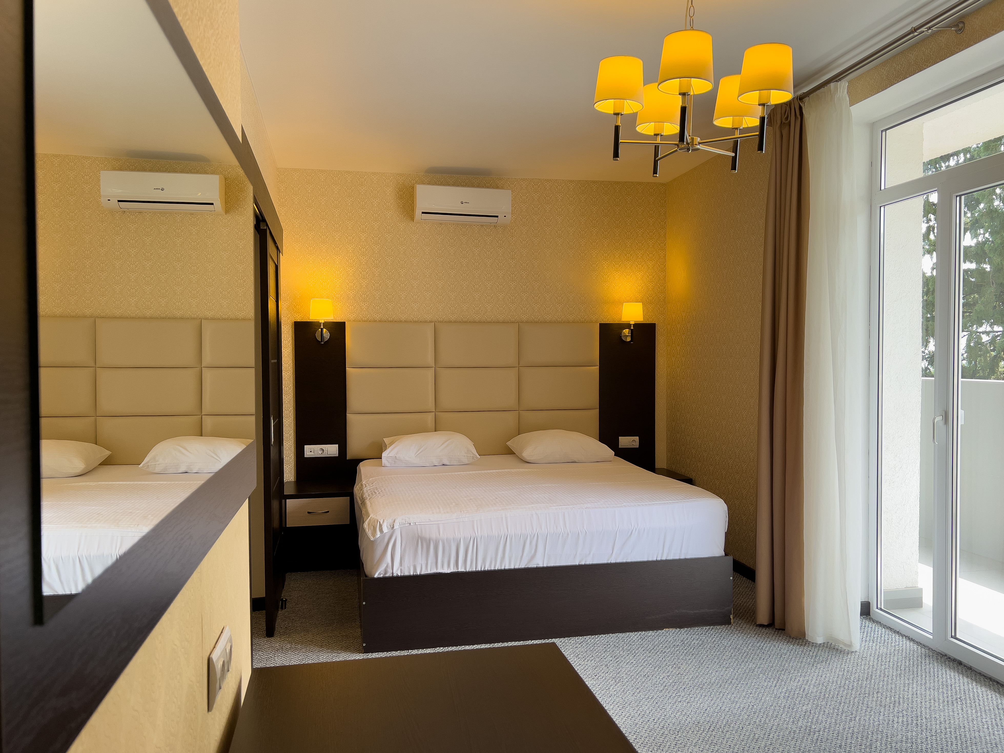 В номере: вешалка, зеркало, кровать двуспальная, кровать односпальная, прикроватные тумбочки, стол, стул, шкаф, кондиционер, сейф, телевизор, холодильник, чайный набор посуды, электрочайник