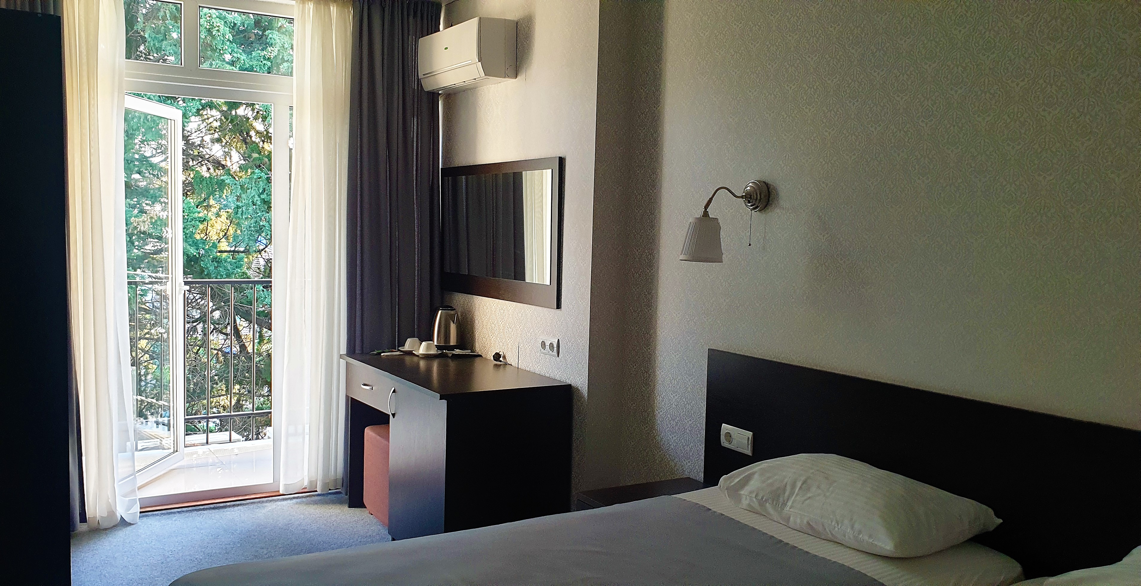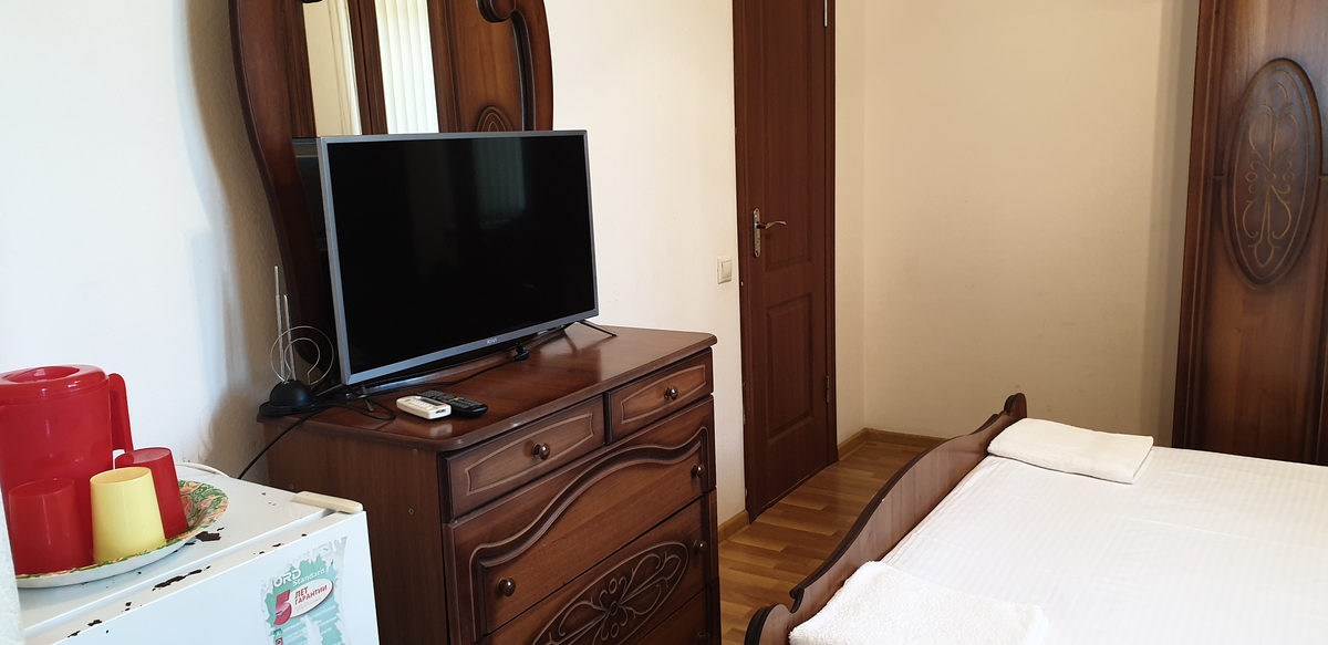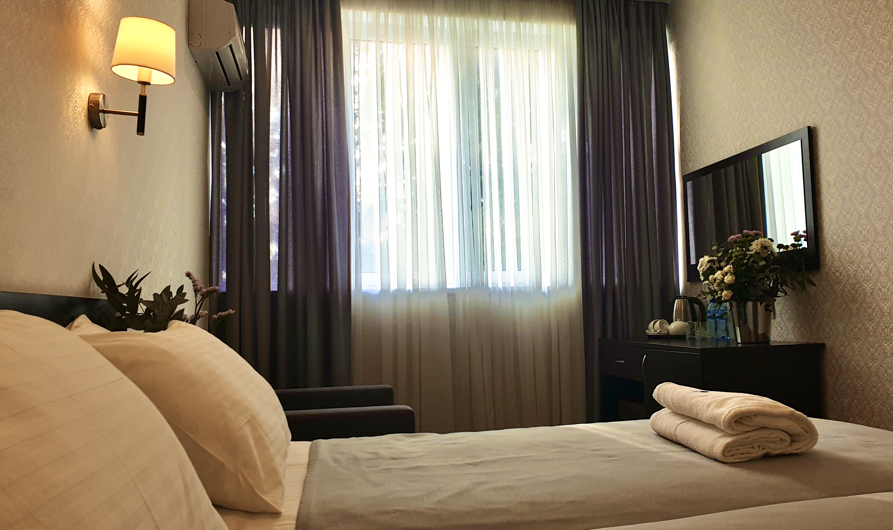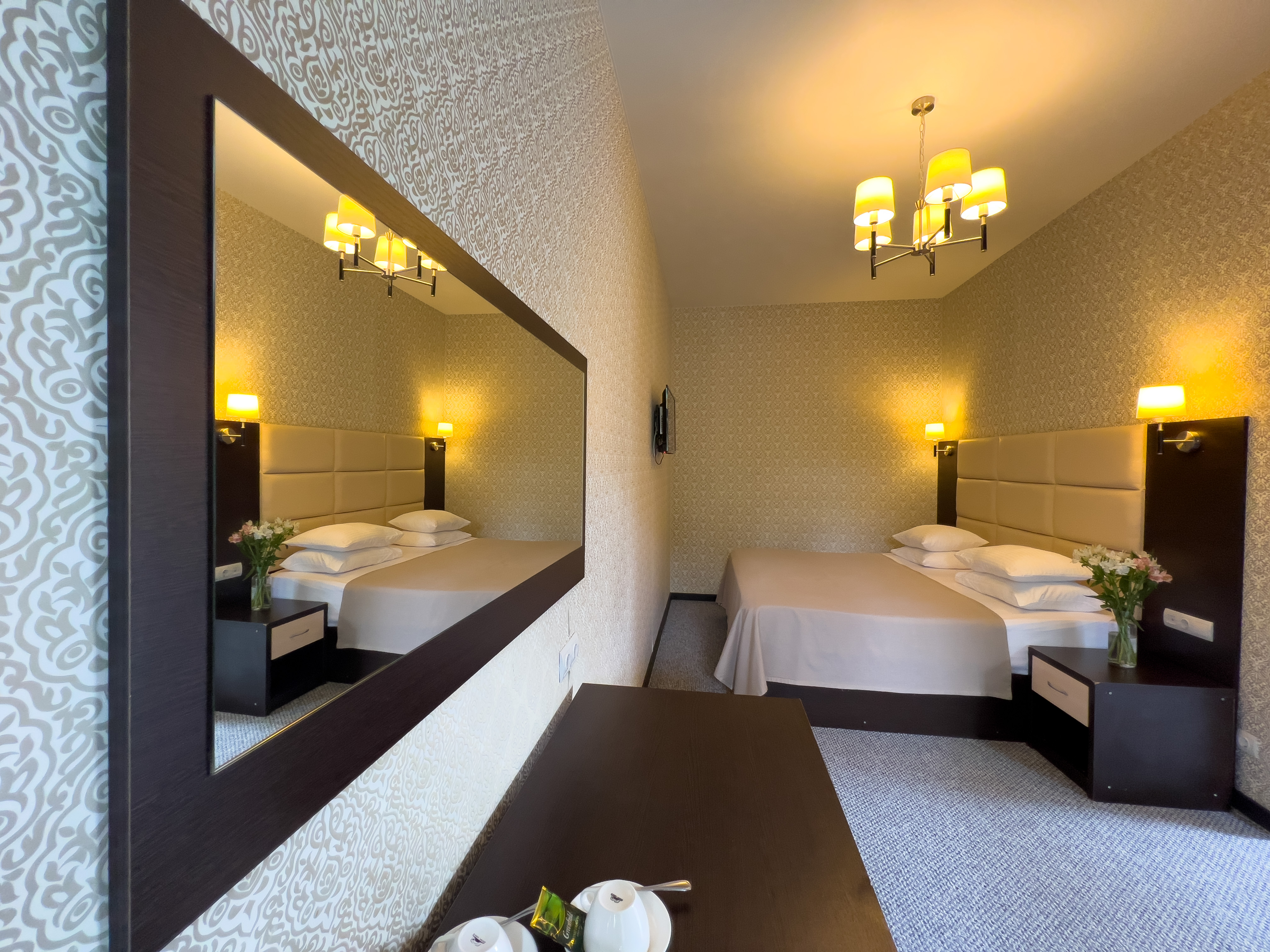 В номере: вешалка, зеркало, кровать двуспальная, кровать односпальная, прикроватные тумбочки, стол, стул, шкаф, кондиционер, сейф, телевизор, холодильник, чайный набор посуды, электрочайник