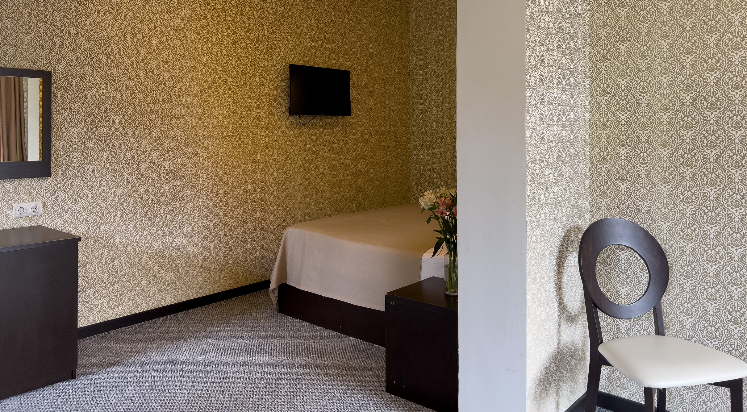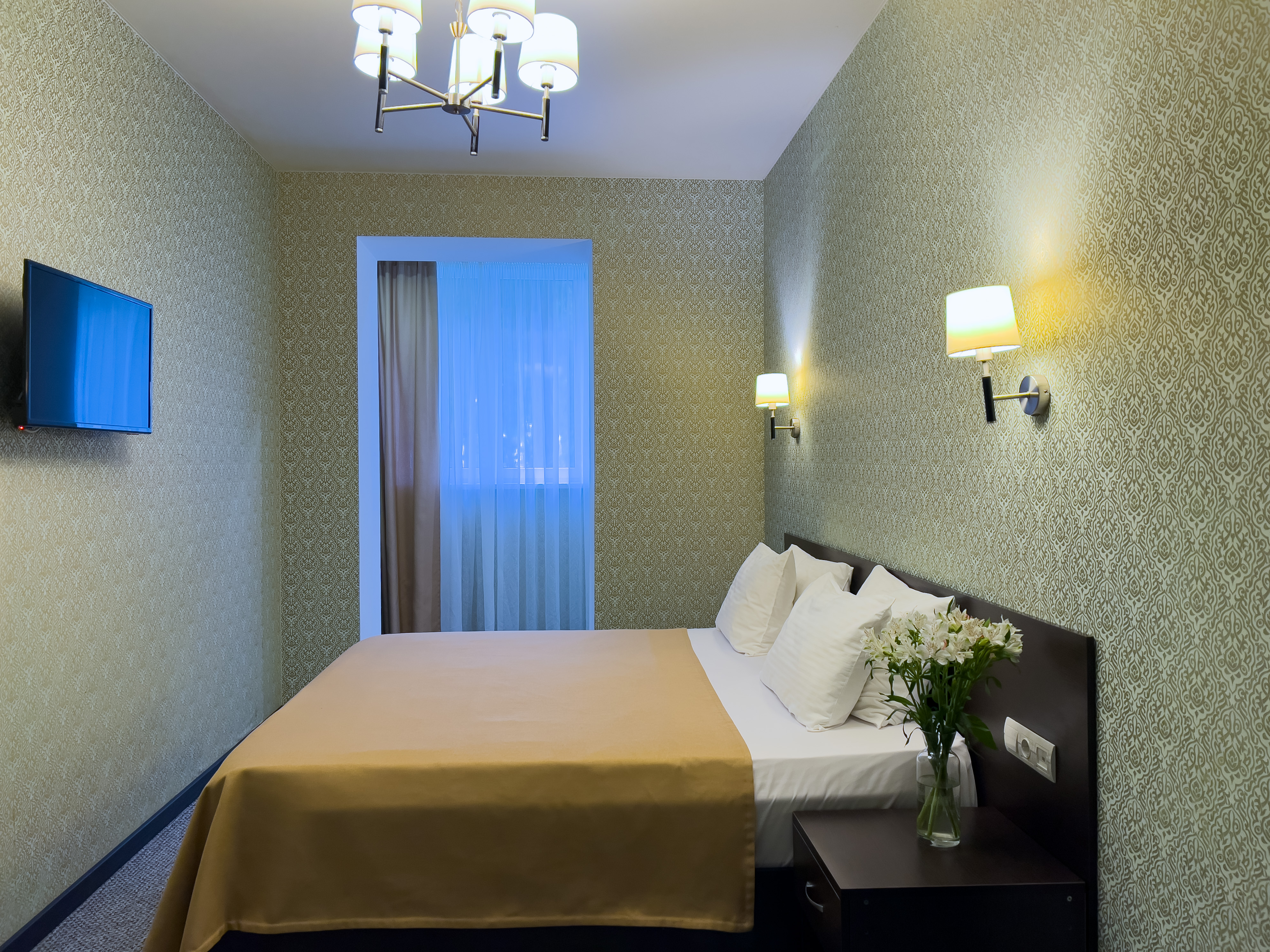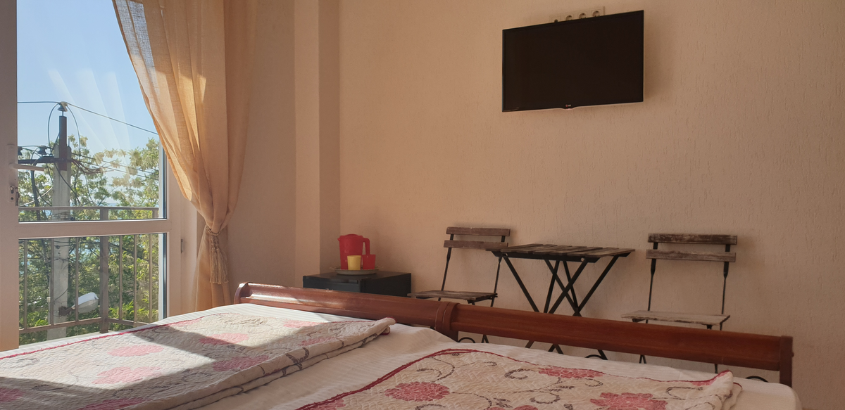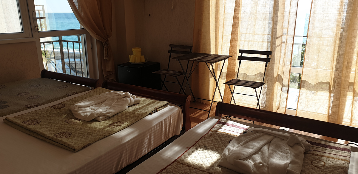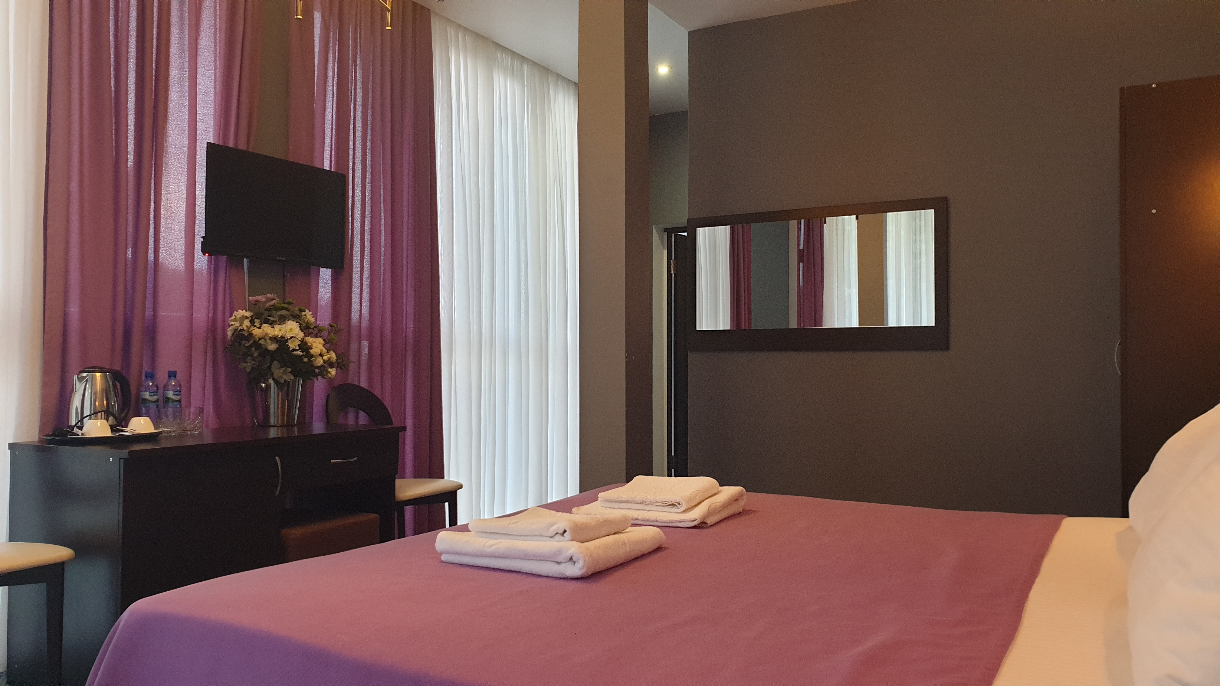 В номере: вешалка, зеркало, кровать двуспальная, кровать односпальная, прикроватные тумбочки, стол, стул, шкаф, кондиционер, сейф, телевизор, холодильник, чайный набор посуды, электрочайник