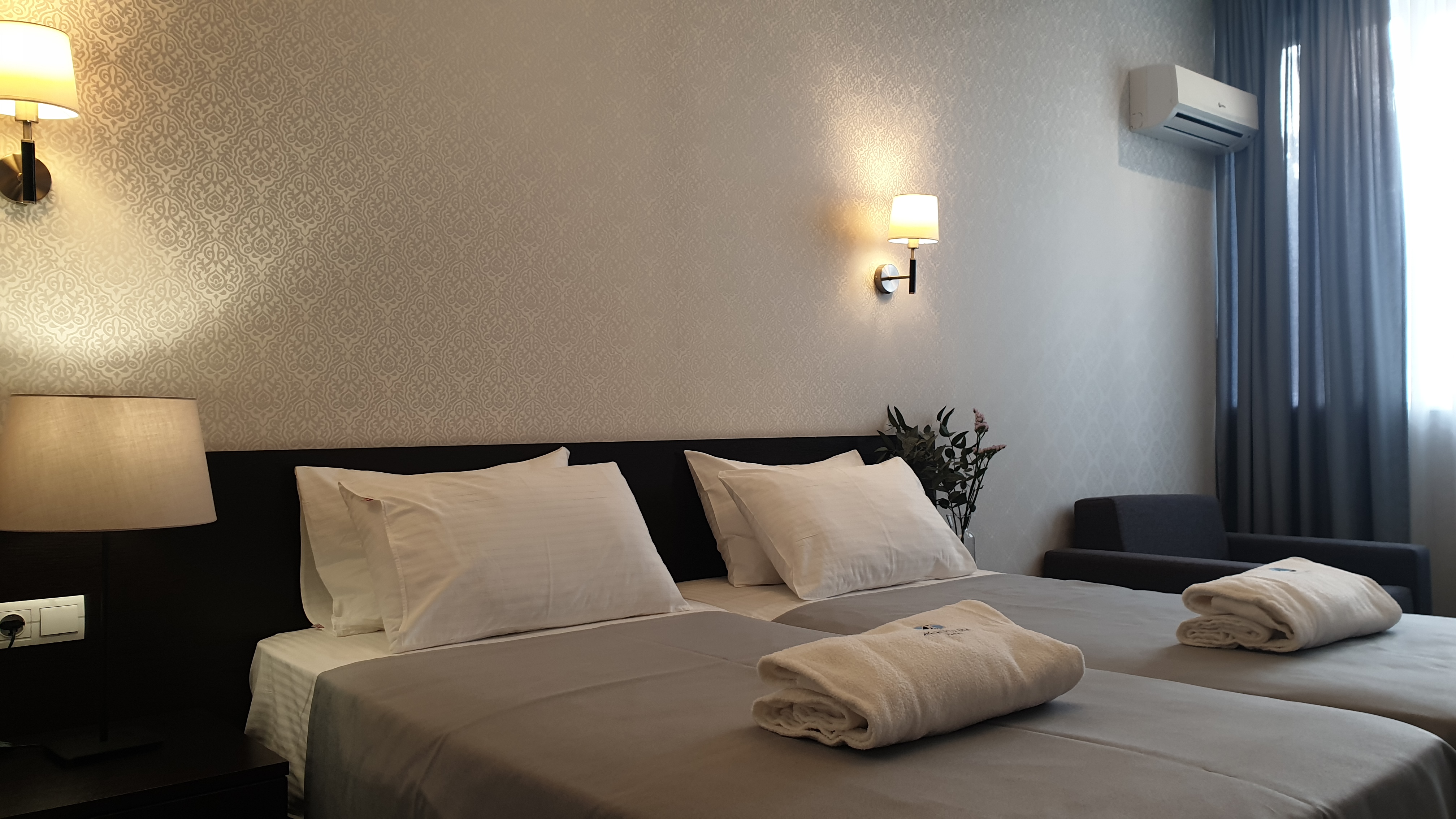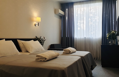 В номере: вешалка, зеркало, кресло-кровать, кровати односпальные /одна двуспальная кровать, прикроватные тумбочки, стол, стул, шкаф, кондиционер, сейф, телевизор, холодильник, чайный набор посуды, электрочайник