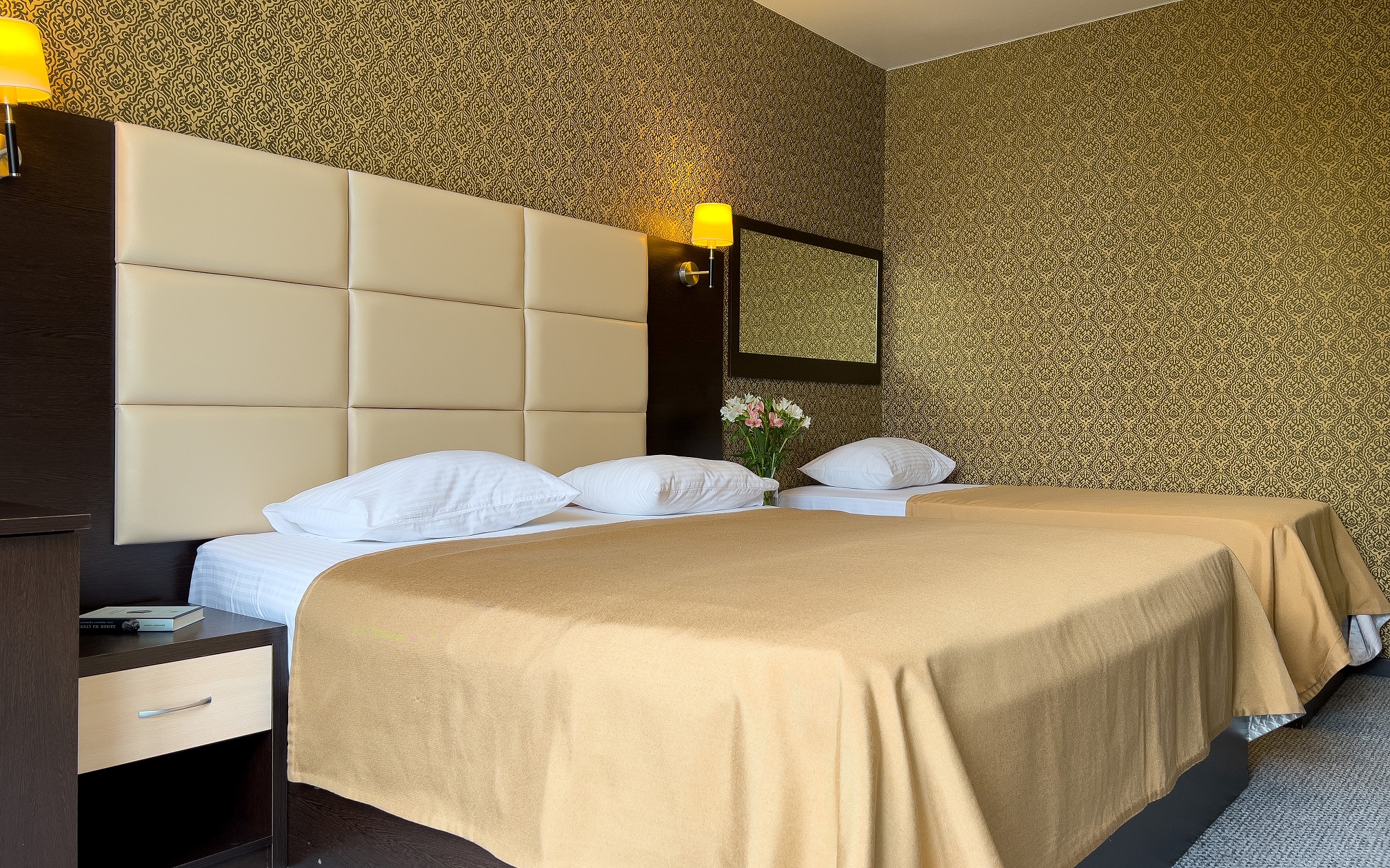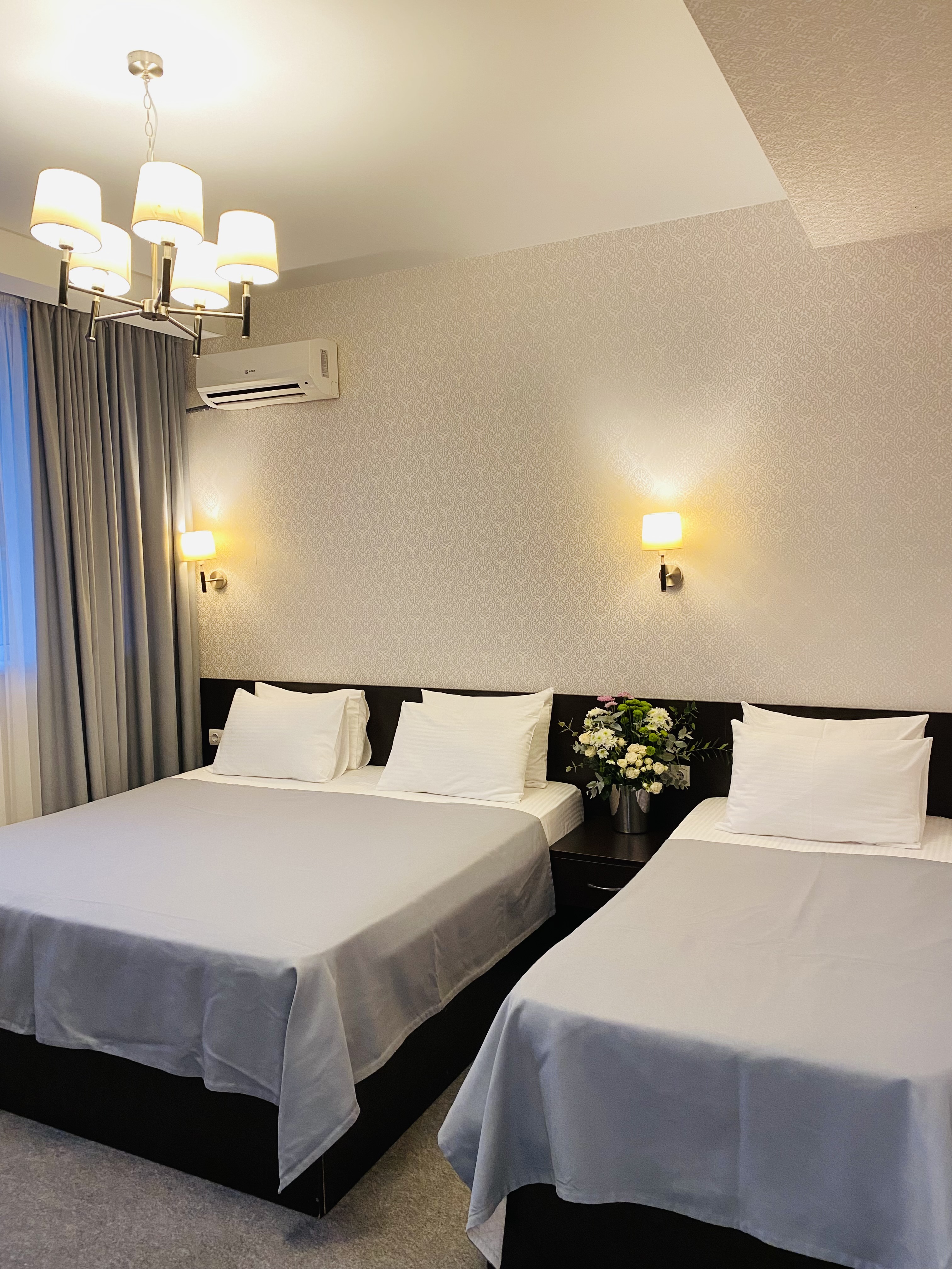 В номере: вешалка, зеркало, кровати односпальные, кровать двуспальная, прикроватные тумбочки, стол, стул, шкаф, кондиционер, телевизор, холодильник