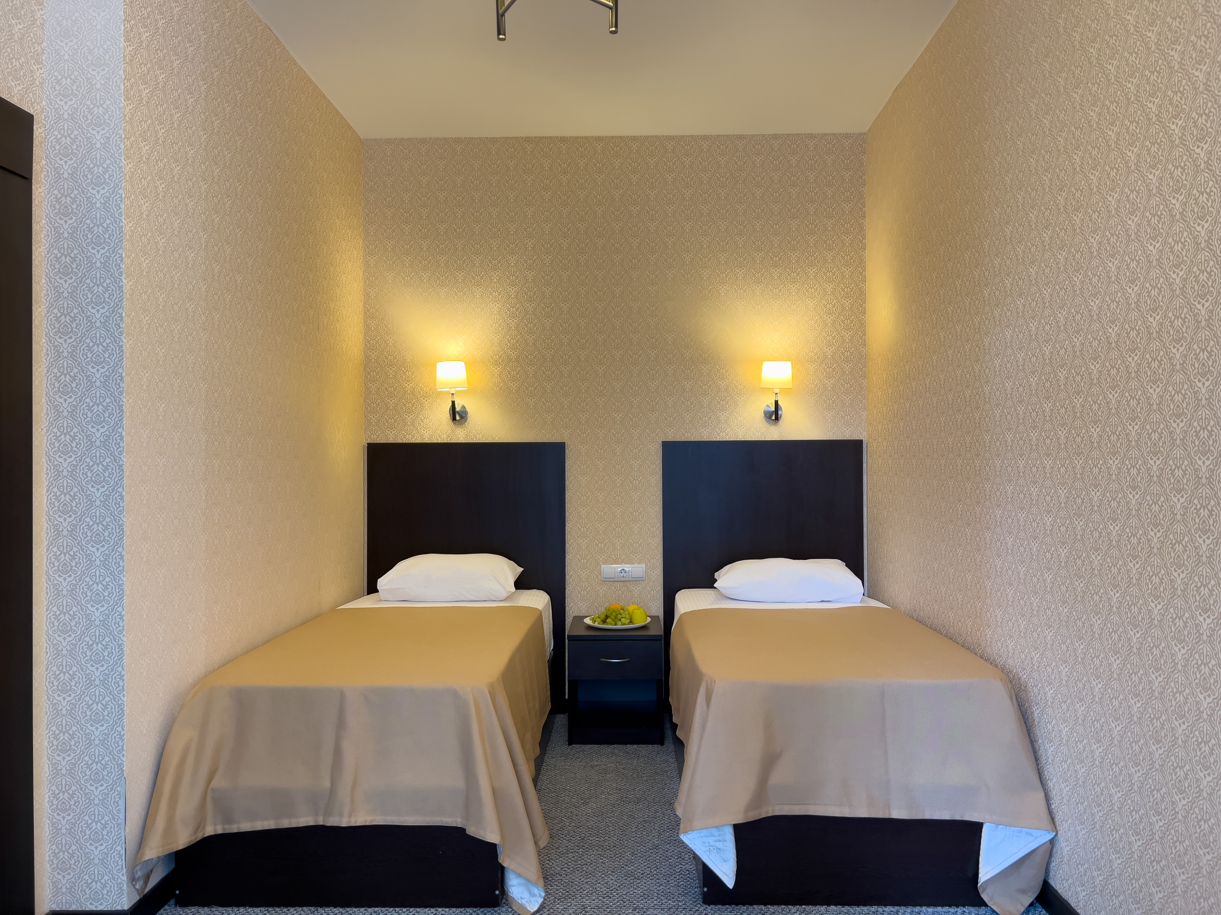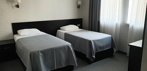 В номере: вешалка, зеркало, кровати односпальные, прикроватные тумбочки, стол, стул, шкаф, кондиционер, телевизор, холодильник