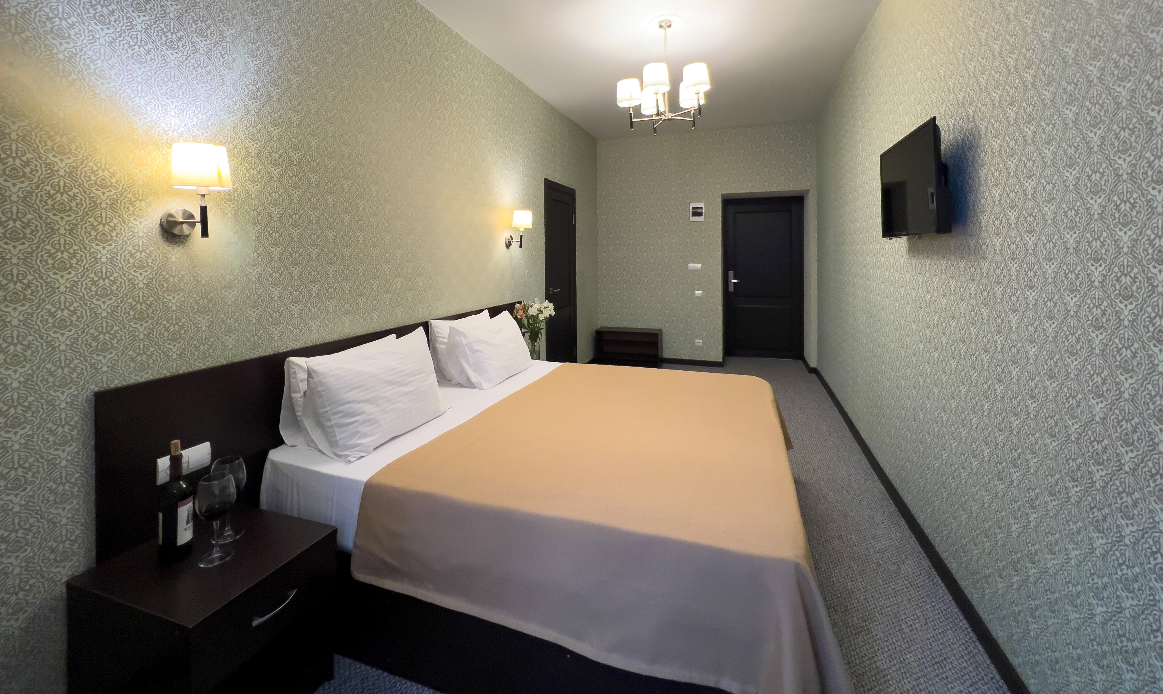 В номере: вешалка, зеркало, комод, кровать двуспальная, прикроватные тумбочки, шкаф, кондиционер, телевизор, холодильник