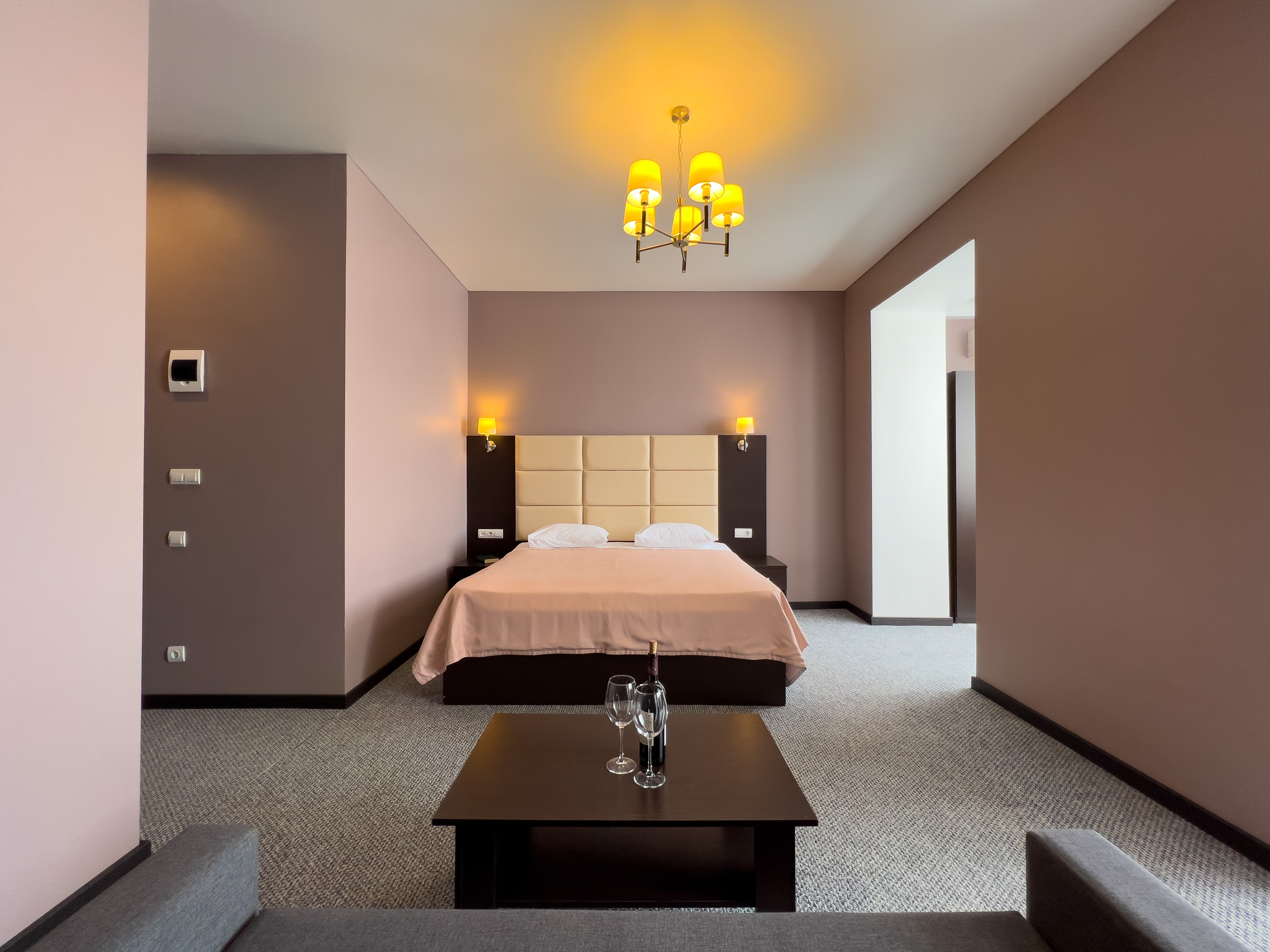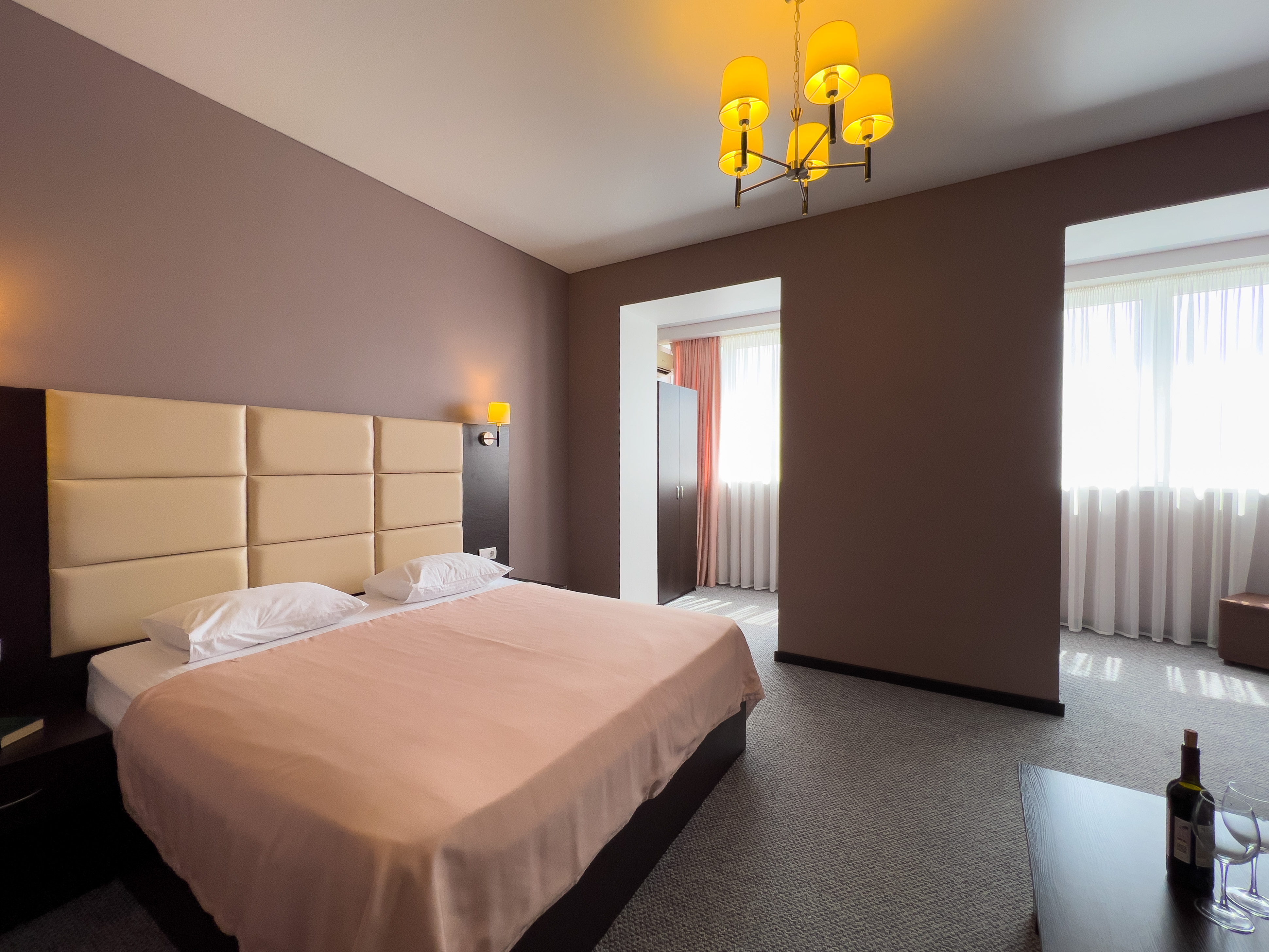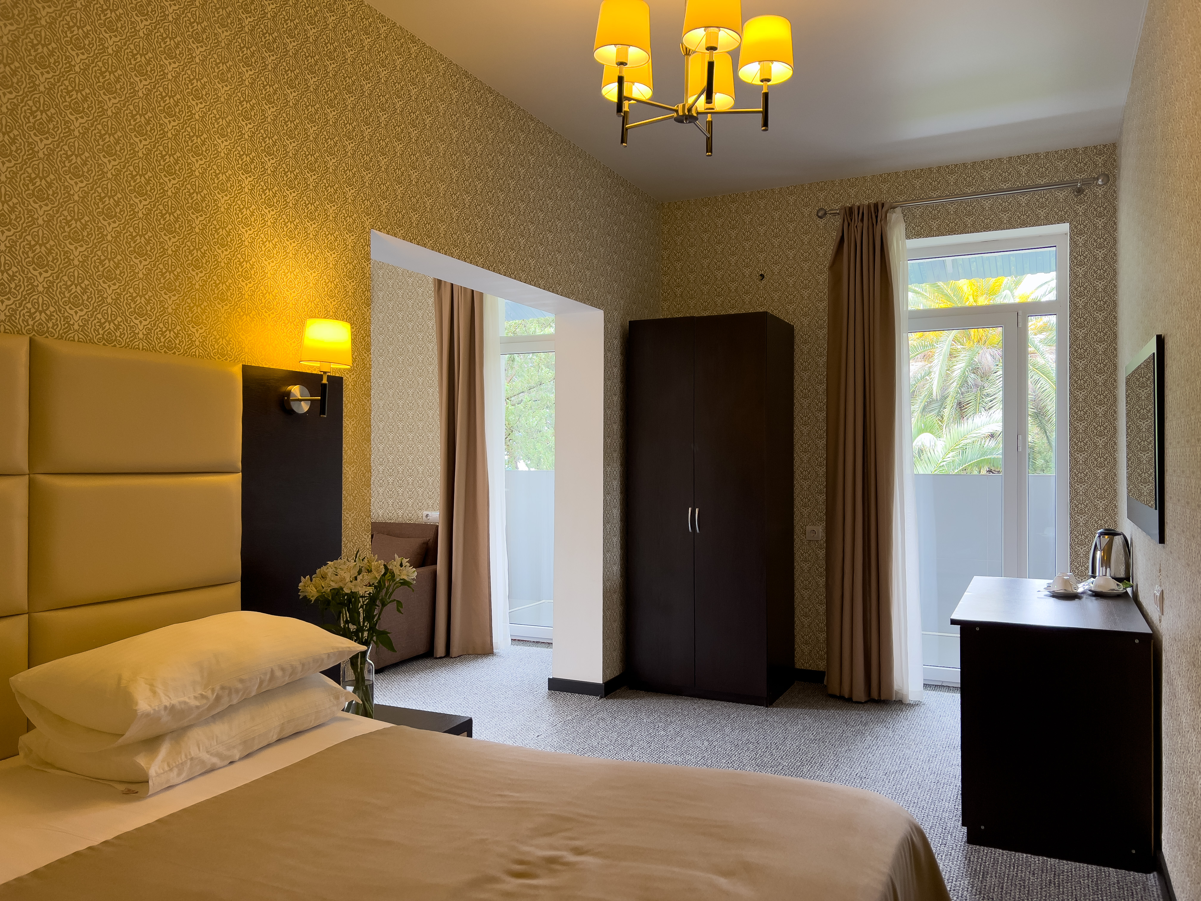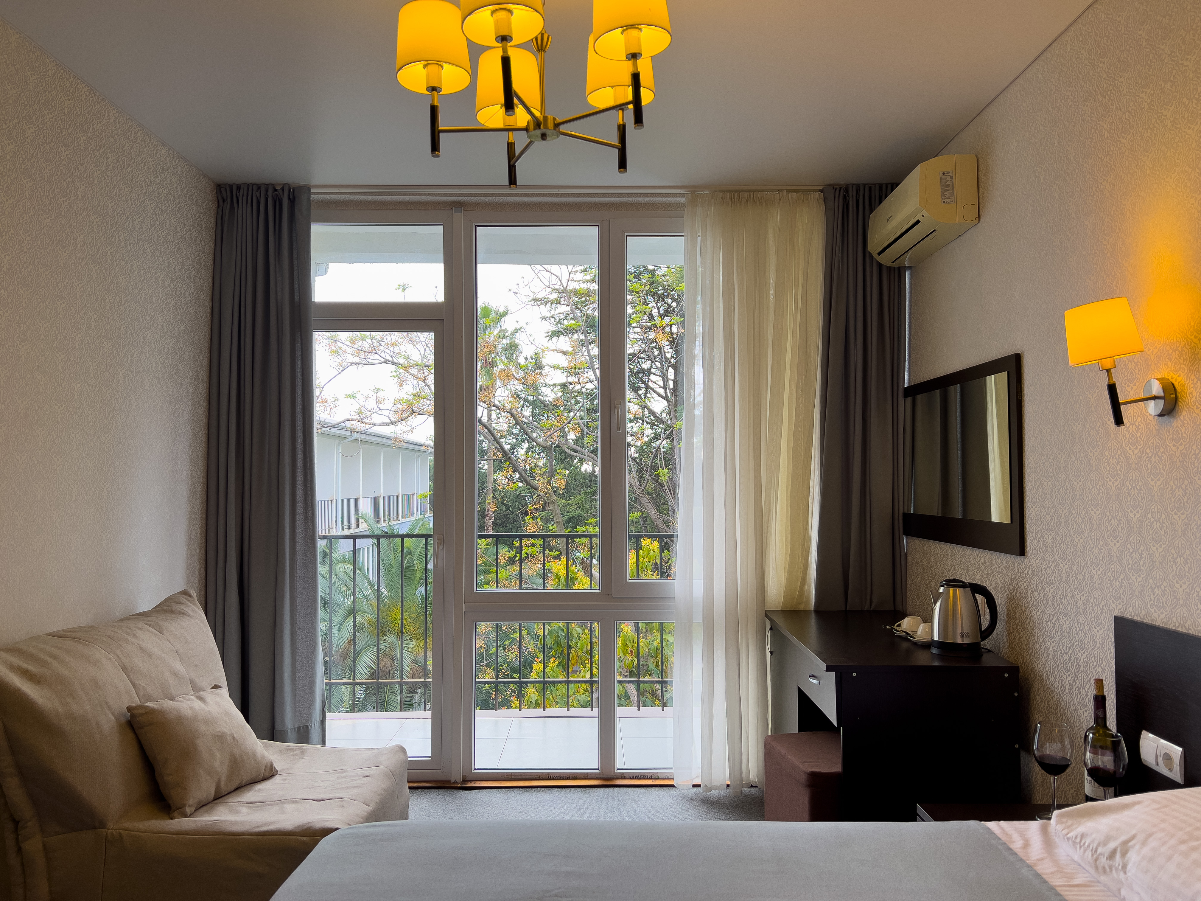 В номере: вешалка, диван раскладной, зеркало, кресло-кровать, кровать двуспальная, прикроватные тумбочки, стол, стулья, шкаф, кондиционер, сейф, телевизор, холодильник, чайный набор посуды, электрочайник