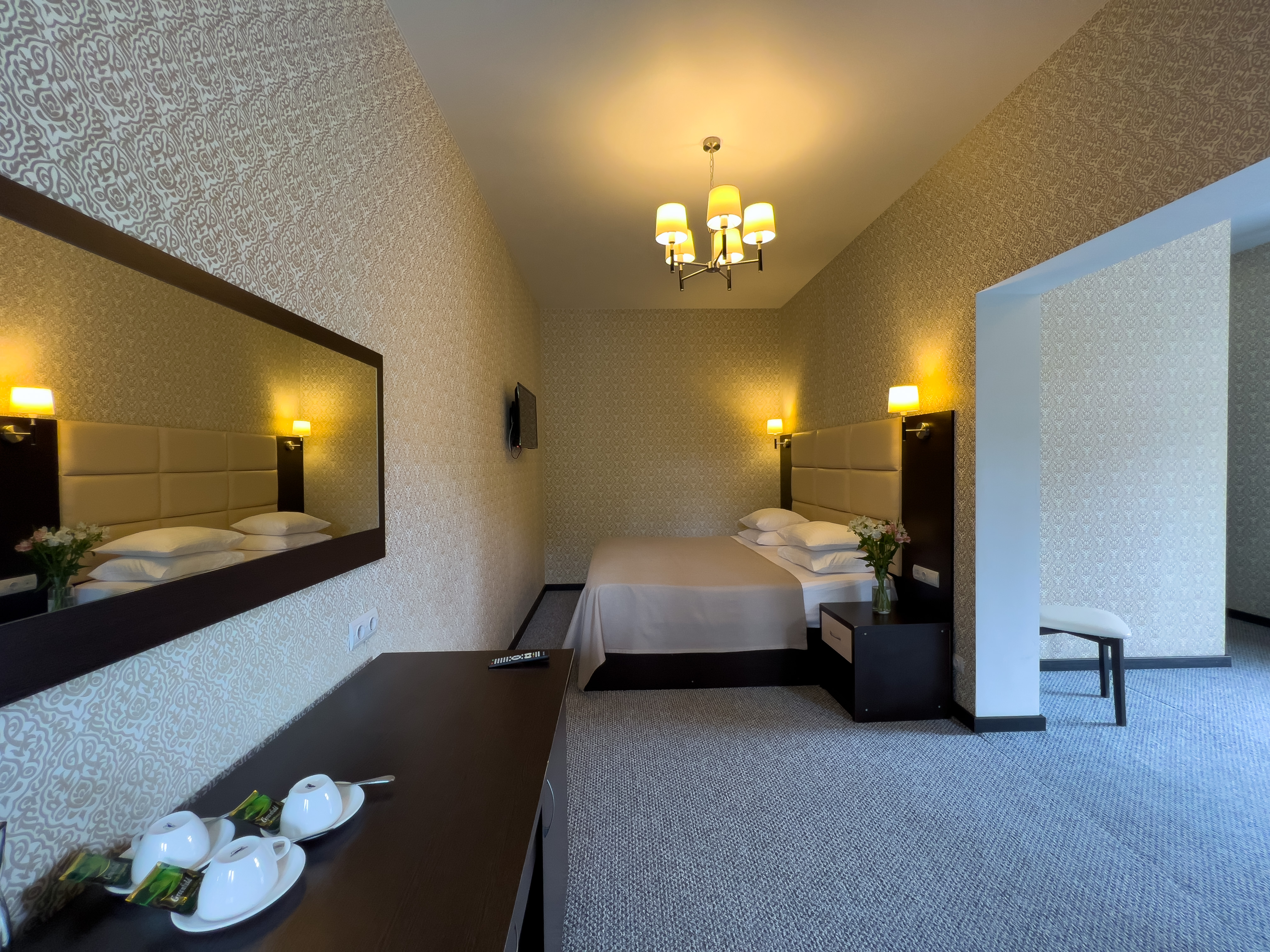 В номере: вешалка, зеркало, кресло-кровать, кровать двуспальная, прикроватные тумбочки, стол, стулья, шкаф, кондиционер, сейф, телевизор, холодильник, чайный набор посуды, электрочайник