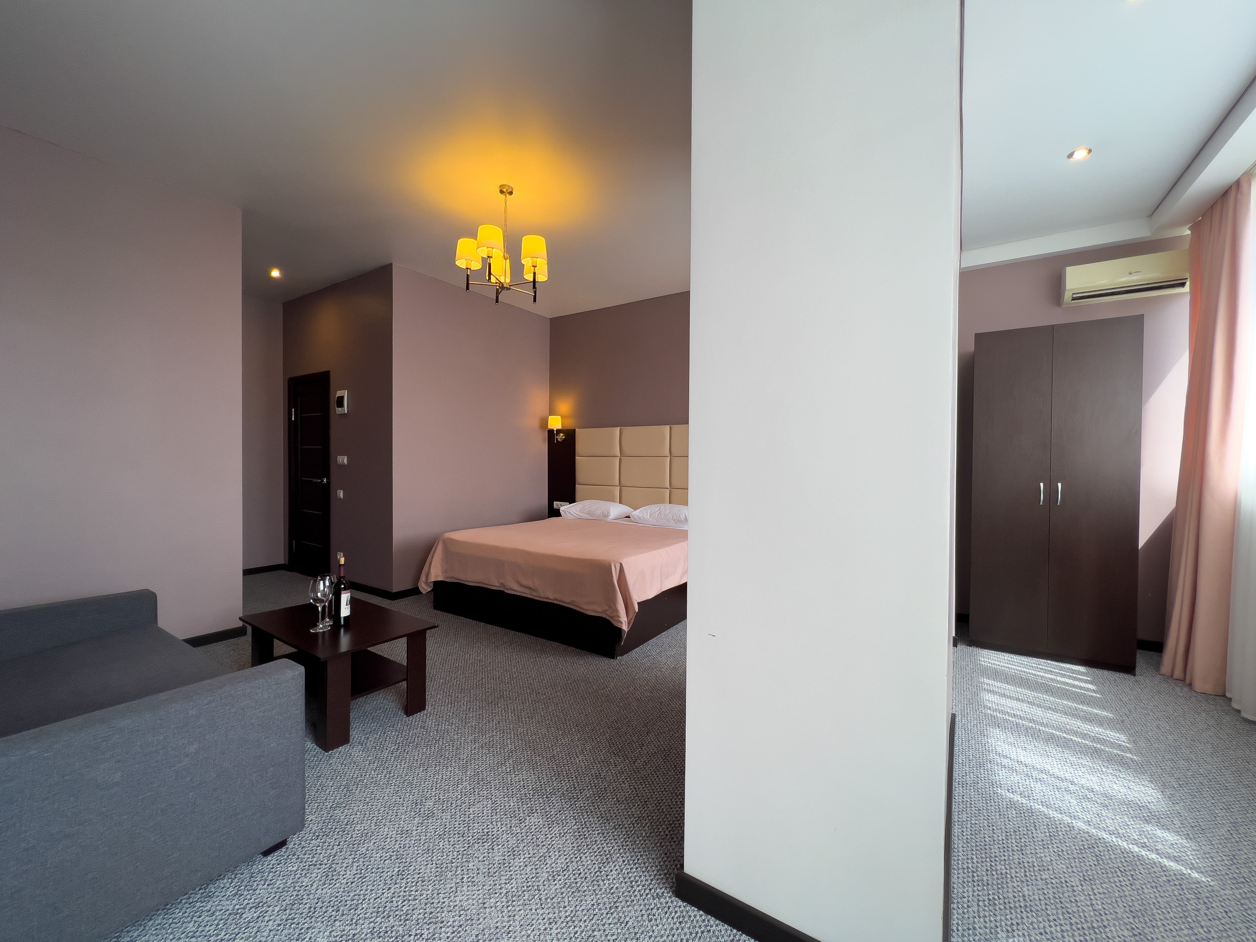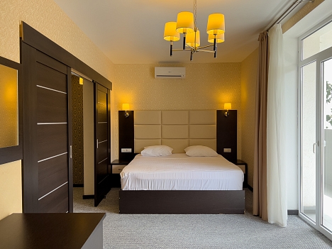 В номере: вешалка, диван раскладной, зеркало, кровать двуспальная, прикроватные тумбочки, стол, стулья, шкаф, кондиционер, сейф, телевизор, холодильник, чайный набор посуды, электрочайник