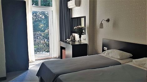 В номере: вешалка, зеркало, кровати односпальные /одна двуспальная кровать, прикроватные тумбочки, стол, стул, шкаф, кондиционер, сейф, телевизор, холодильник, чайный набор посуды, электрочайник