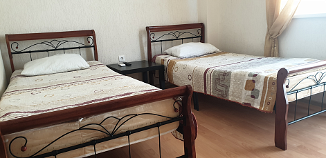 В номере: вешалка, зеркало, кровати односпальные, кровать двуспальная, прикроватные тумбочки, стол, стул, шкаф, кондиционер, сейф, телевизор, холодильник, чайный набор посуды, электрочайник