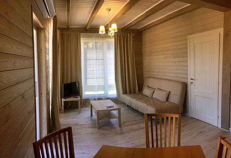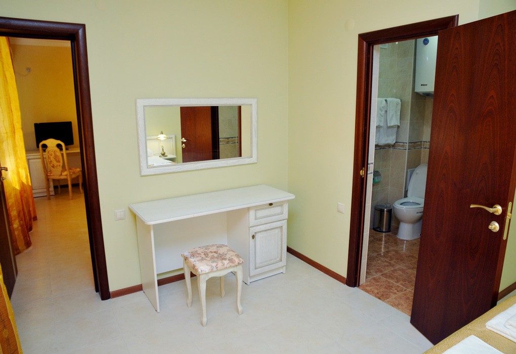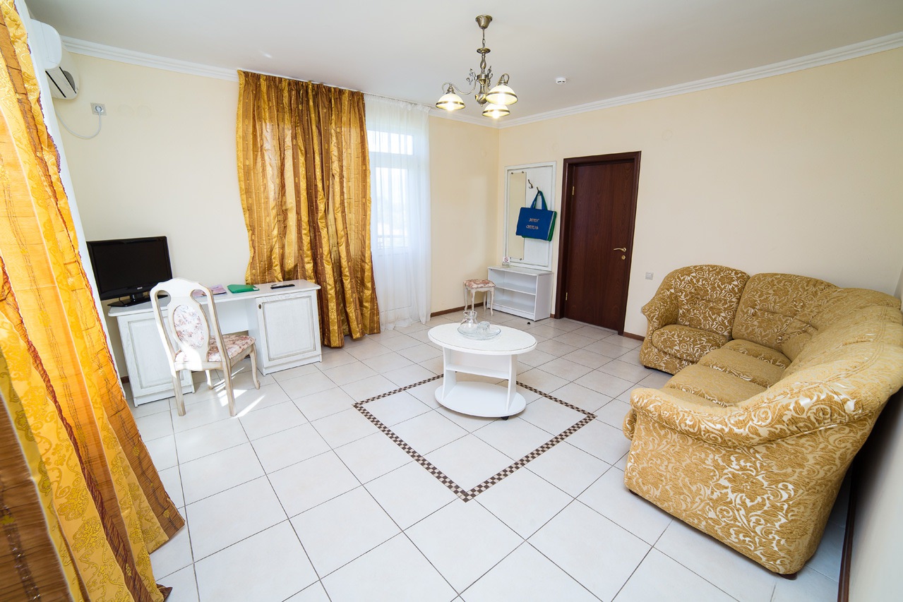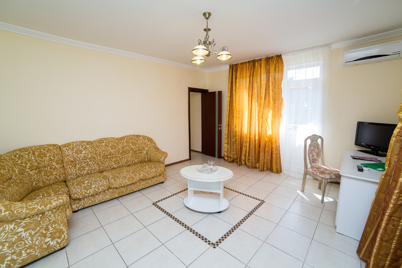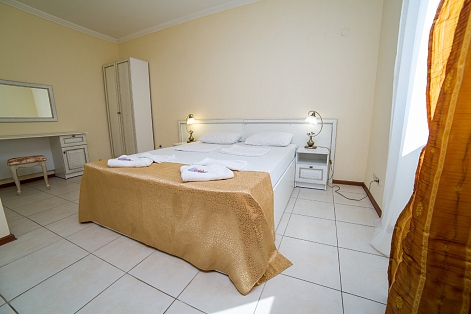 В номере: вешалка, диван раскладной, зеркало, кровати односпальные /одна двуспальная кровать, прикроватные тумбочки, стол, столик журнальный, стулья, шкаф, кондиционер, телевизор, холодильник, чайный набор посуды, электрочайник