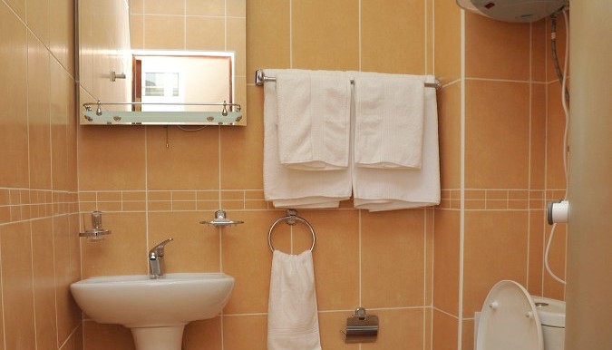 Санузел: с душем, туалетные принадлежности, фен, халат