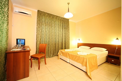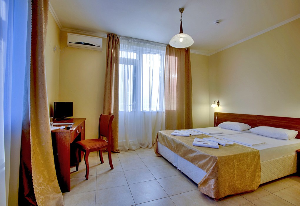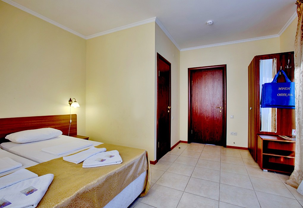 апостола Андрея 10-го века, к которым ведут пешеходные маршруты. «Ирэн» представляет собой два современных комфортабельных корпуса в шесть этажей и 4 деревянных котеджа на охраняемой благоустроенной территории. Построен гостиничный комплекс в 2011 году. Гостей размещают в номерах категории «Стандарт» и «Люкс». Комнаты оснащены сплит-системой, холодильниками и телевизорами, удобной мягкой мебелью. Интерьер в теплых тонах создает ощущение полного комфорта и уюта.Трехразовое питание гостей организовано в столовой «Ирэн»: отдыхающим подают блюда по системе «шведский стол». Для разнообразия можно посещать кафе и рестораны по соседству с отелем и покупать фрукты, овощи и мед в многочисленных ларьках в округе. «Ирэн» – замечательный выбор для семейного отдыха с детьми. Детям полагаются скидки, заботливое отношение персонала и веселые игры на площадке с качелями и горкой.