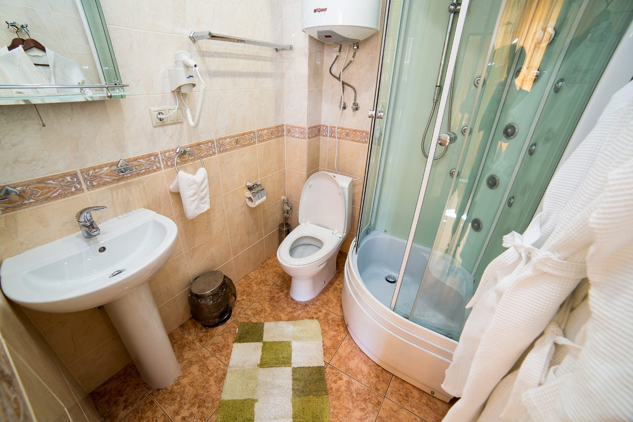 Санузел: с душевой кабиной, тапочки, туалетные принадлежности, фен, халат