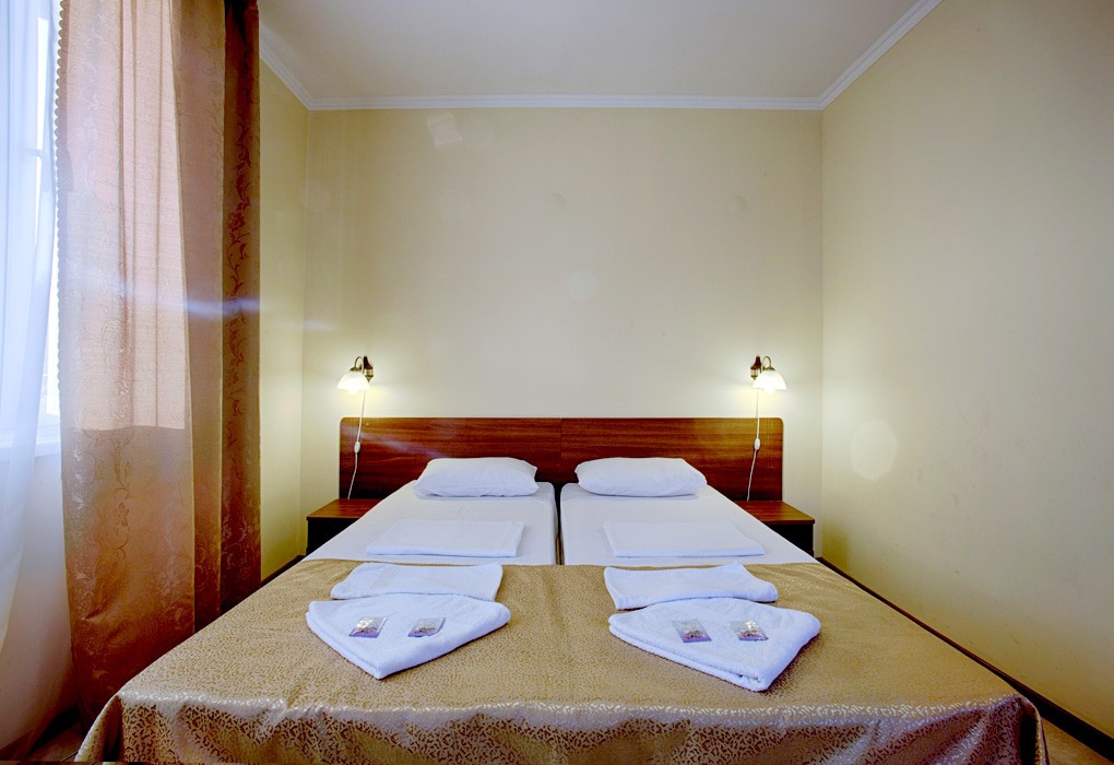 В номере: вешалка, зеркало, кровати односпальные, прикроватные тумбочки, стол, стул, шкаф, кондиционер, телевизор, холодильник