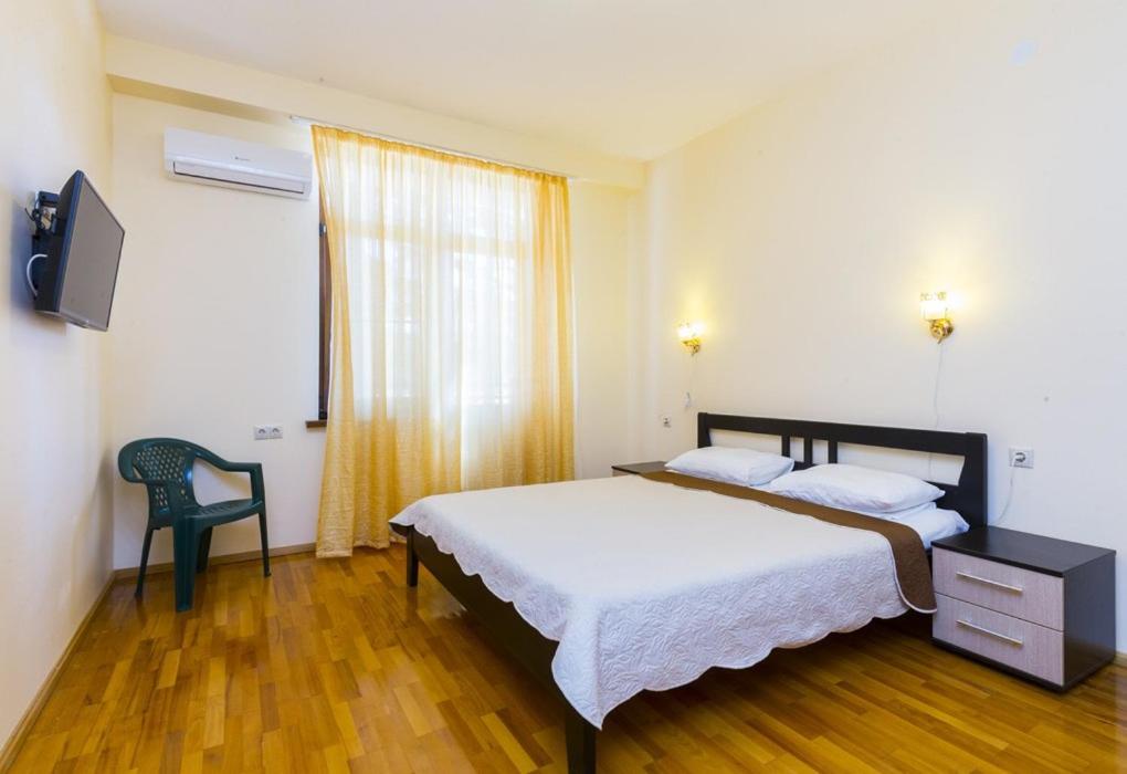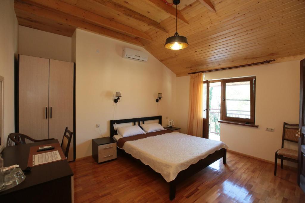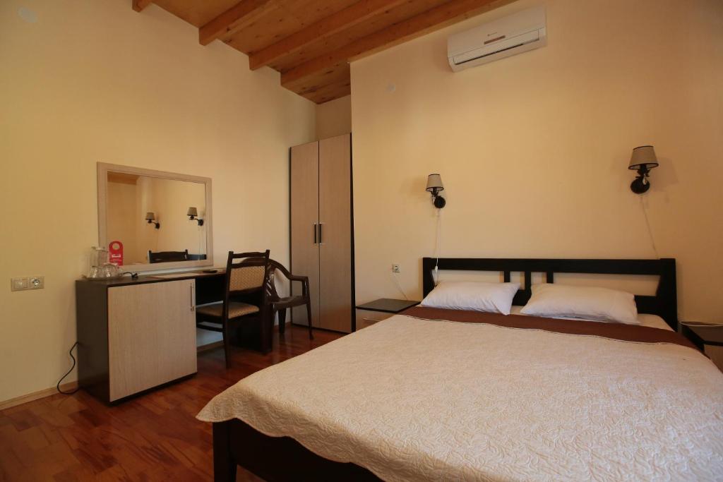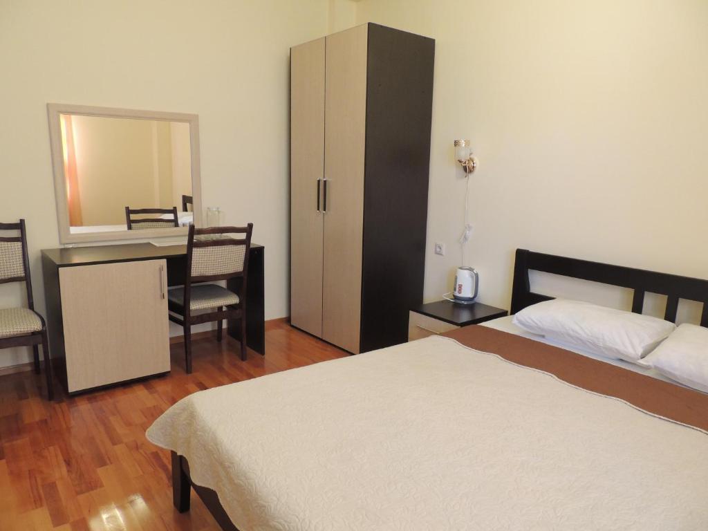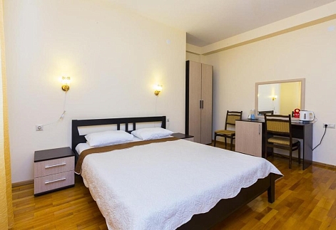 В номере: вешалка, зеркало, кровать двуспальная, прикроватные тумбочки, стол, столик туалетный, стулья, шкаф, кондиционер, мини-холодильник, пляжные полотенца, сейф, телевизор, чайный набор посуды, электрочайник