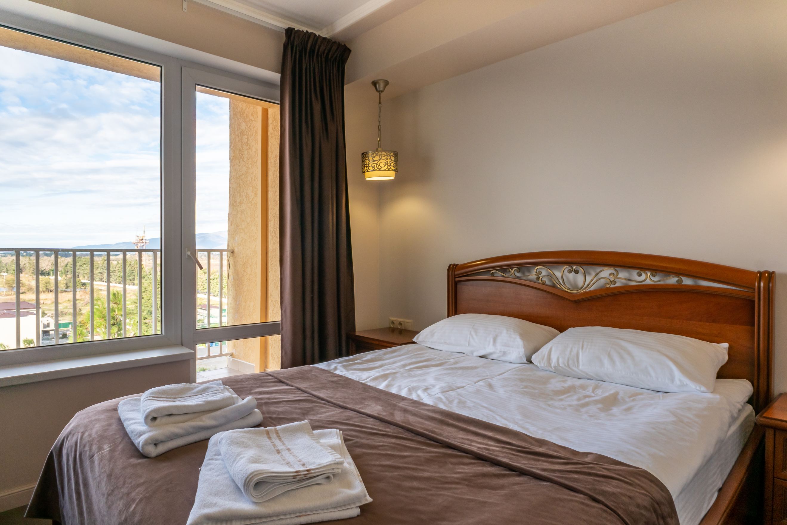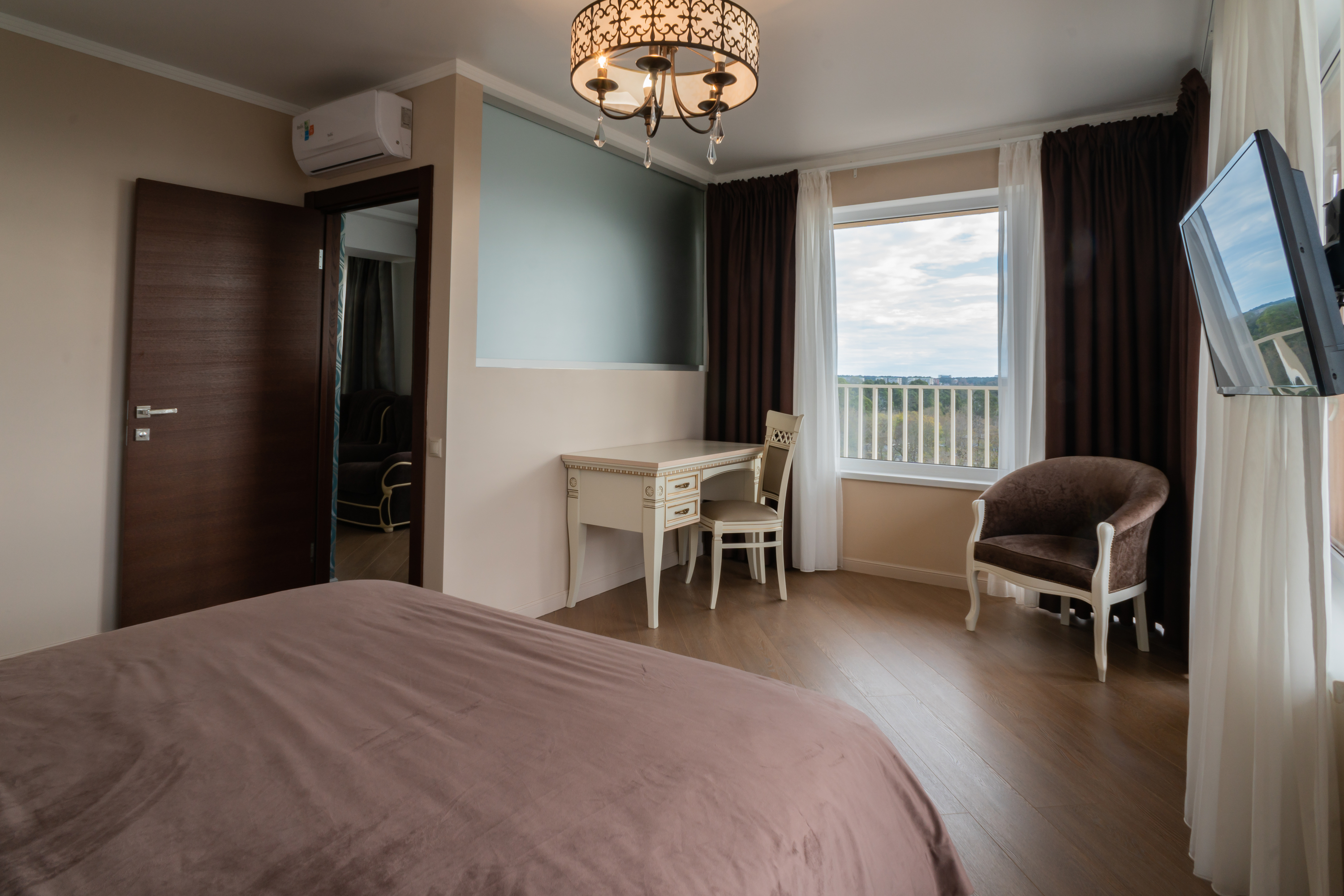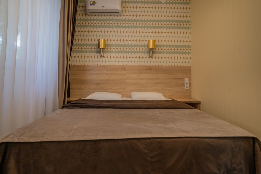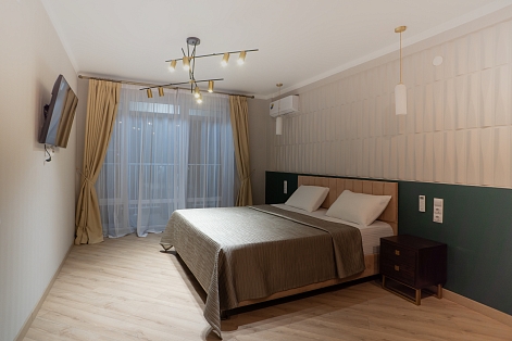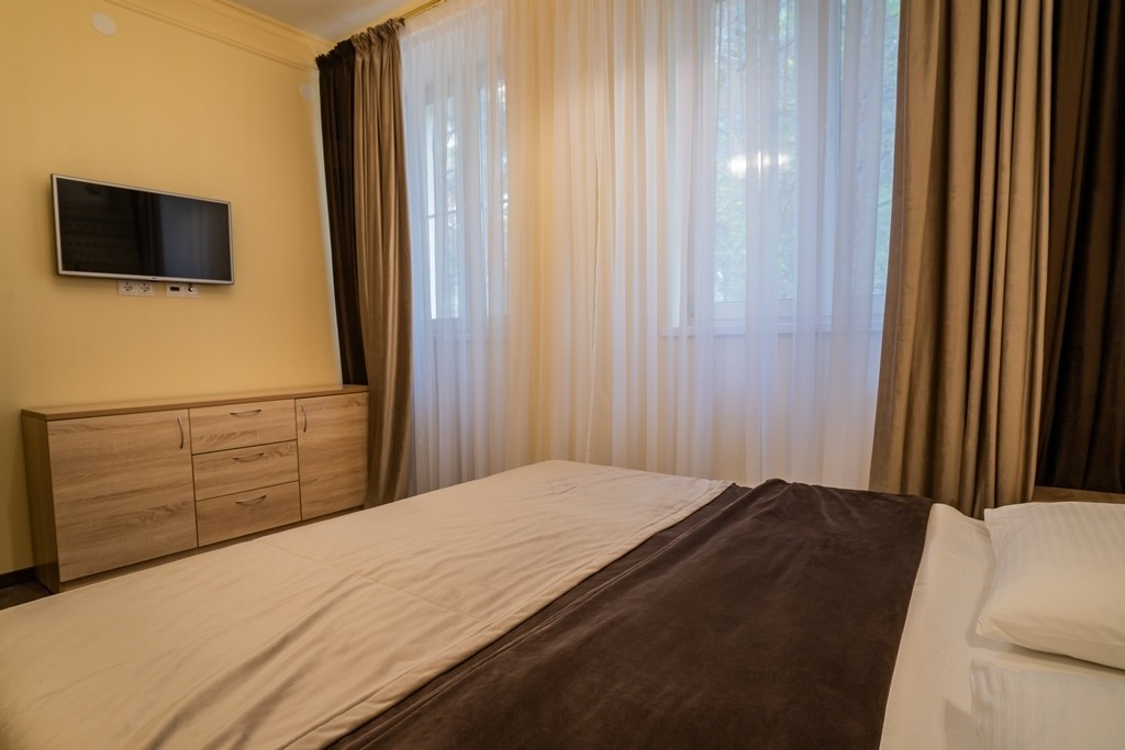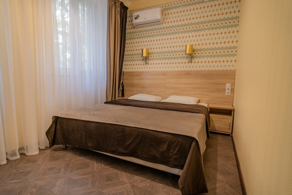 В номере: вешалка, зеркало, кровать двуспальная, набор мягкой мебели, прикроватные тумбочки, стол, стул, шкаф, кондиционер, телевизор, холодильник