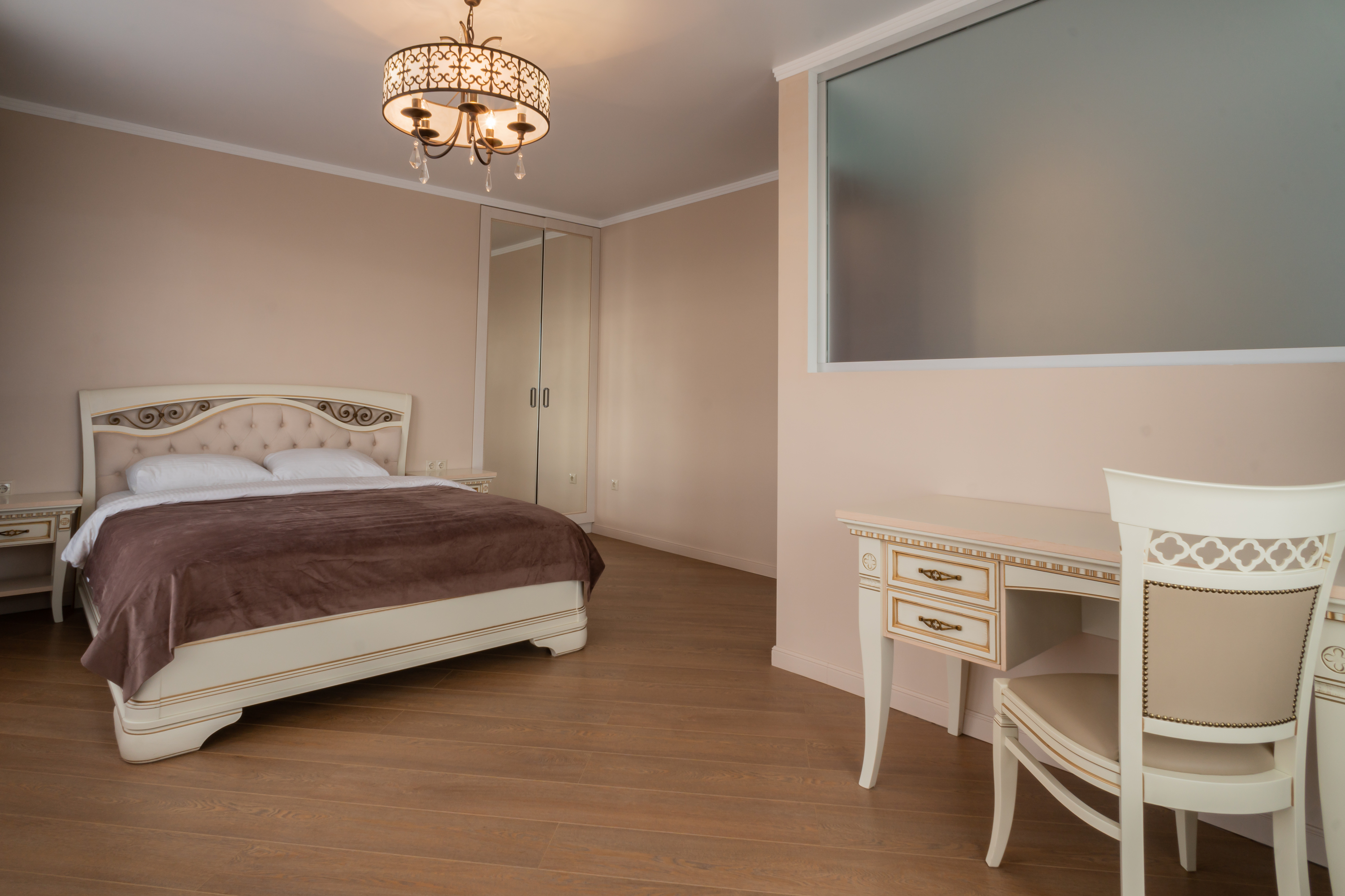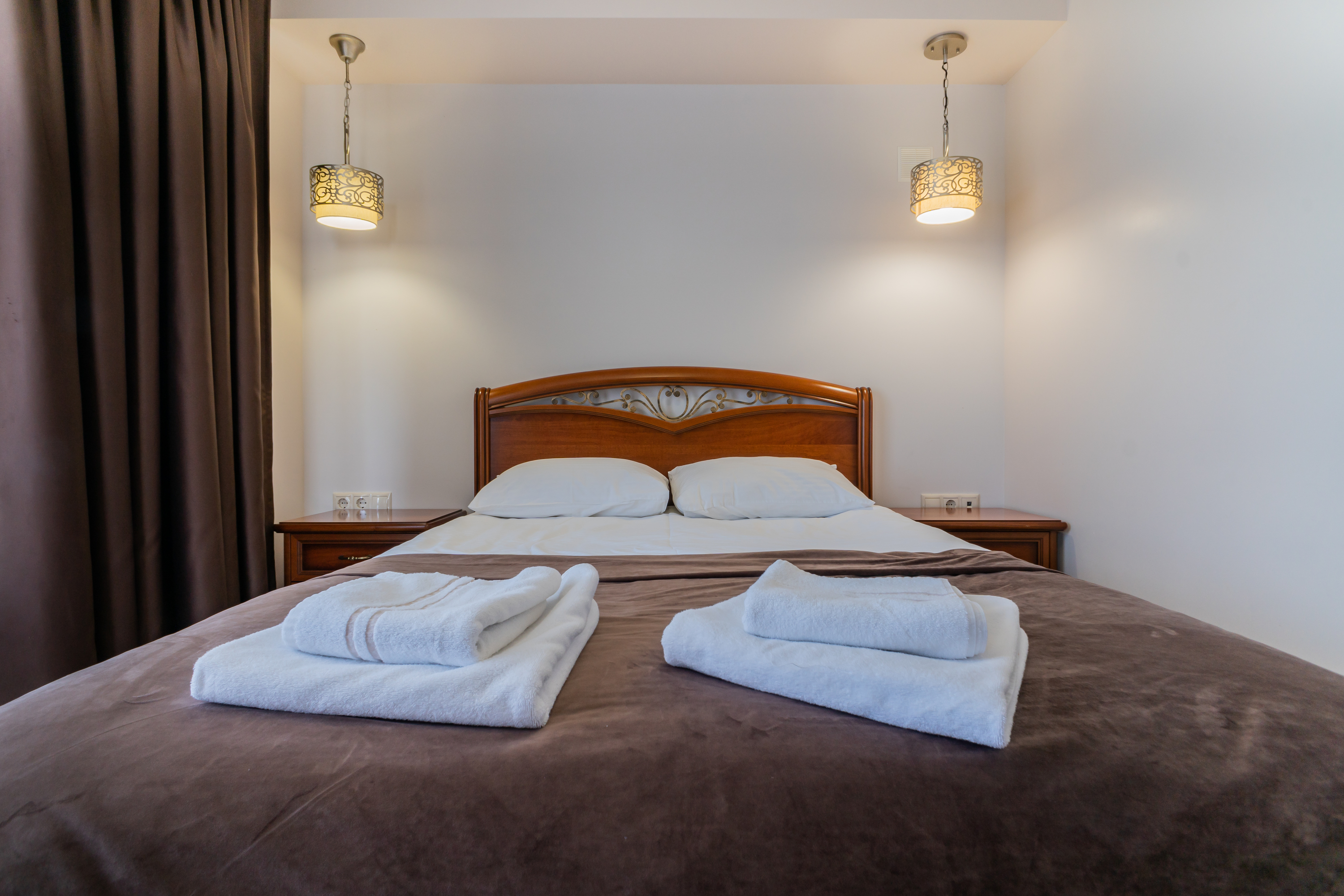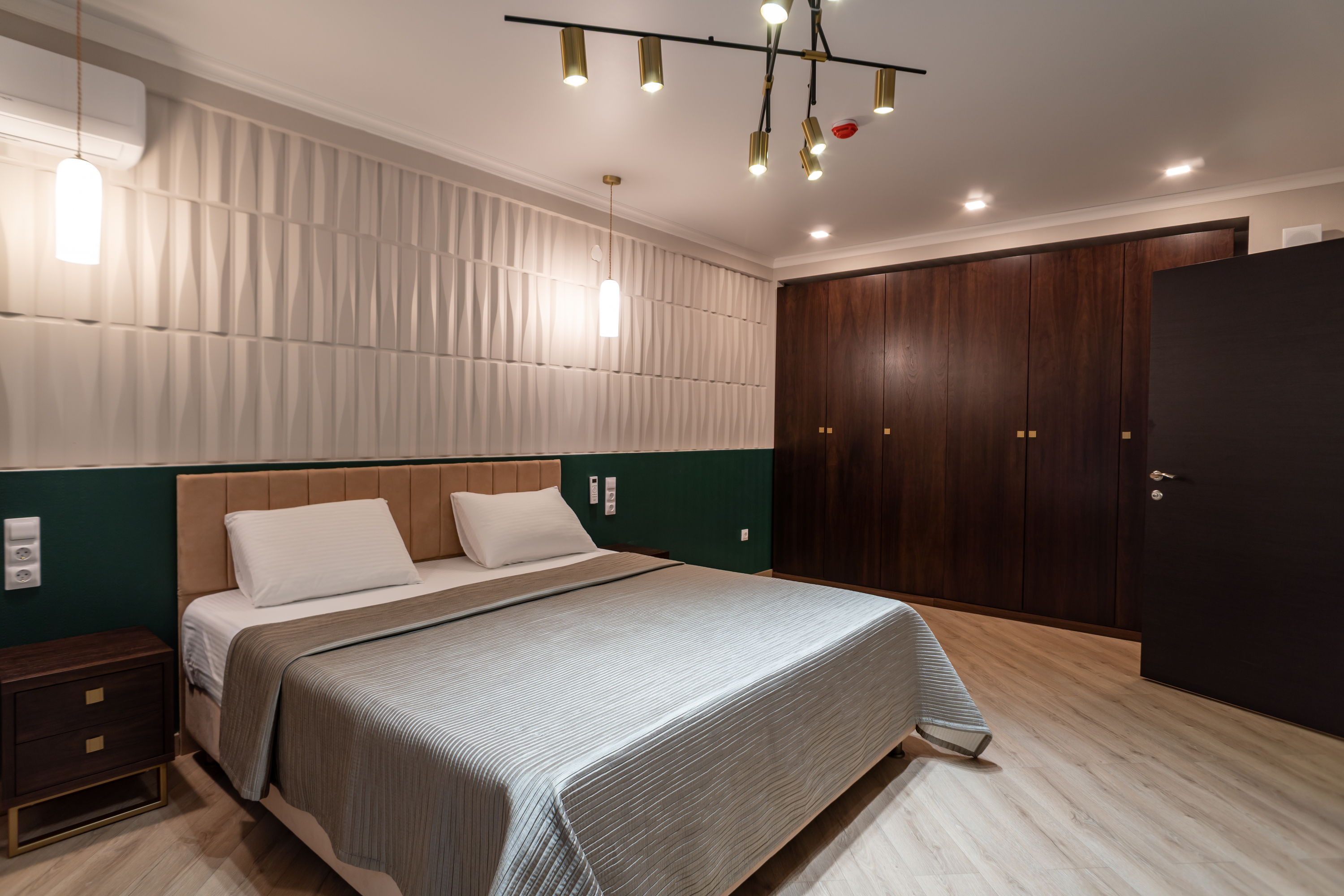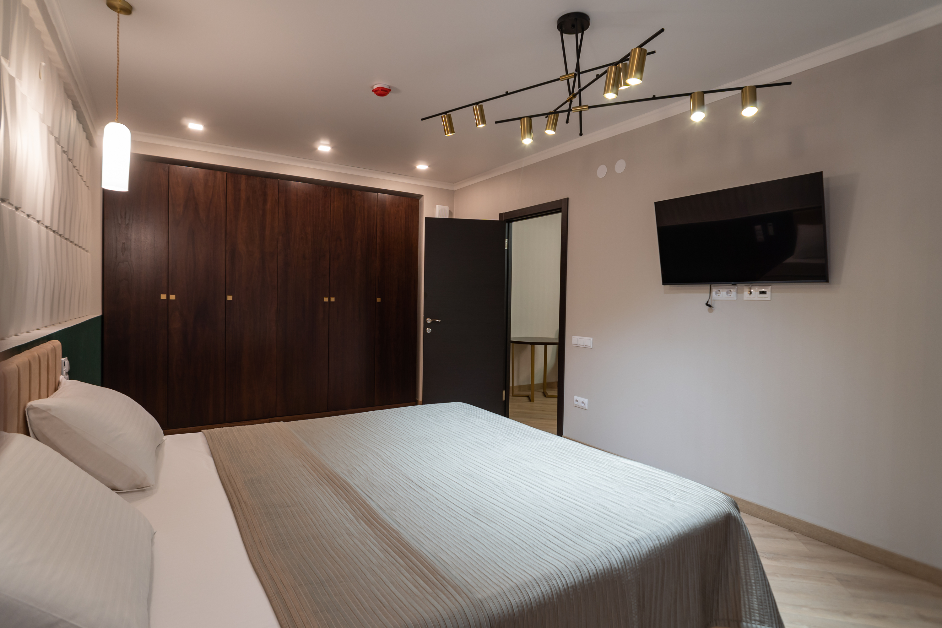 В номере: вешалка, зеркало, кровать двуспальная, набор мягкой мебели, прикроватные тумбочки, стол, стул, шкаф, кондиционер, телевизор, холодильник