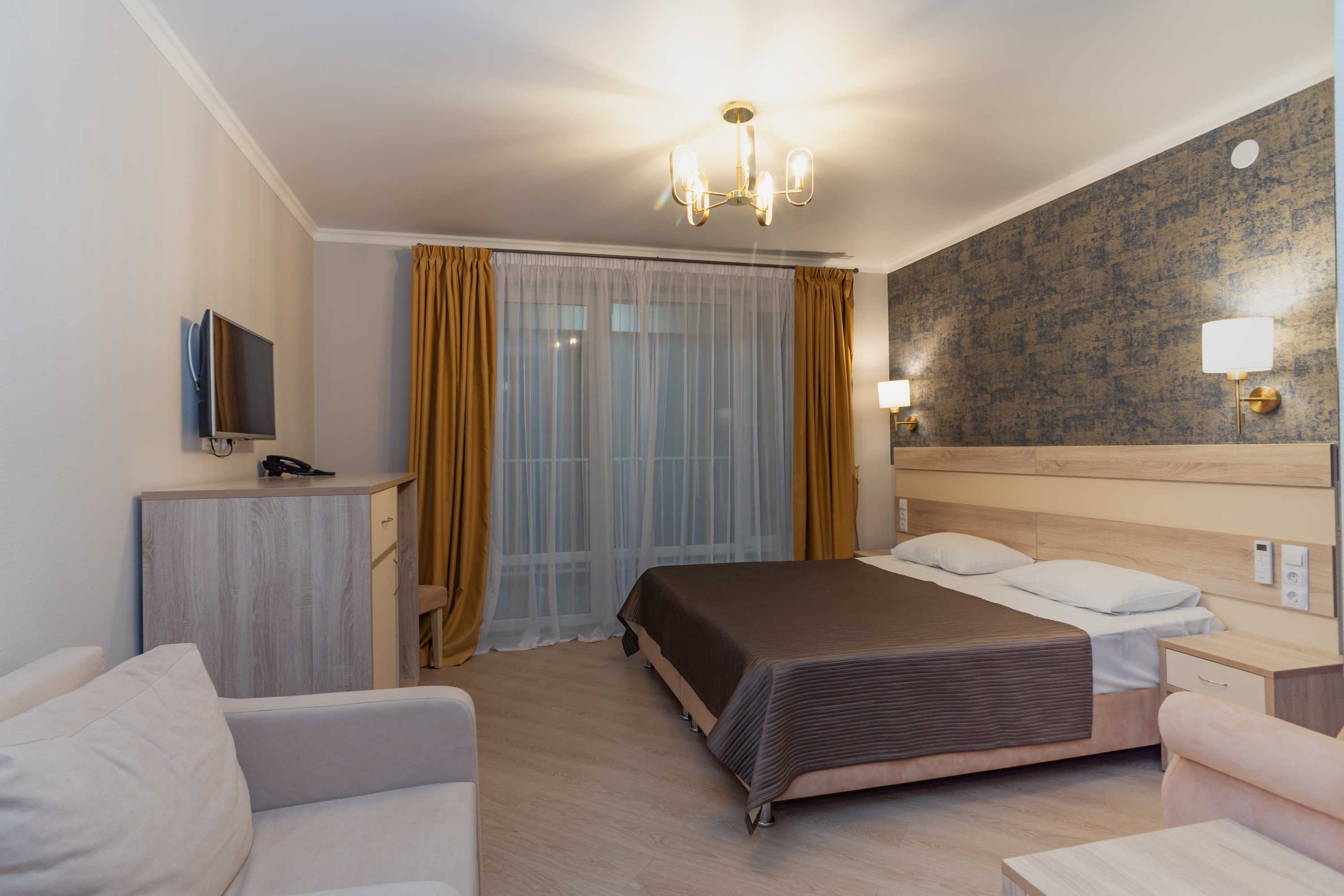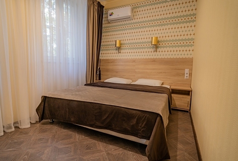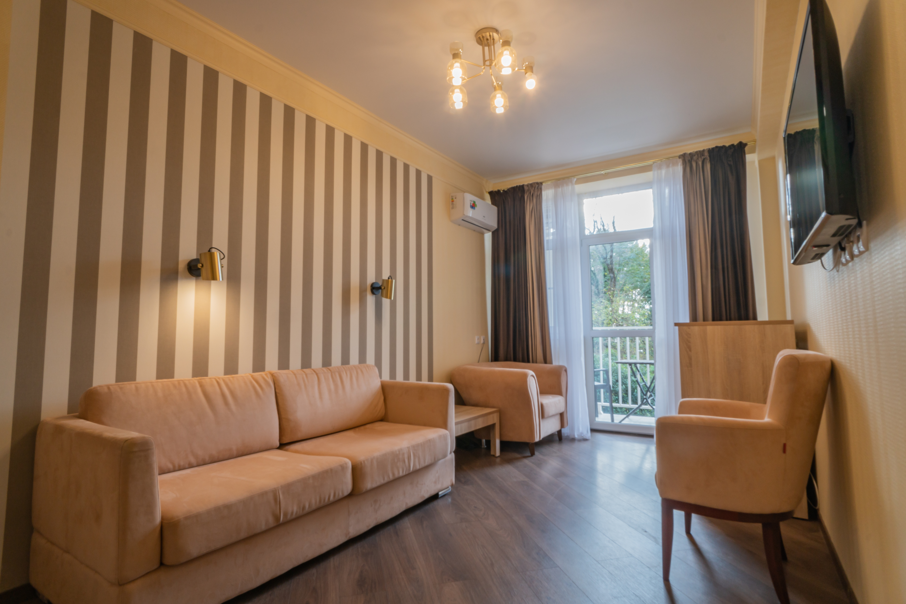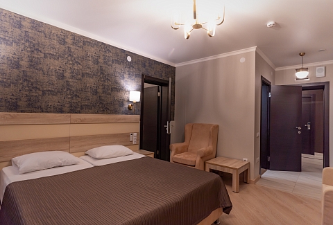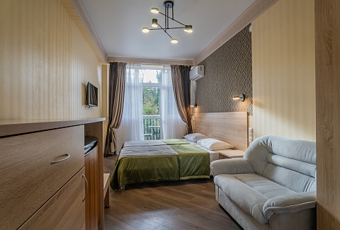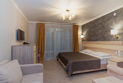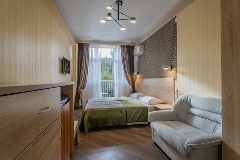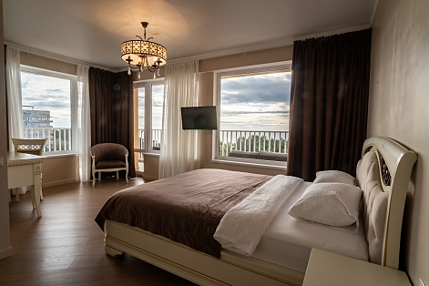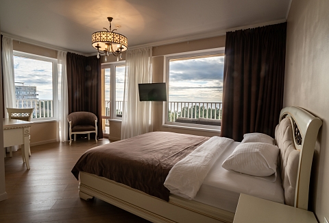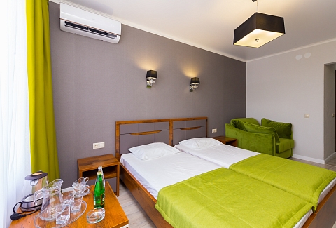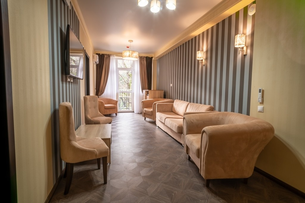 В номере: вешалка, диван раскладной, зеркало, кресла, кровати односпальные /одна двуспальная кровать, кровать двуспальная, прикроватные тумбочки, стол, столик журнальный, стулья, шкаф, кондиционер, мини-холодильник, телевизор, чайный набор посуды, электрочайник