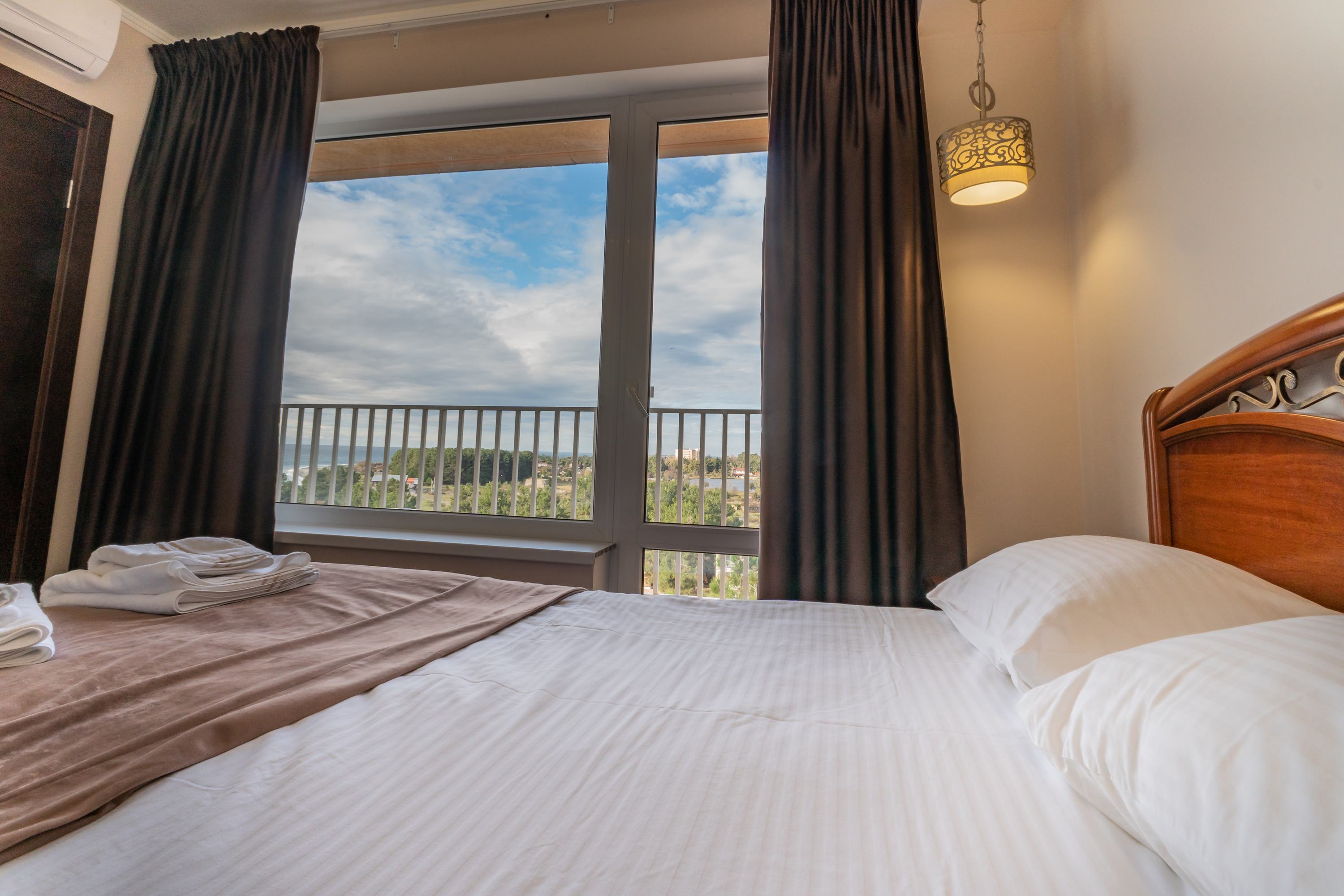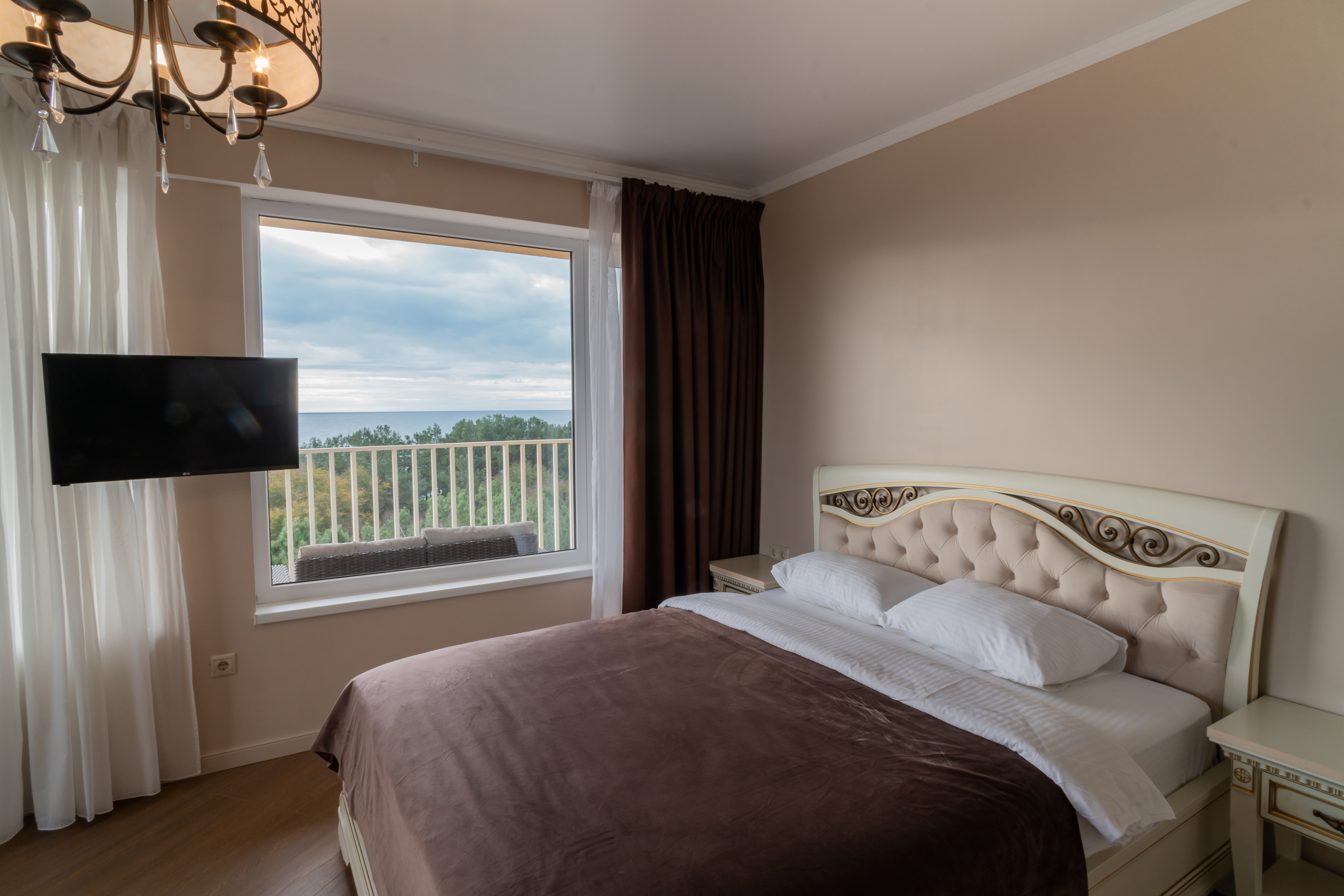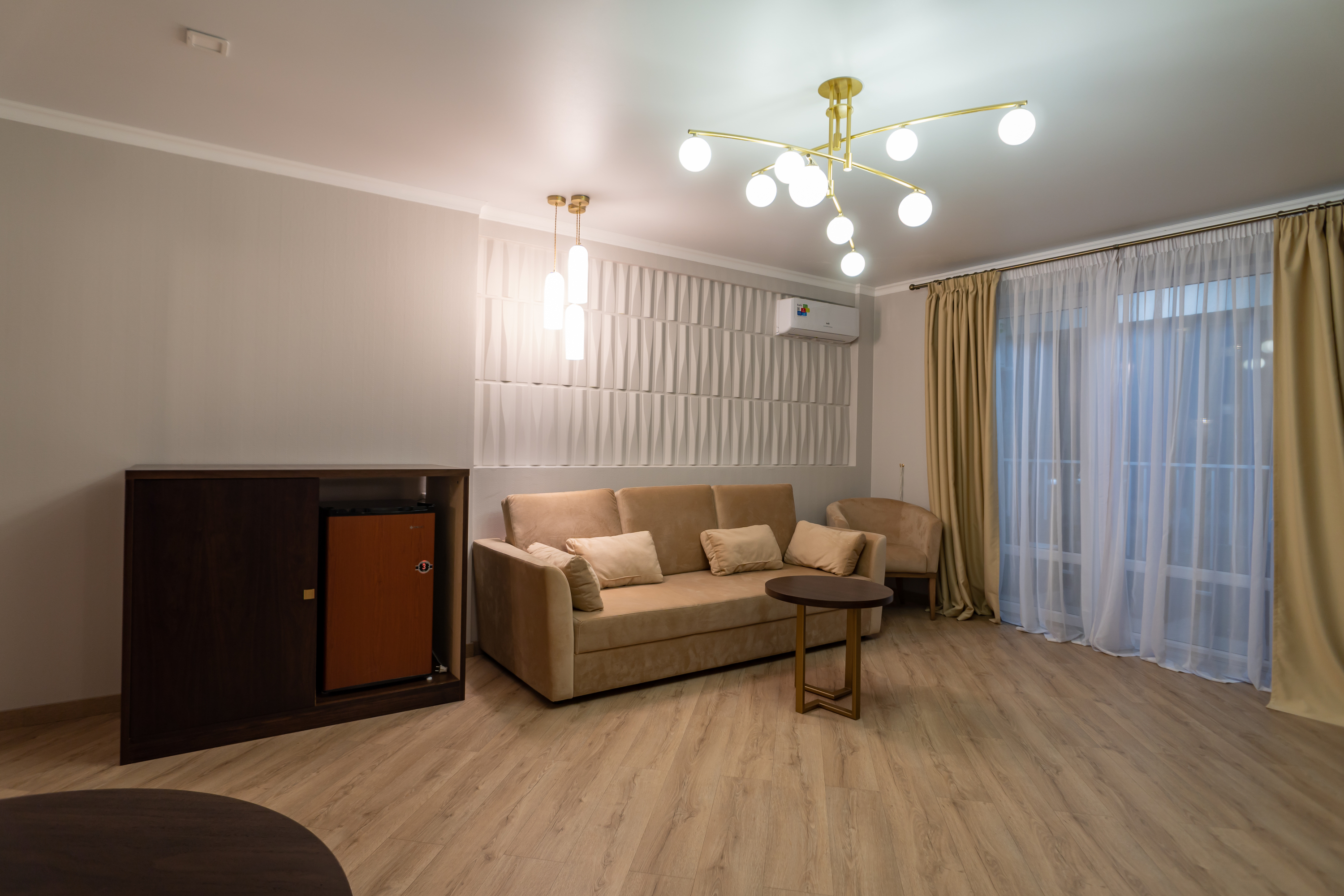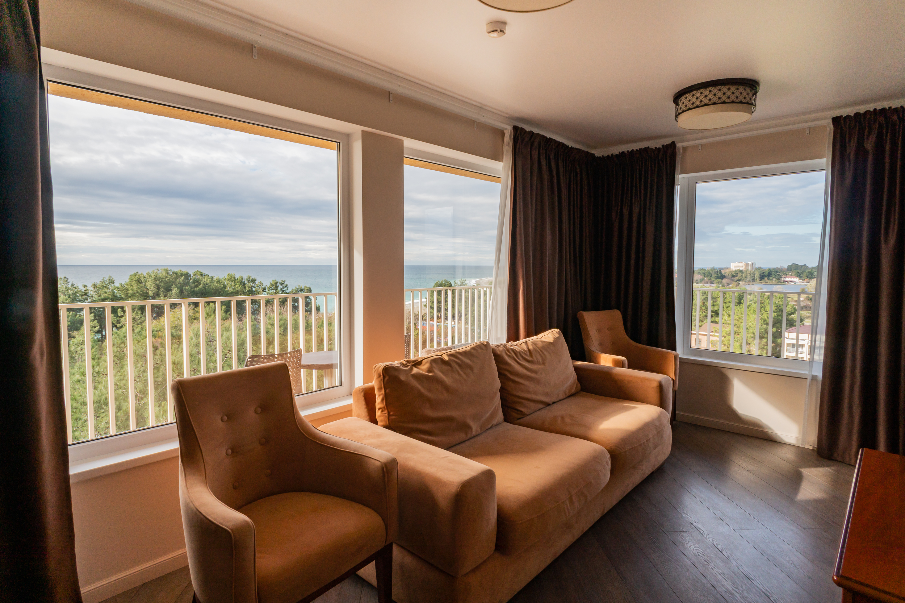 В номере: вешалка, диван раскладной, зеркало, кресла, кровати односпальные /одна двуспальная кровать, кровать двуспальная, прикроватные тумбочки, стол, столик журнальный, стулья, шкаф, кондиционер, мини-холодильник, телевизор, чайный набор посуды, электрочайник