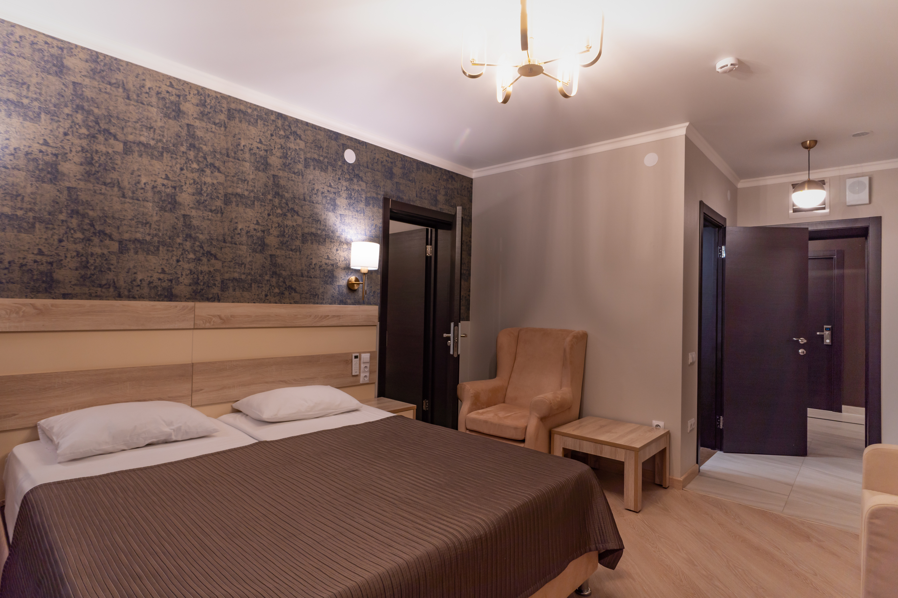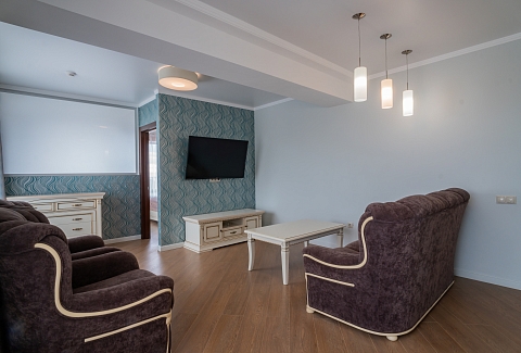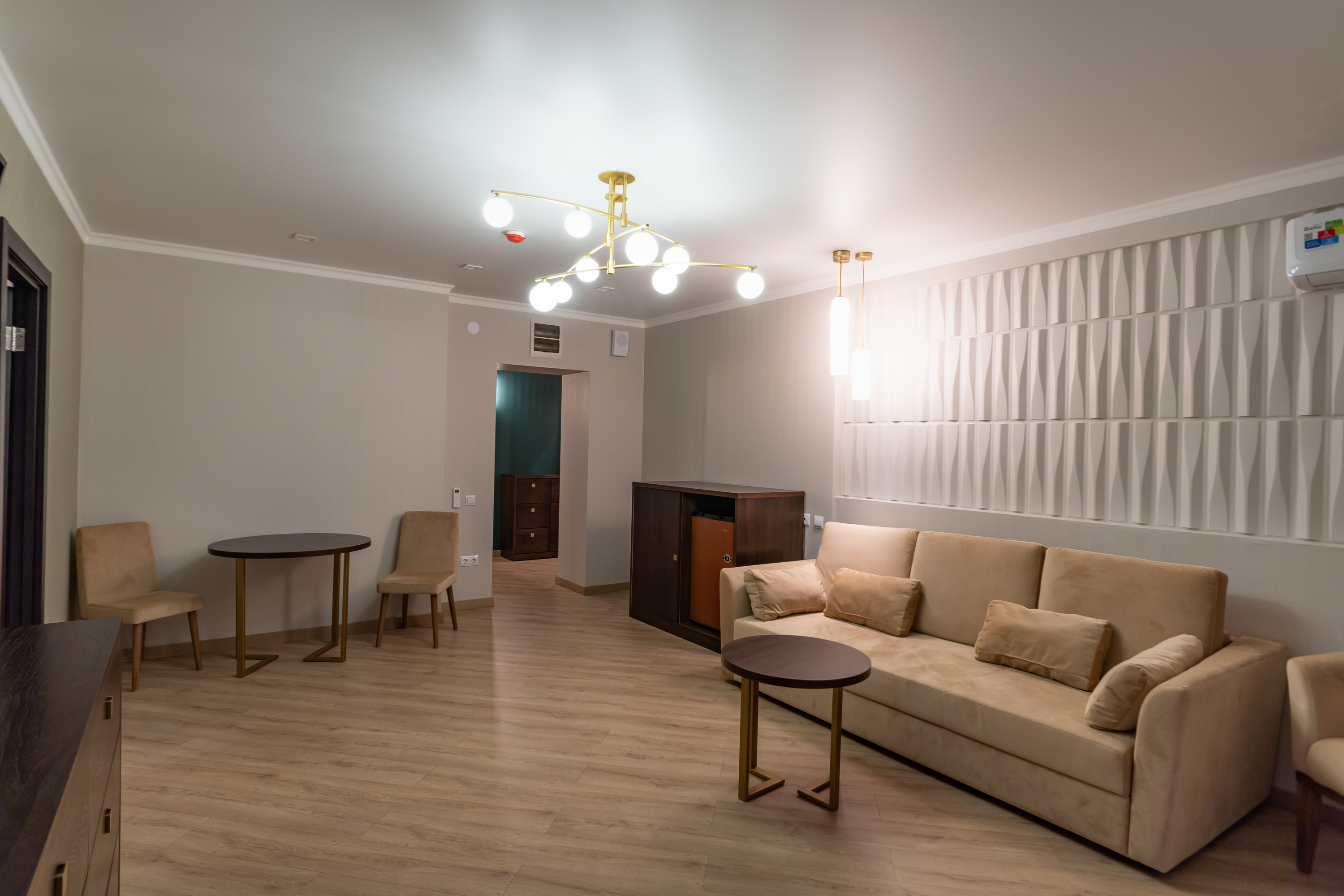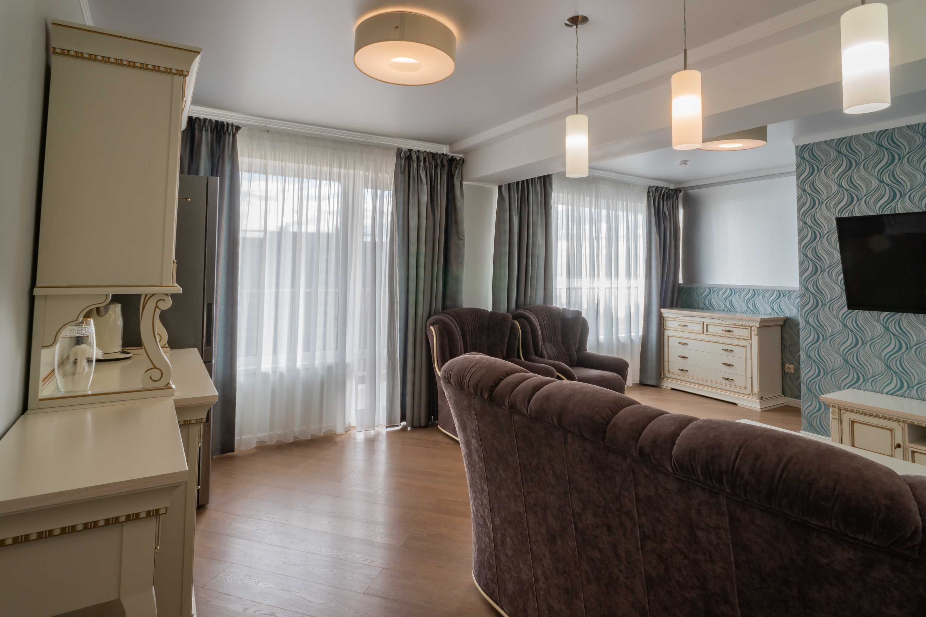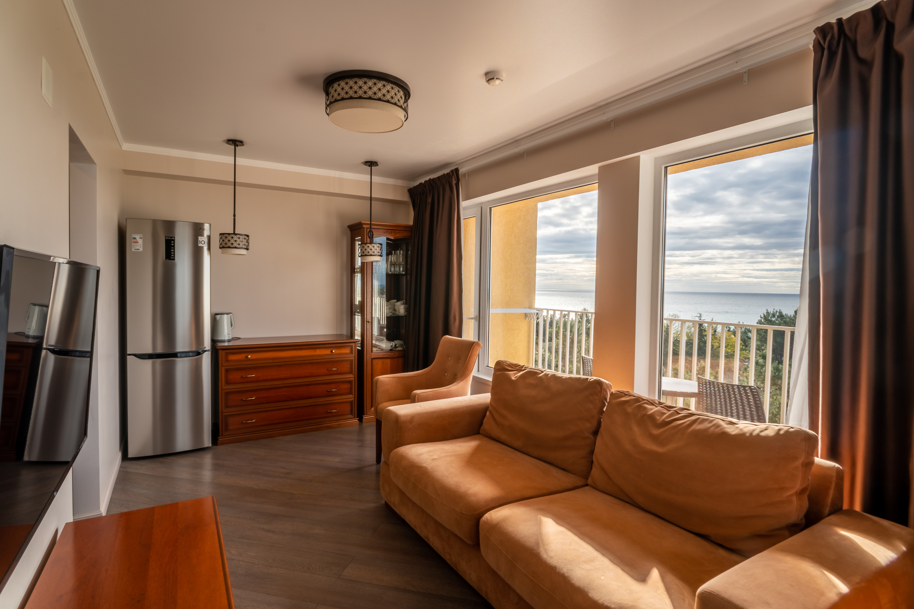 В номере: вешалка, диван раскладной, зеркало, кресла, кровати односпальные /одна двуспальная кровать, кровать двуспальная, прикроватные тумбочки, стол, столик журнальный, стулья, шкаф, кондиционер, мини-холодильник, телевизор, чайный набор посуды, электрочайник