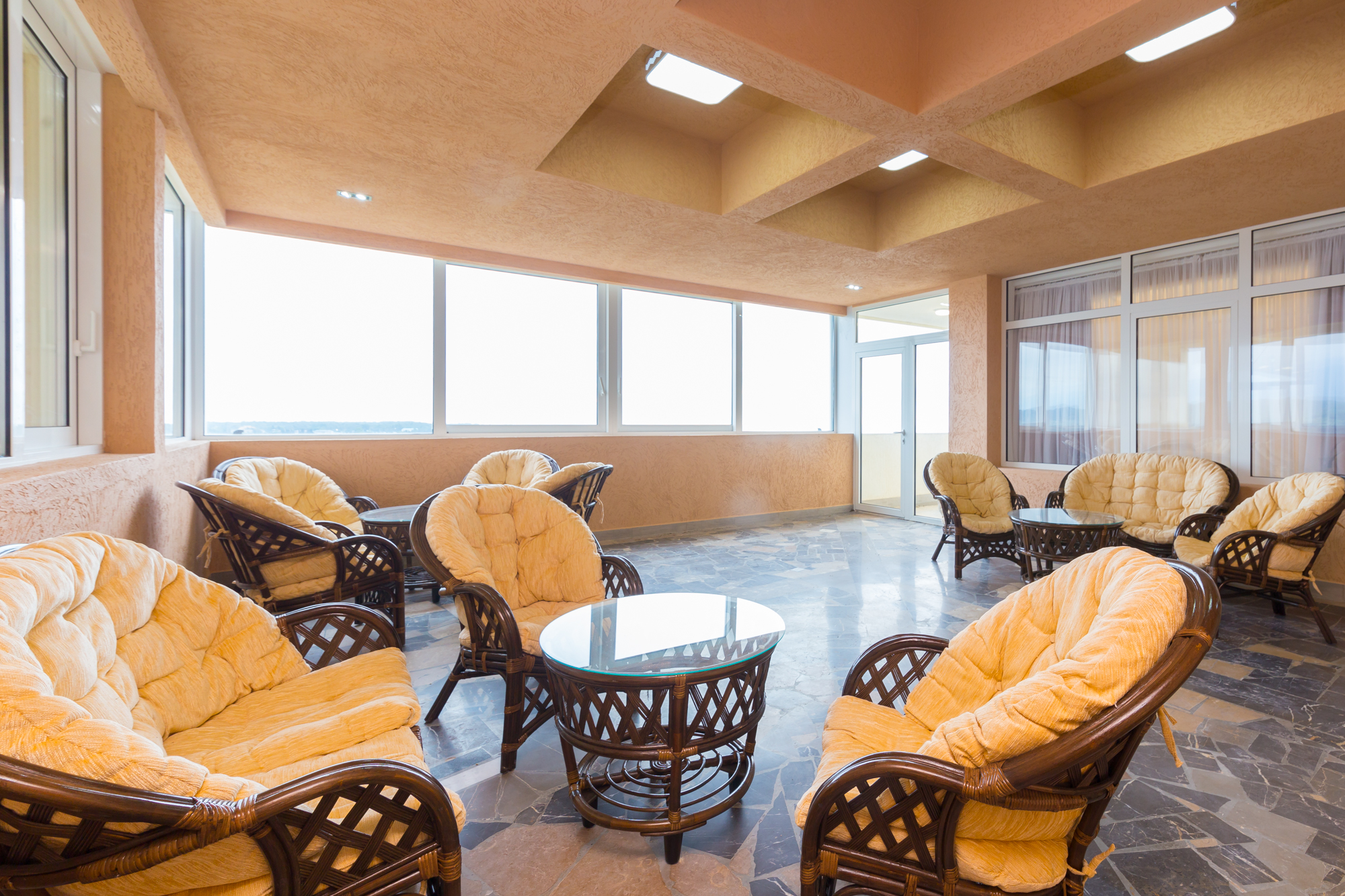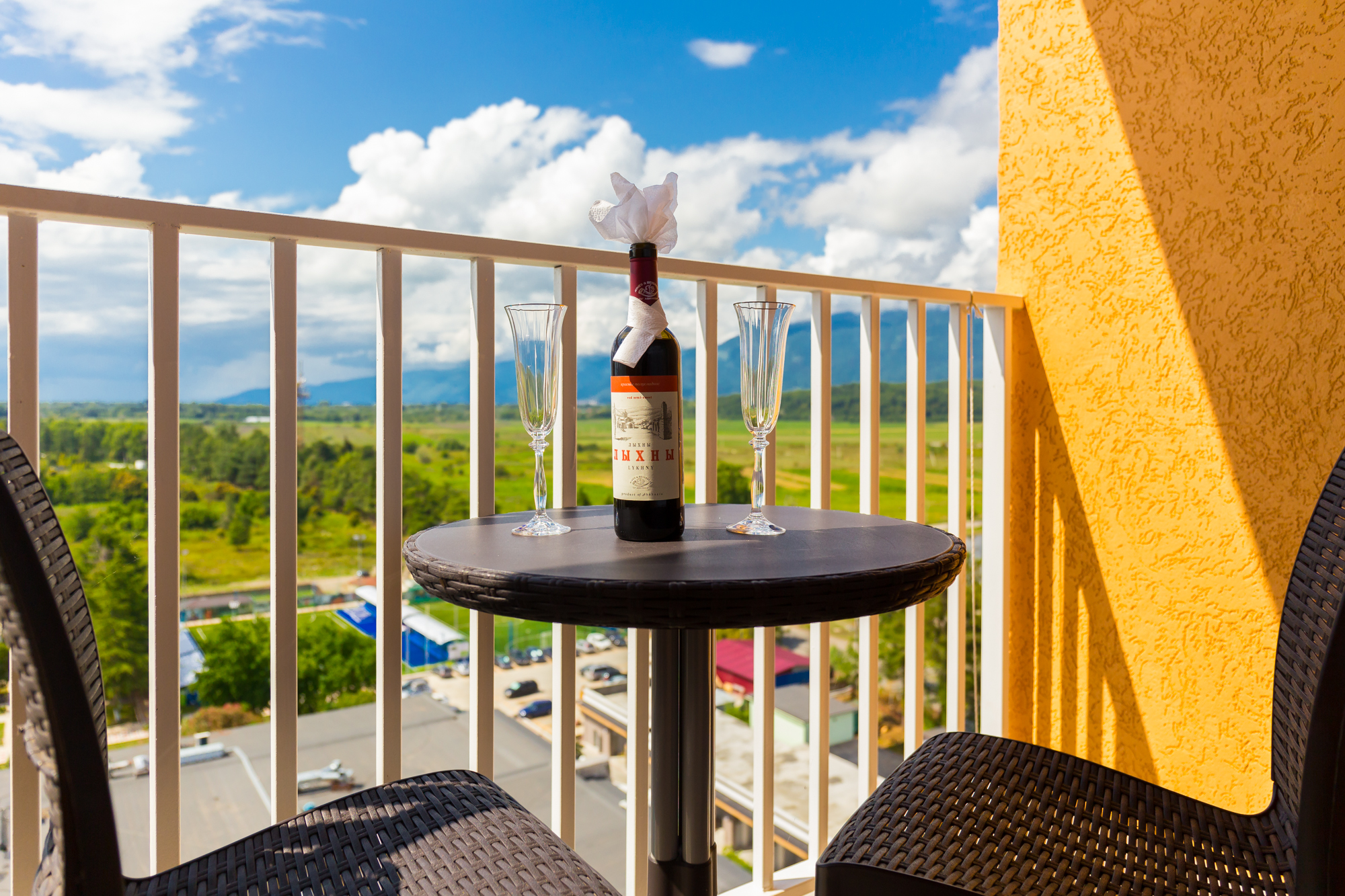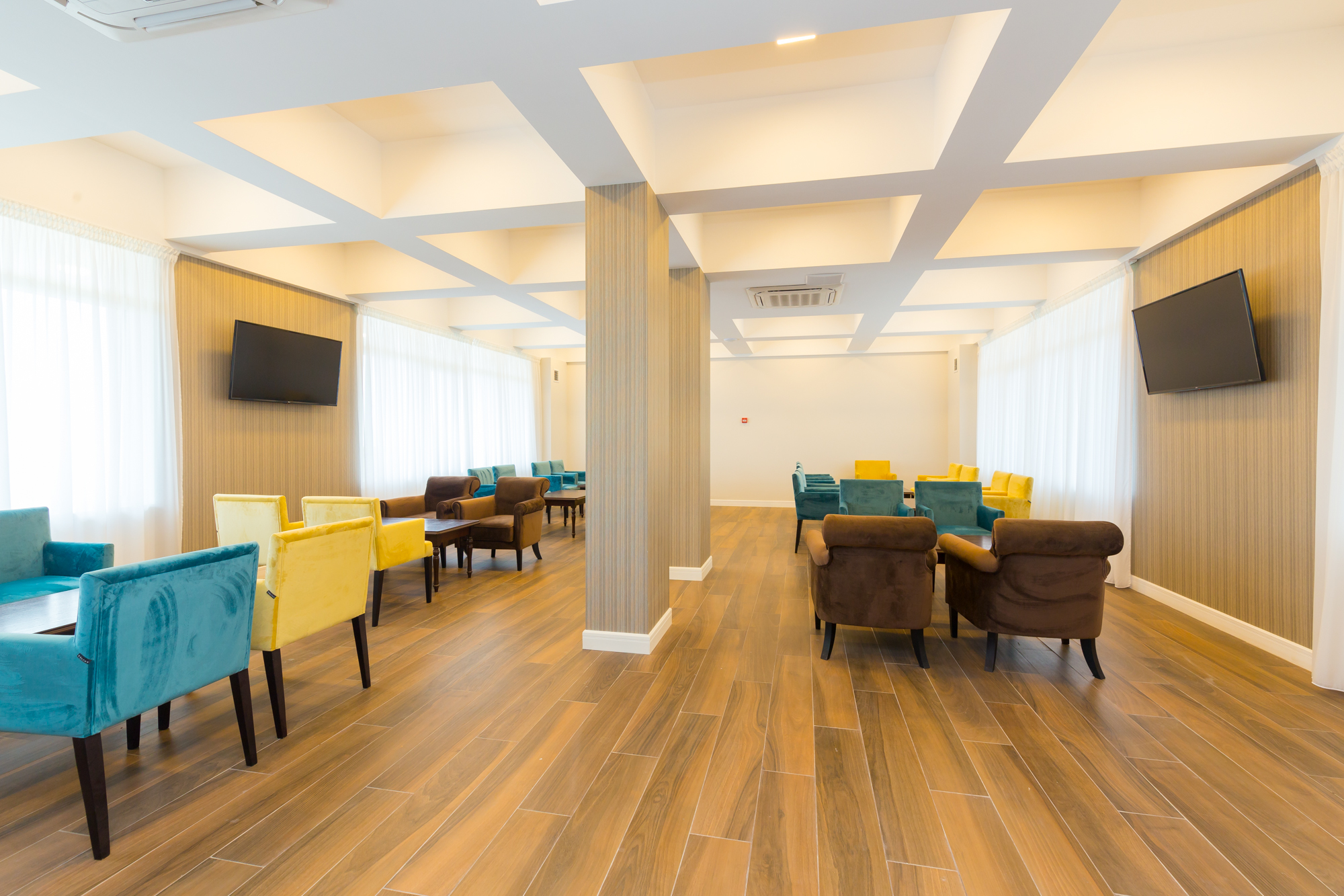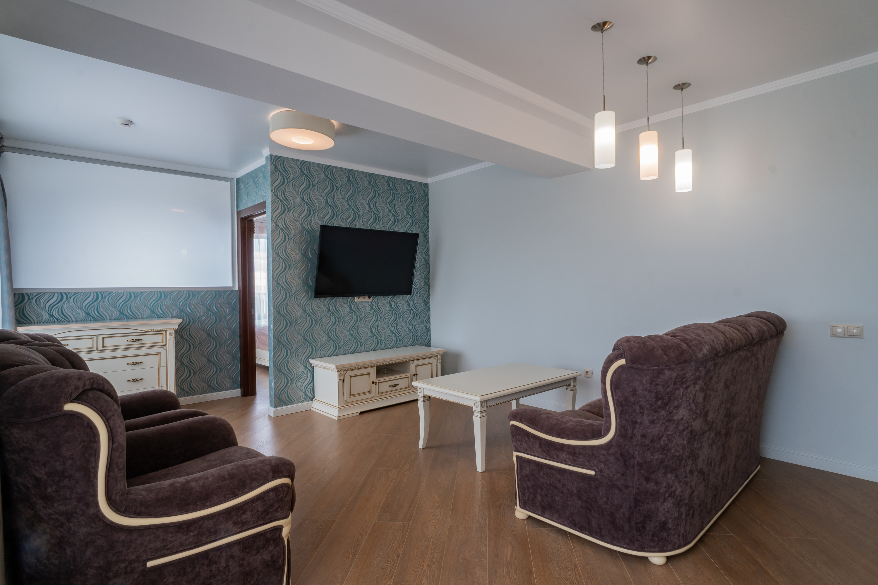 В номере: вешалка, диван раскладной, зеркало, кресла, кровати односпальные /одна двуспальная кровать, кровать двуспальная, прикроватные тумбочки, стол, столик журнальный, стулья, шкаф, кондиционер, мини-холодильник, телевизор, чайный набор посуды, электрочайник