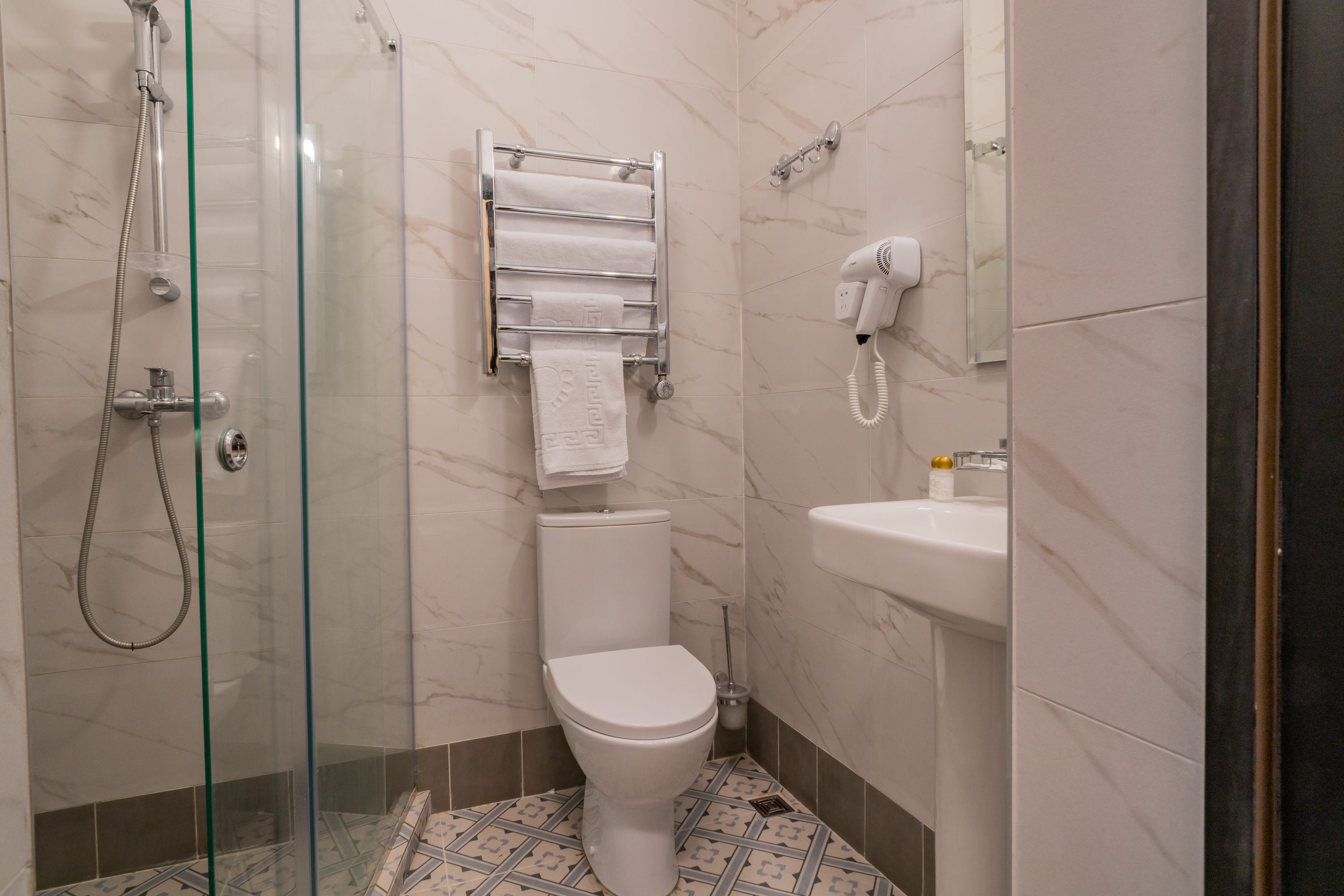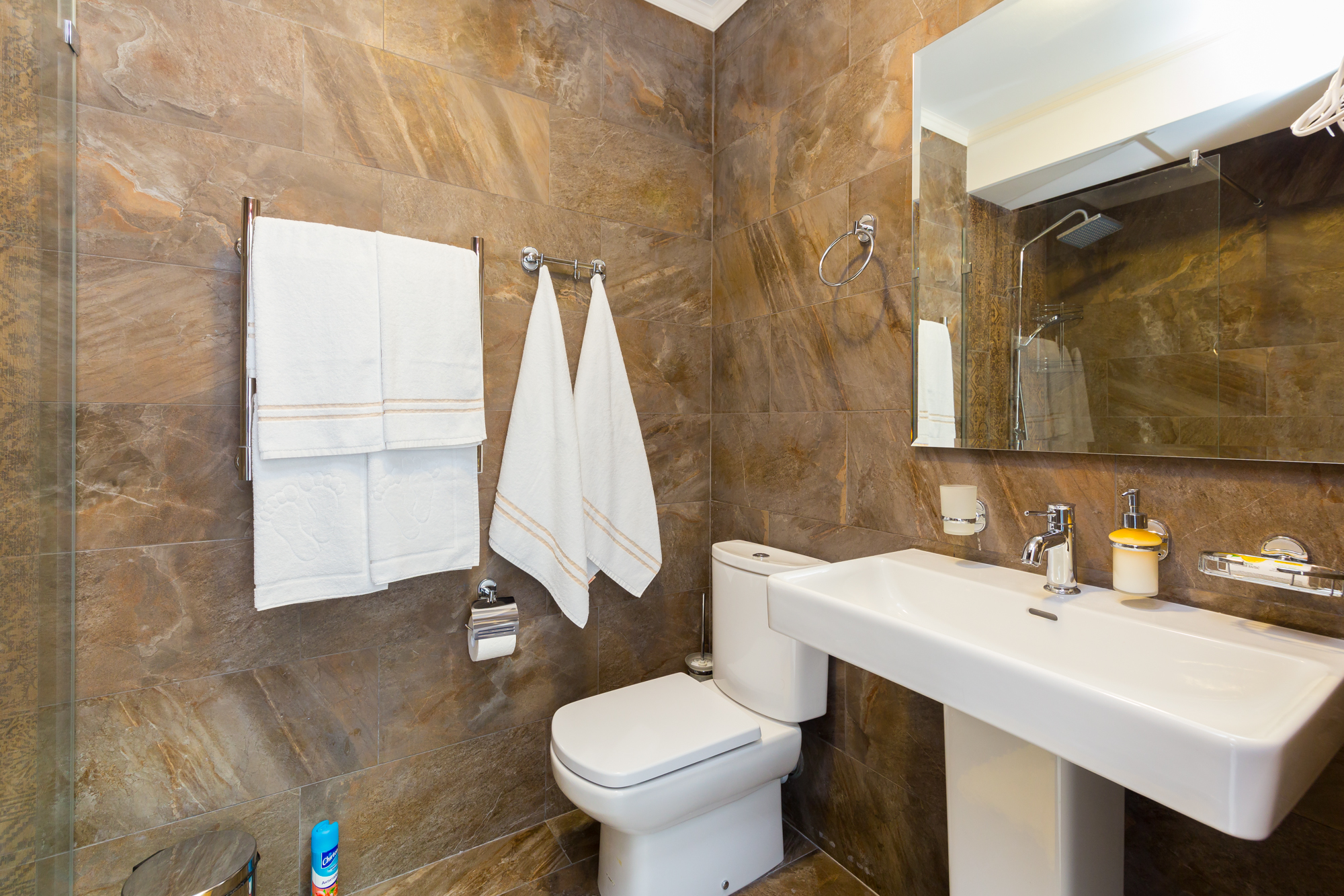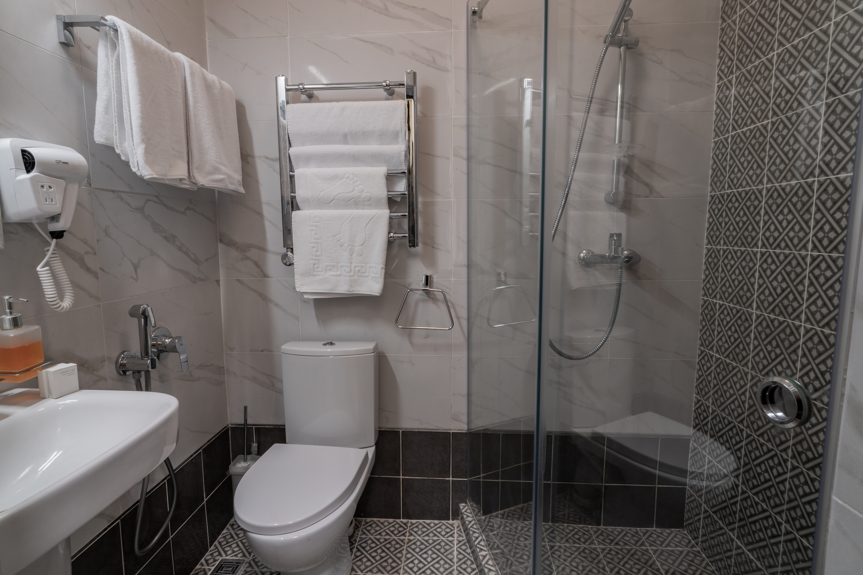 Санузел: с душем, тапочки, туалетные принадлежности, фен, халат