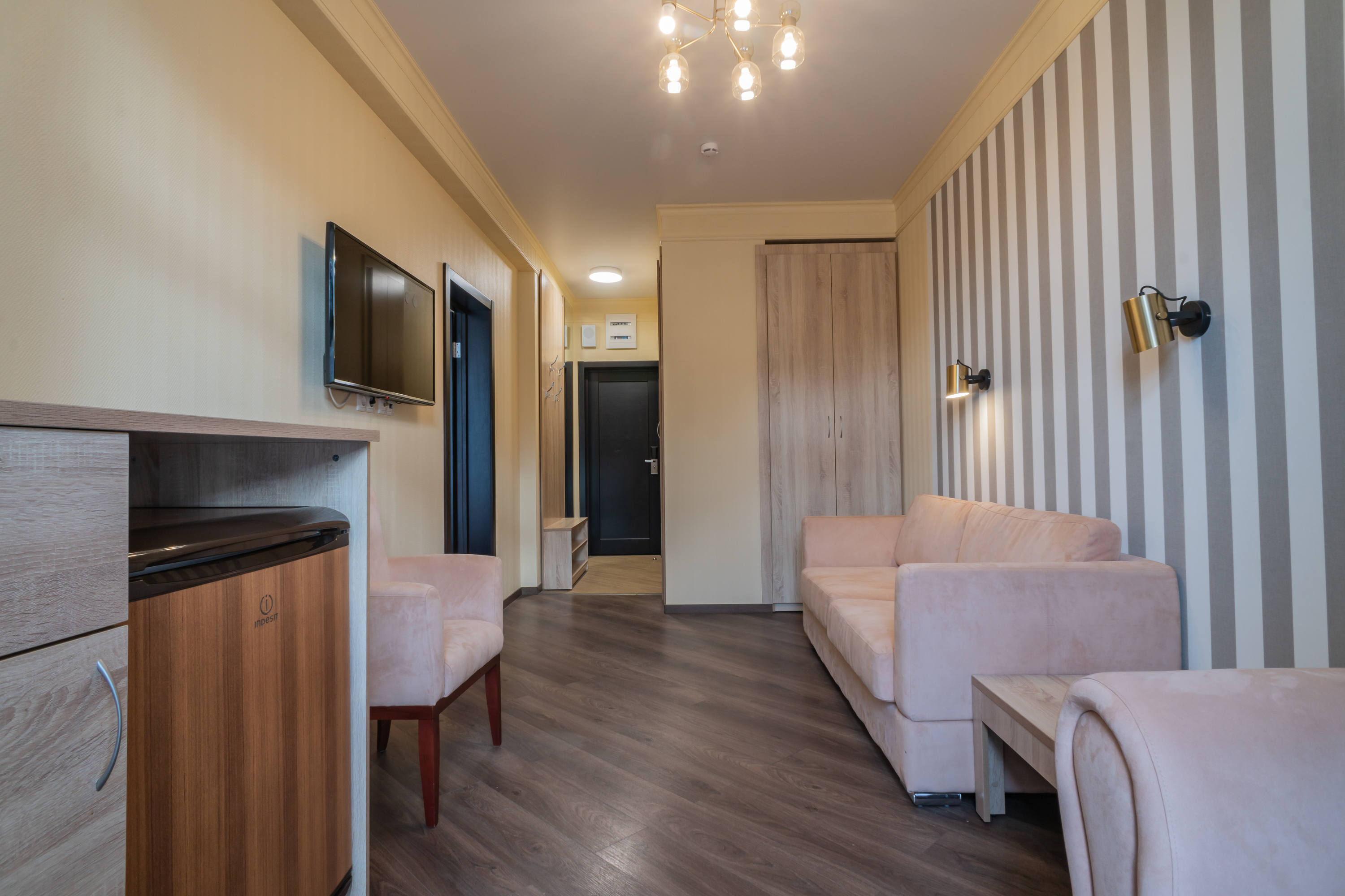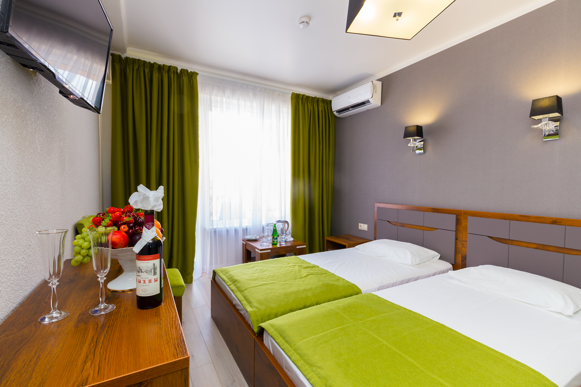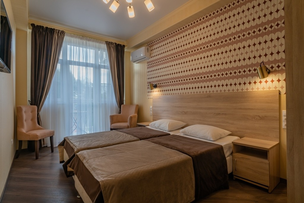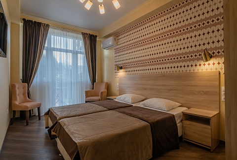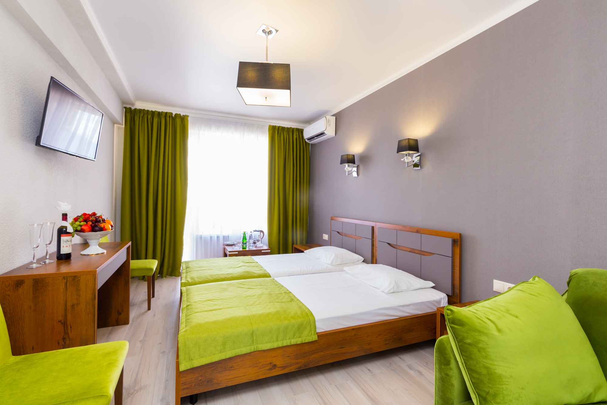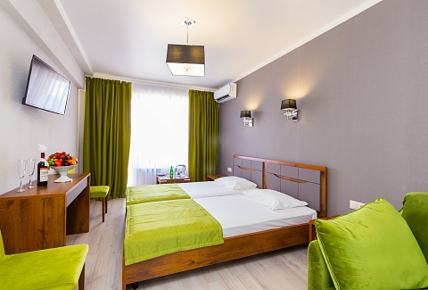 В номере: вешалка, зеркало, кровати односпальные /одна двуспальная кровать, набор мягкой мебели, прикроватные тумбочки, стол, стул, шкаф, кондиционер, телевизор, холодильник