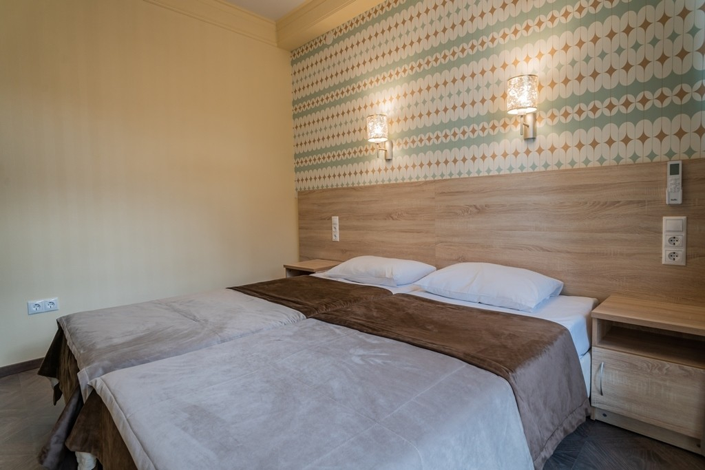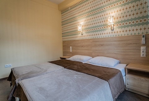В номере: вешалка, зеркало, кровати односпальные /одна двуспальная кровать, прикроватные тумбочки, стол, стул, шкаф, кондиционер, телевизор, холодильник