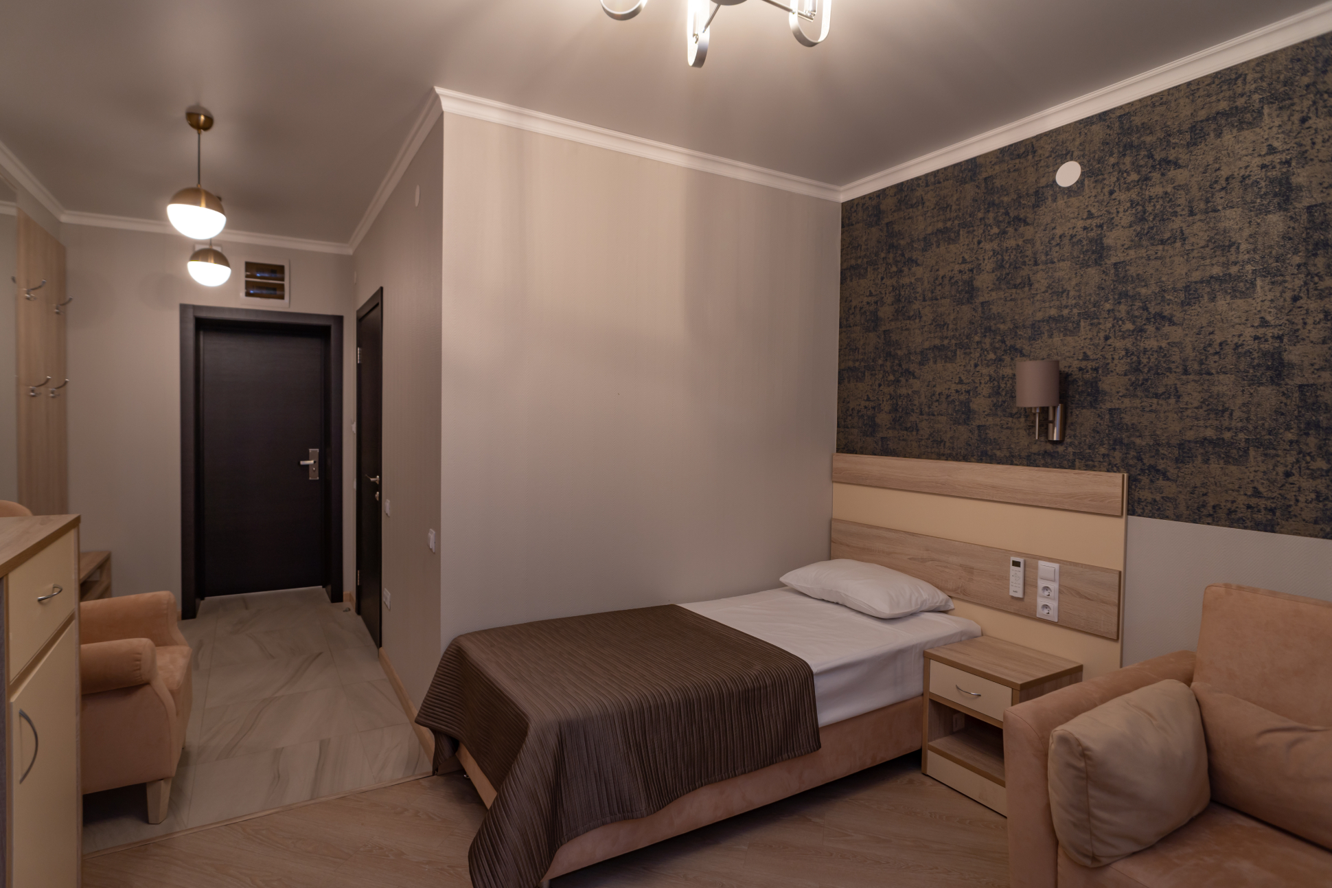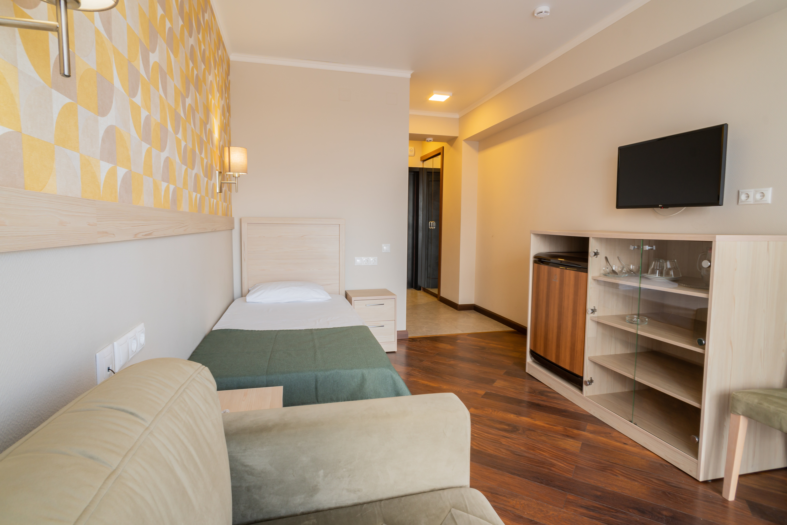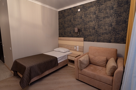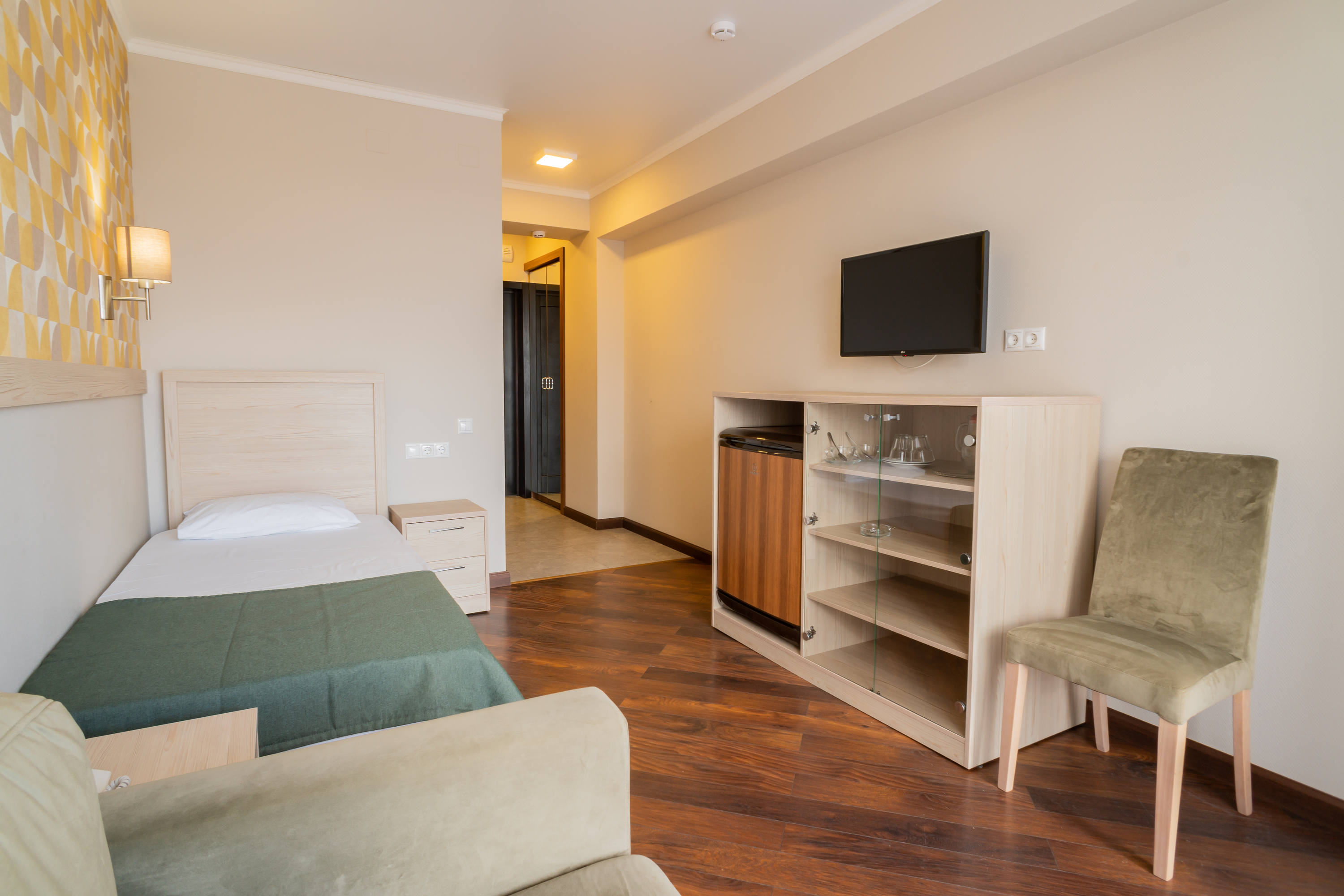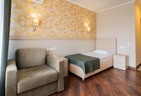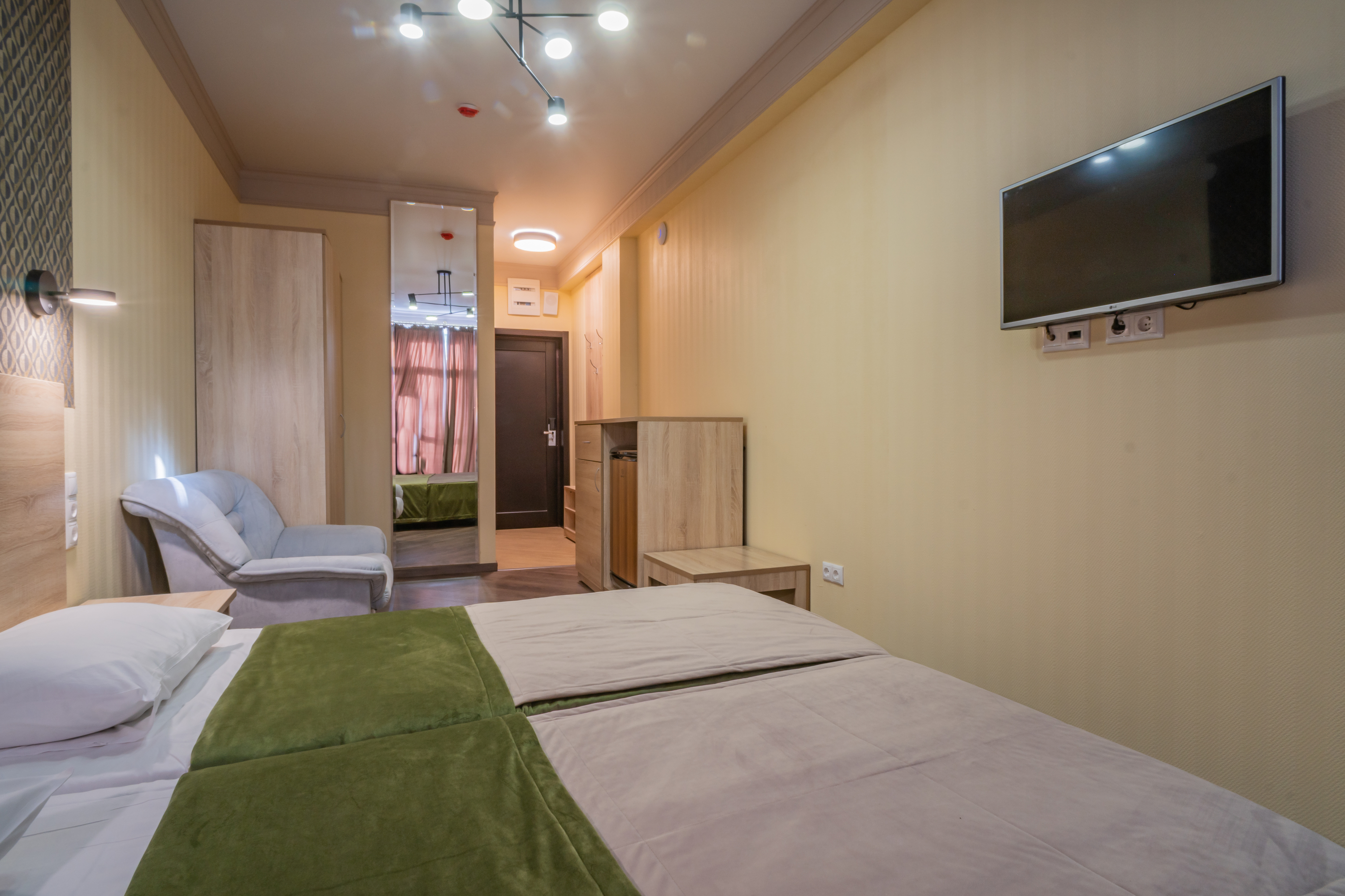 В номере: вешалка, зеркало, кровать односпальная, прикроватная тумбочка, шкаф, кондиционер, телевизор, холодильник