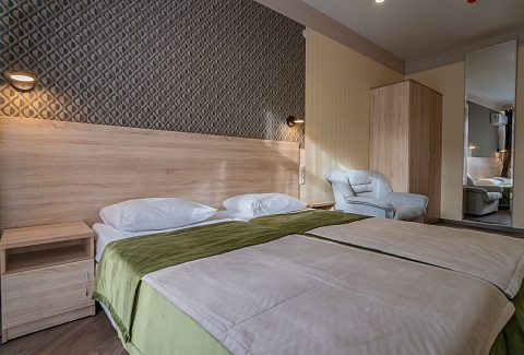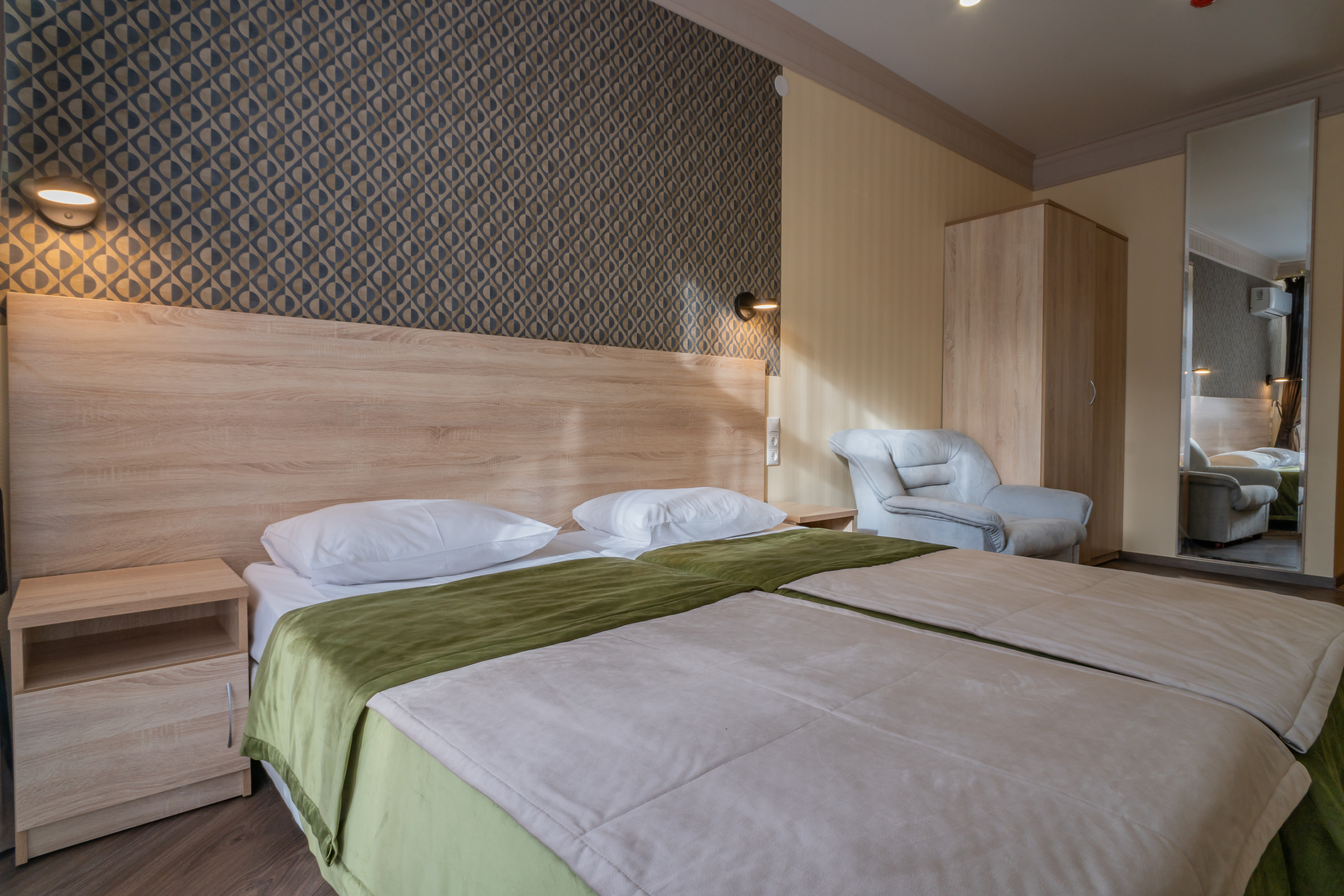 В номере: вешалка, зеркало, кресло, кровати односпальные /одна двуспальная кровать, прикроватные тумбочки, стол, стул, шкаф, кондиционер, телевизор, холодильник
