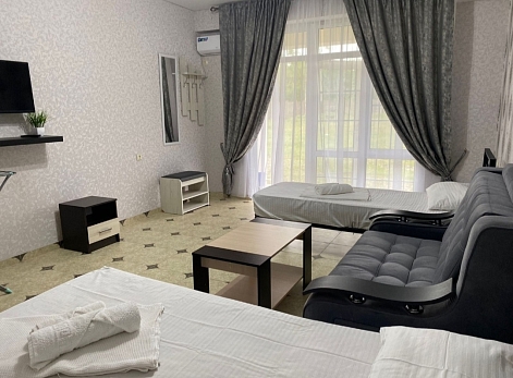 В номере: вешалка, диван, зеркало, кровать двуспальная, кровать односпальная, прикроватные тумбочки, столик журнальный, шкаф, гладильная доска, кондиционер, телевизор, утюг, холодильник