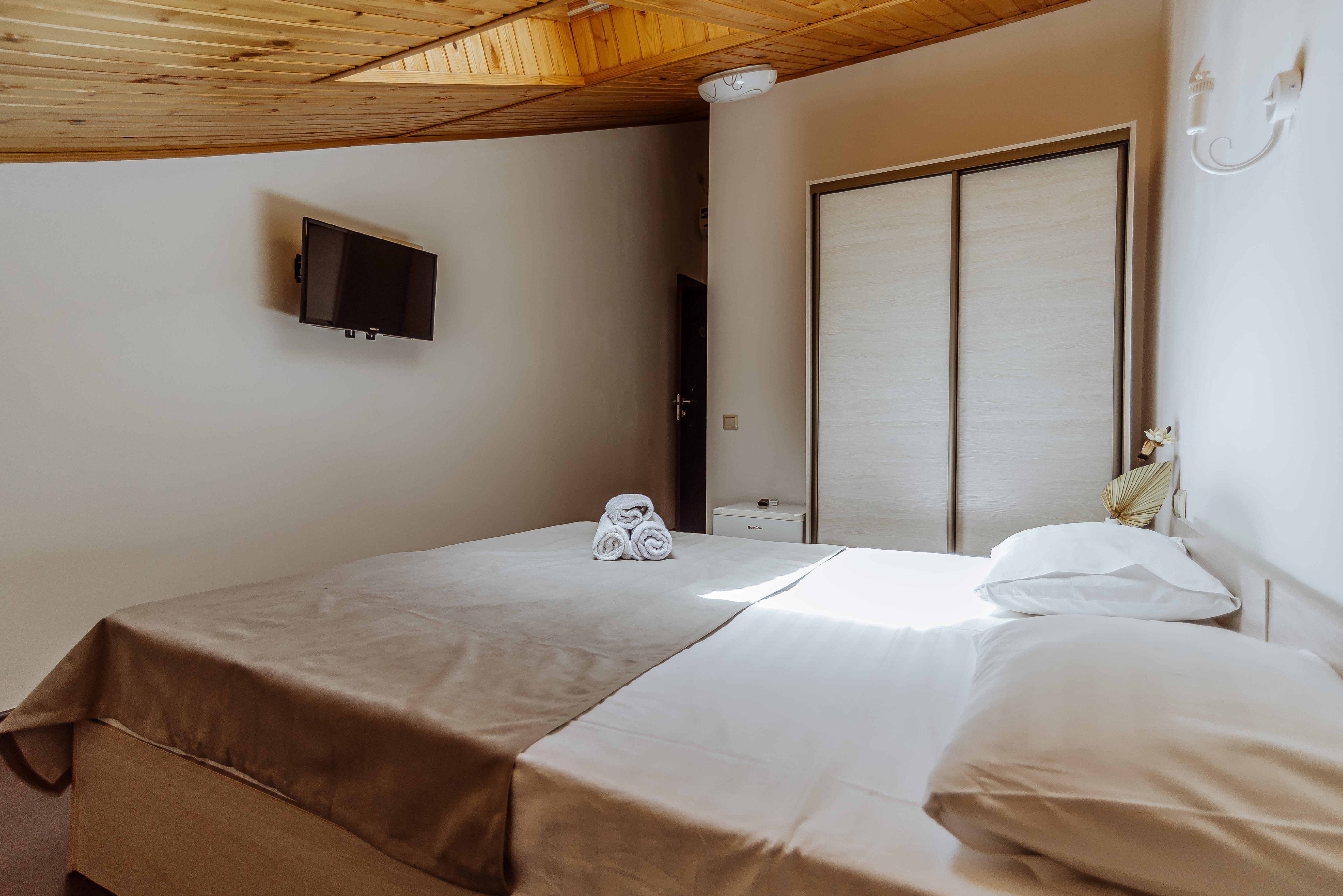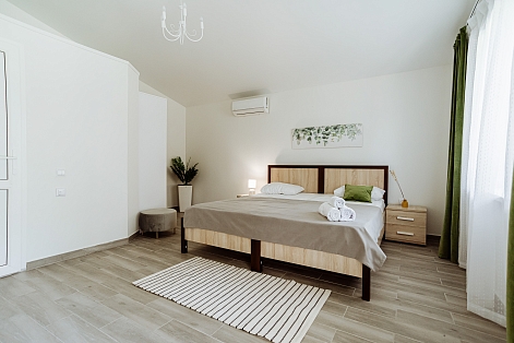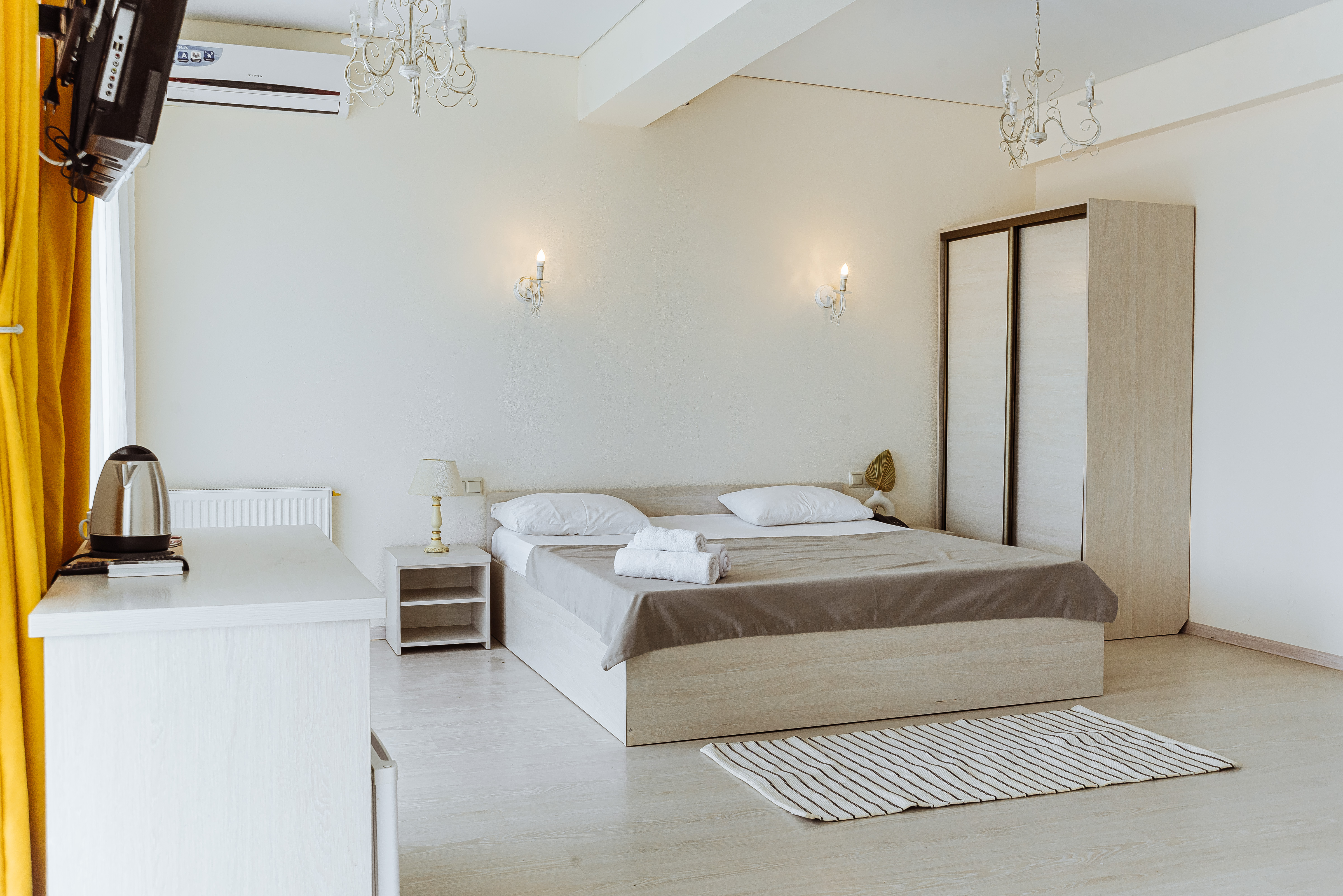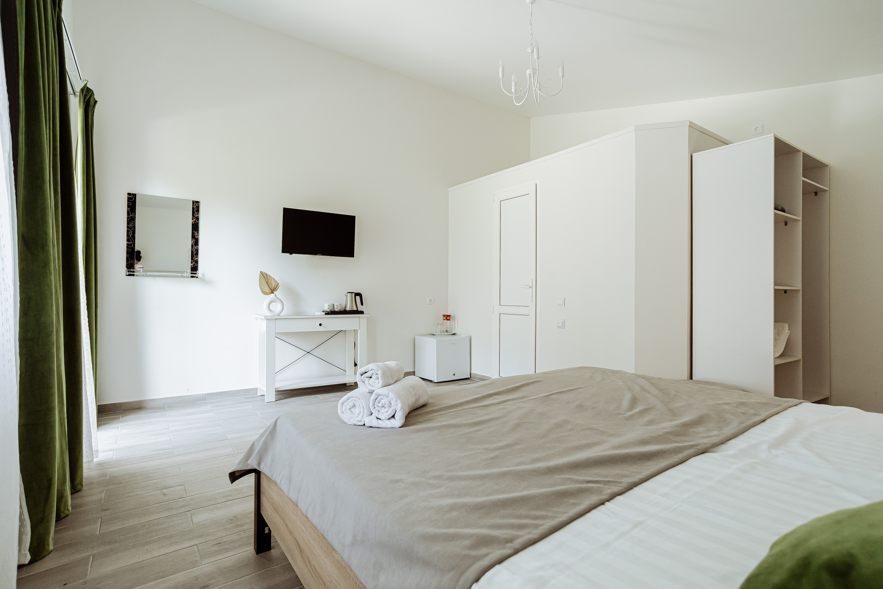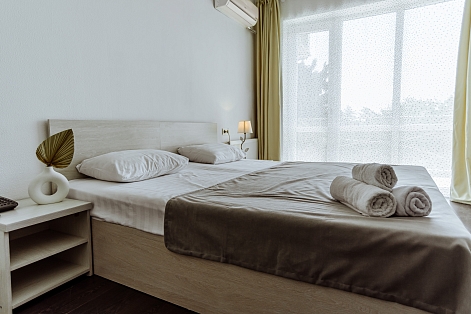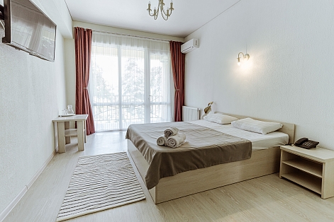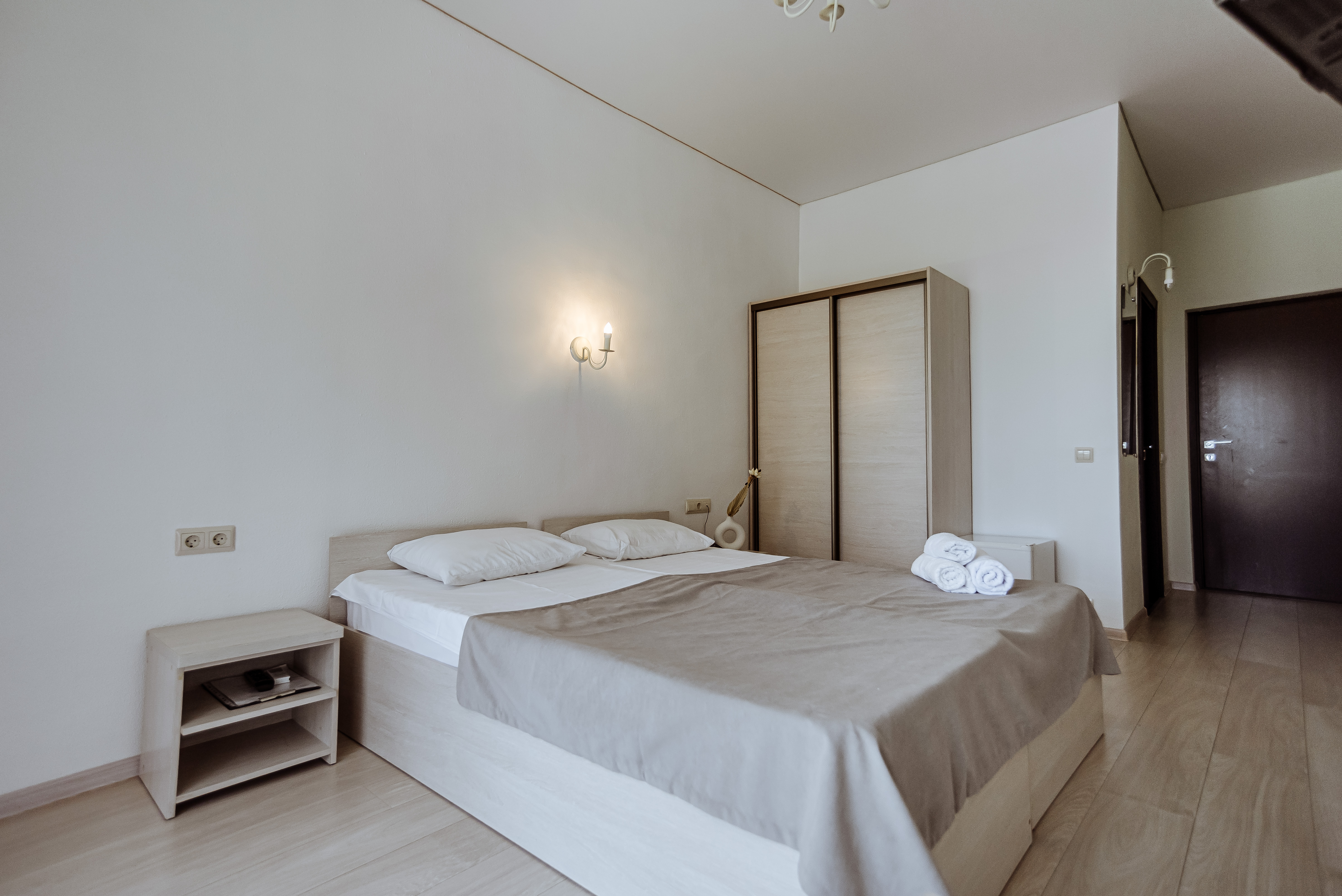 В номере: вешалка, диван раскладной, зеркало, кресло-кровать, кровать двуспальная, прикроватные тумбочки, стол, столик журнальный, шкаф, кондиционер, телевизор, телефон, холодильник, чайная станция