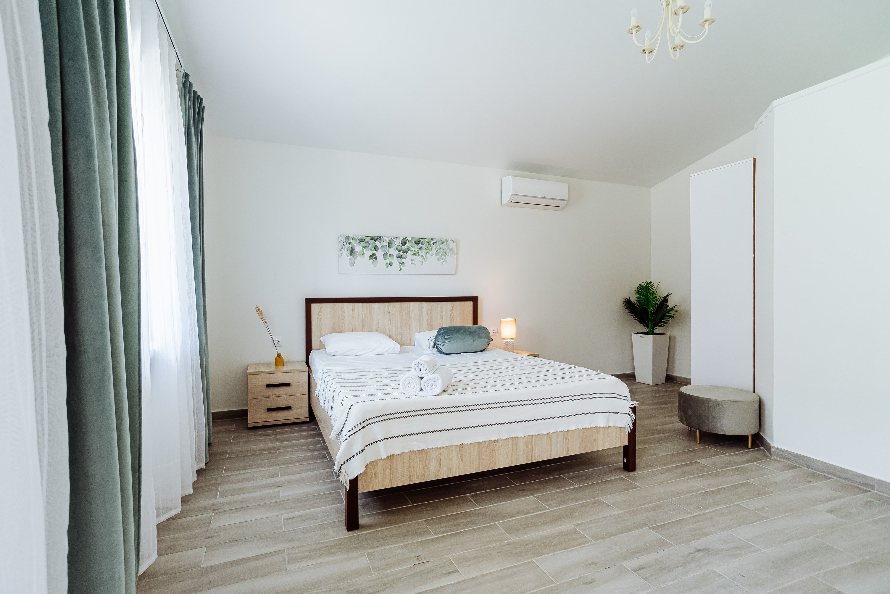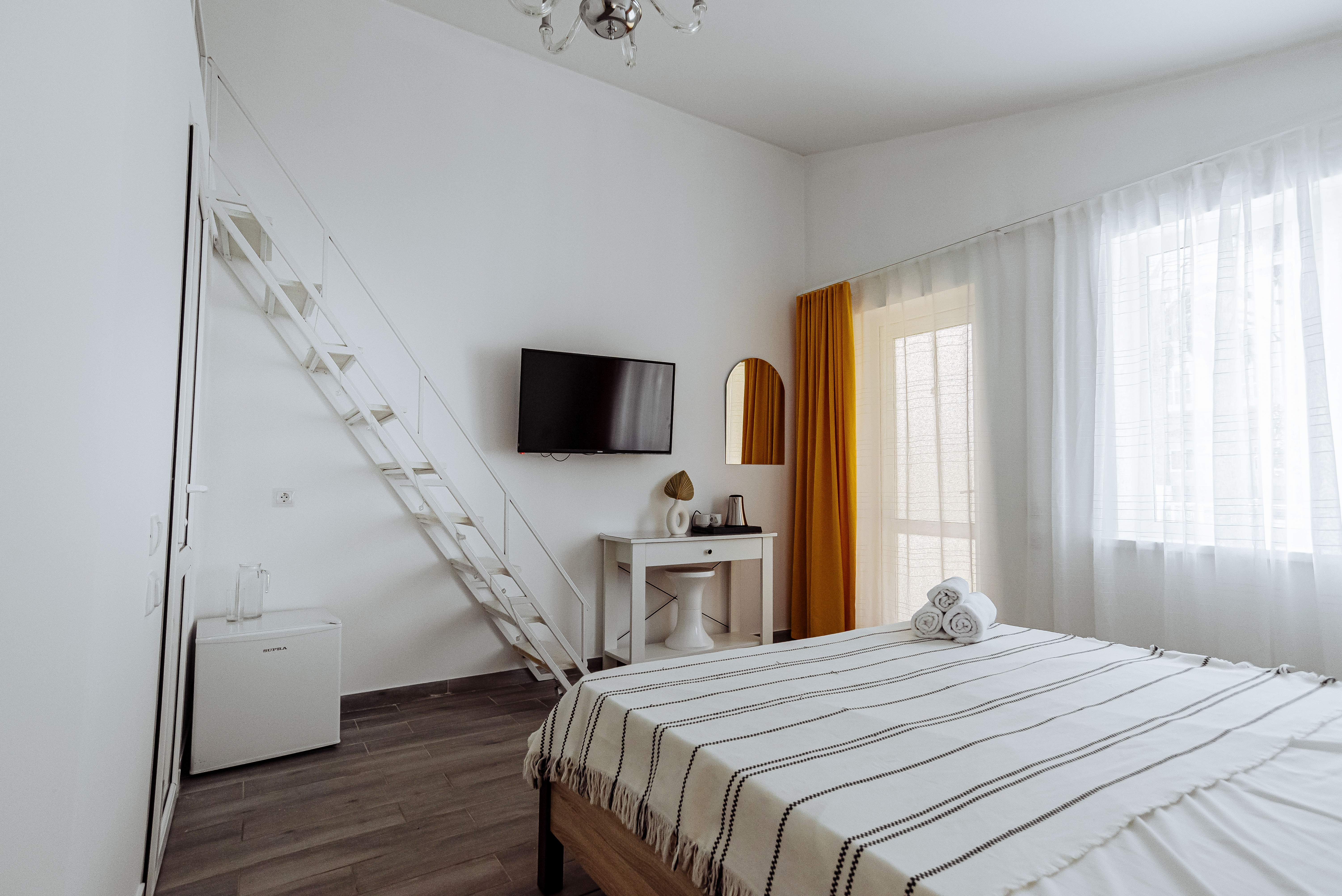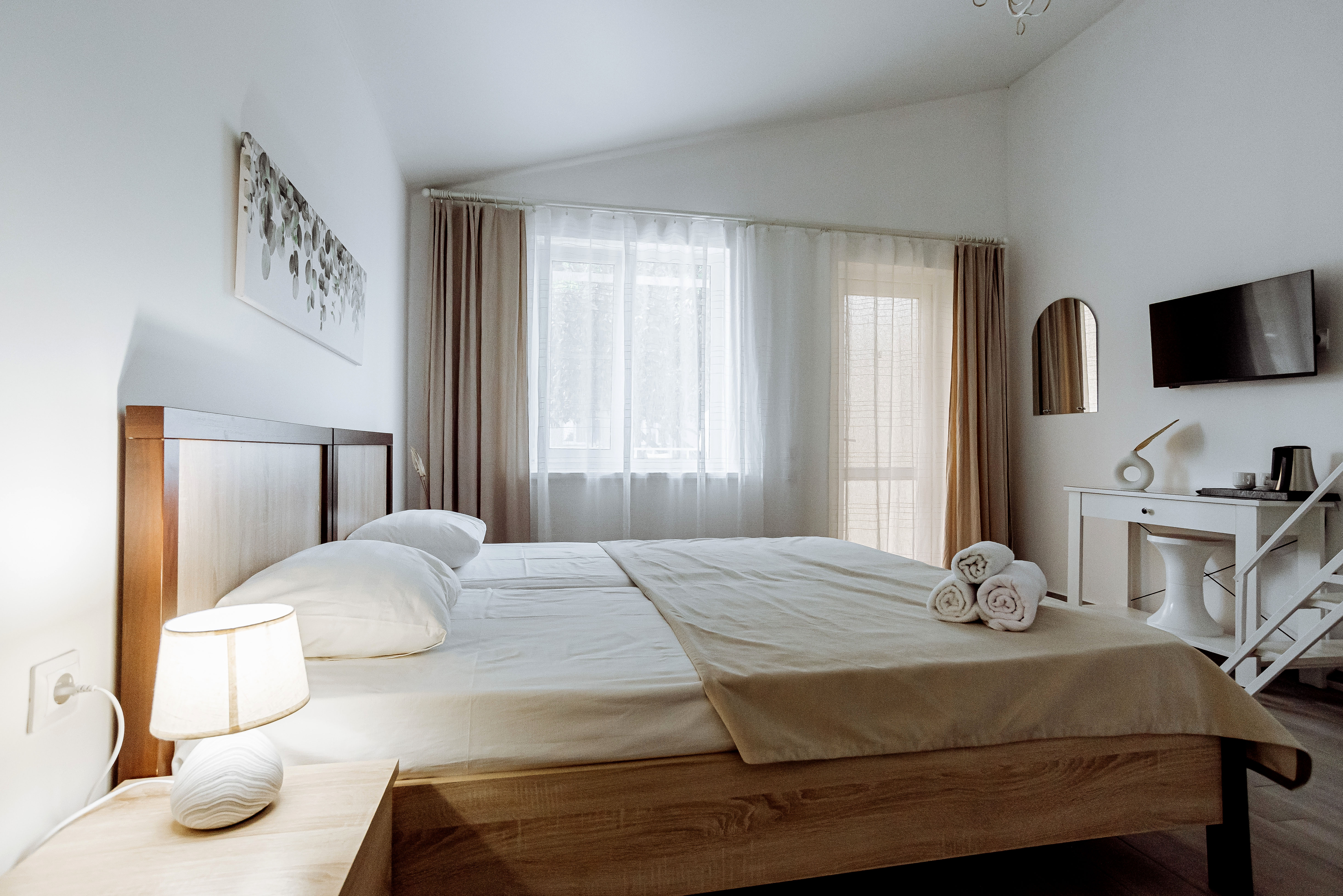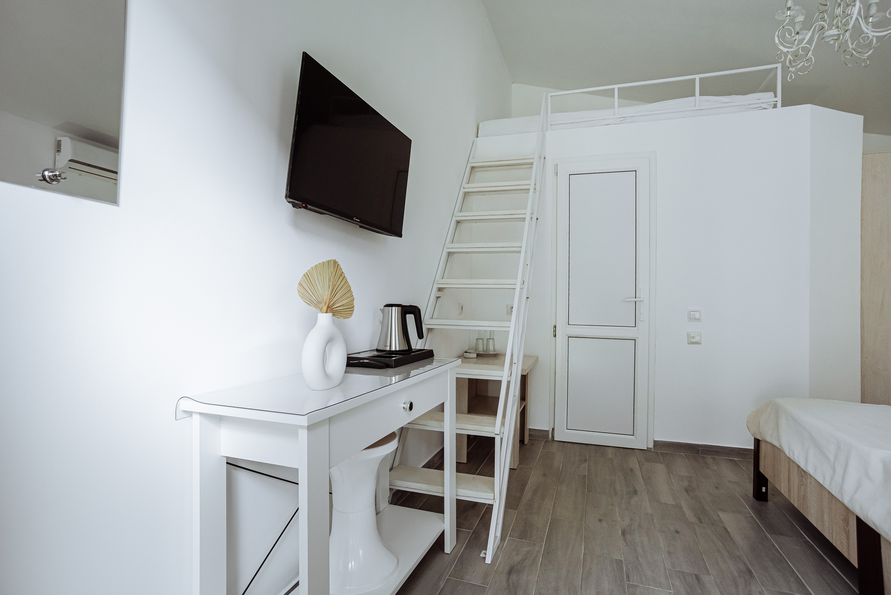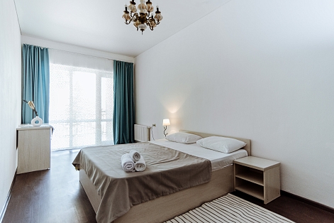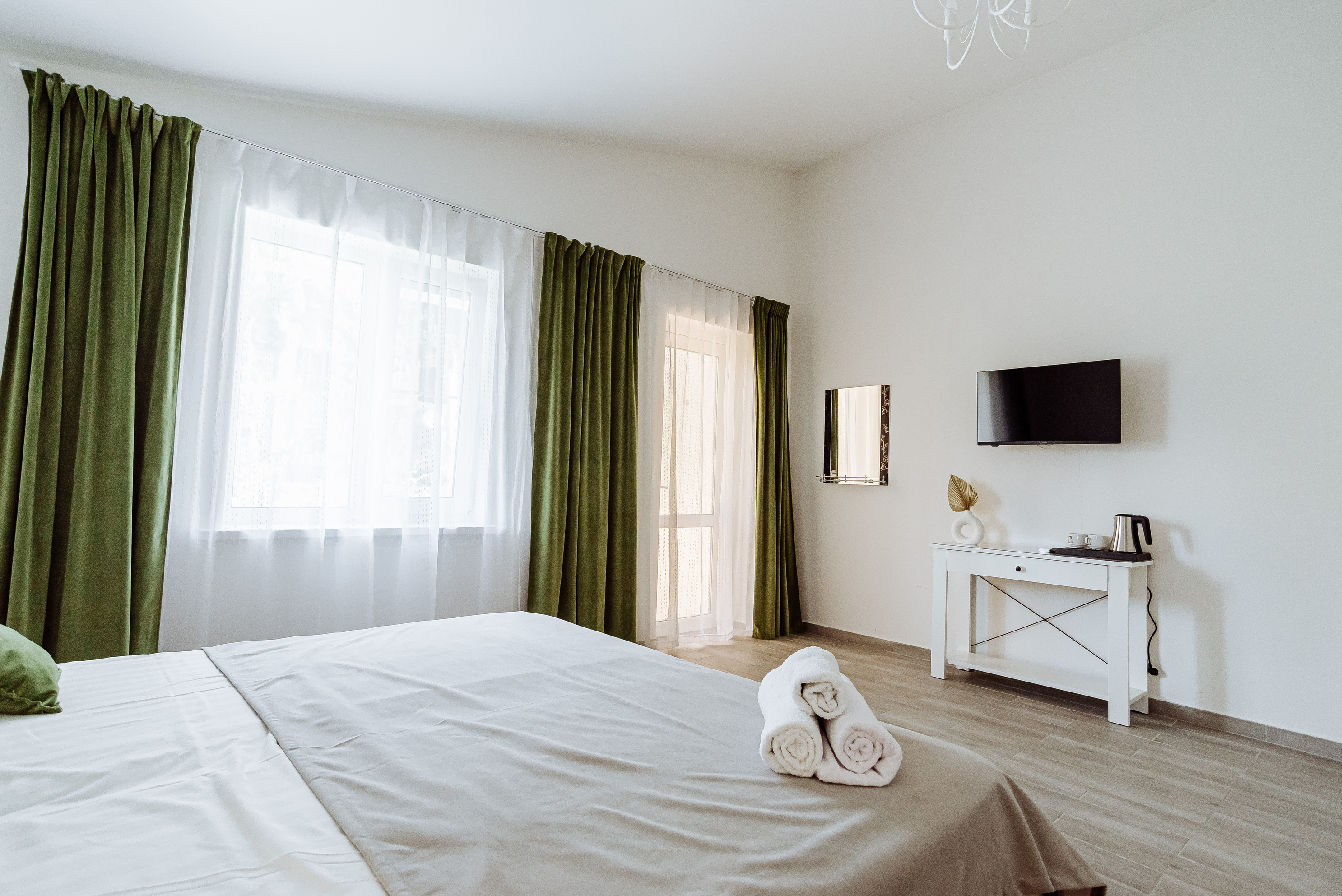 В номере: вешалка, диван раскладной, зеркало, кресло-кровать, кровать двуспальная, прикроватные тумбочки, стол, столик журнальный, шкаф, кондиционер, телевизор, телефон, холодильник, чайная станция